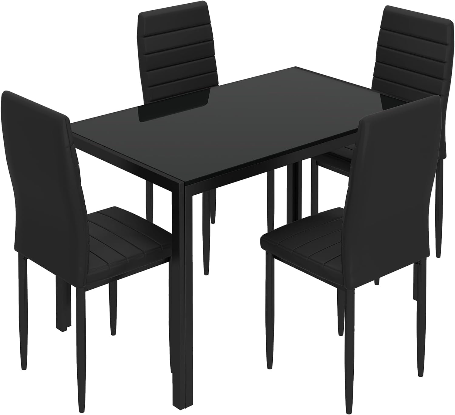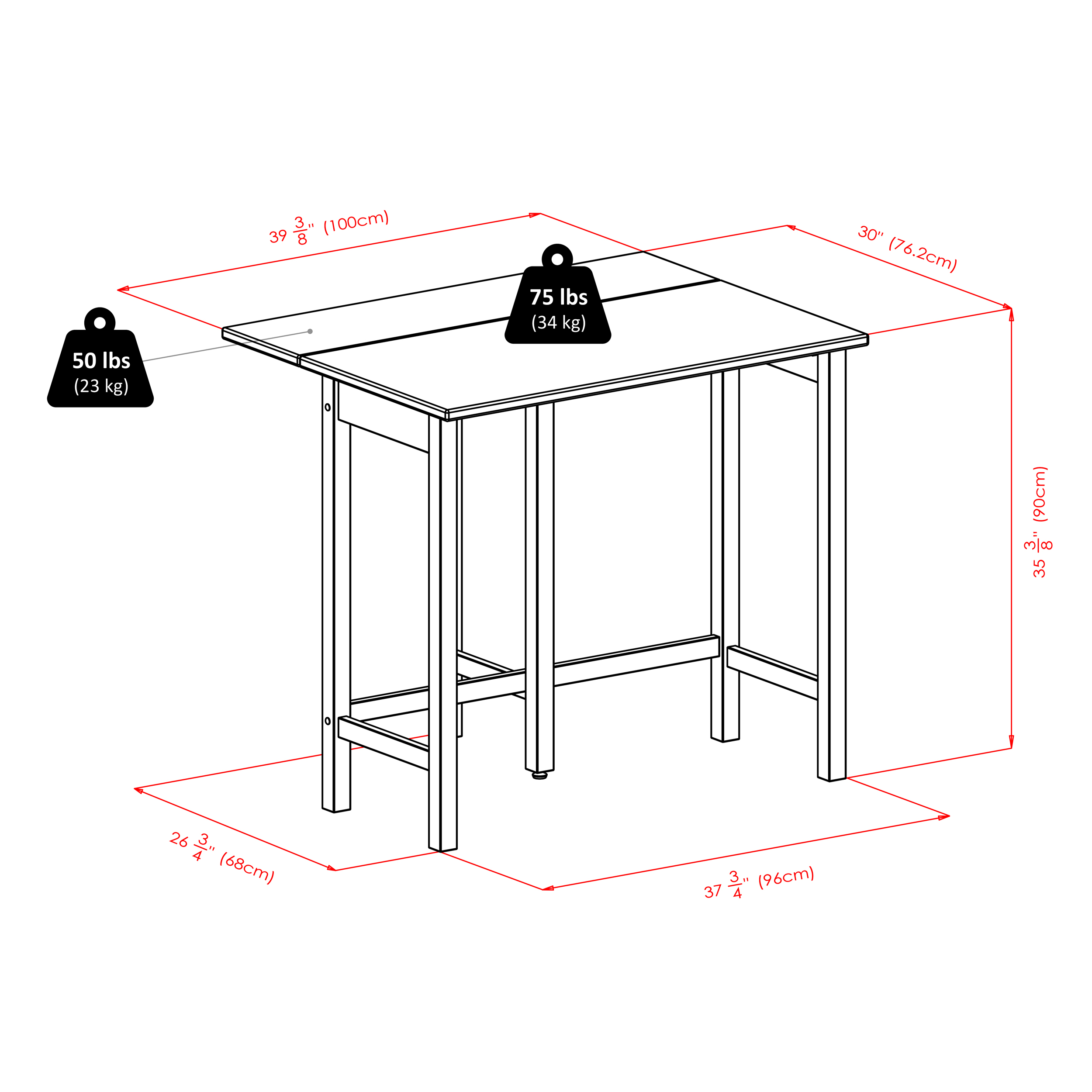 Table dimensions: 39.4L x 30W x 35.4H in. Chair dimensions: 17.5L x 14.5W x 24.8H in. Solid wood construction Antique walnut finish Rectangular tabletop with drop leaf Drop leaf dimensions: 39.4W x 10.3D in. Black faux leather seat cushions 24.8-in. seat height Some assembly required