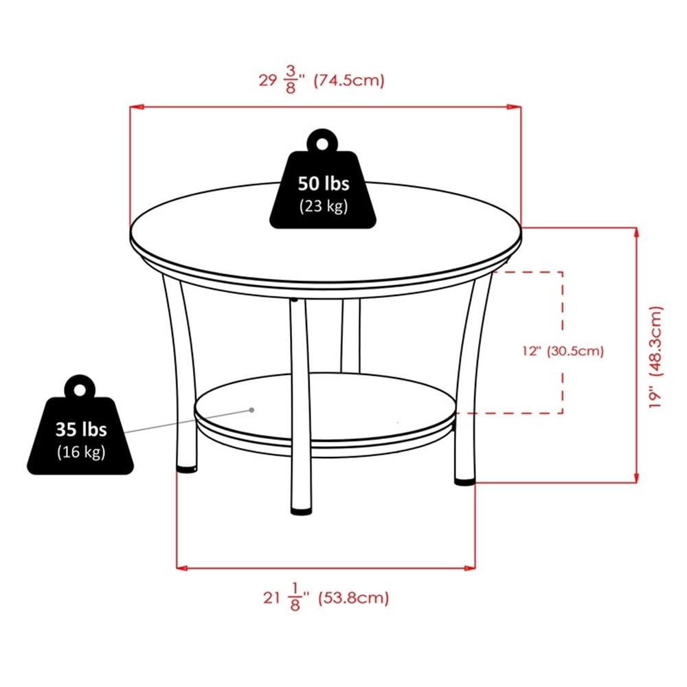 Maya Round Back Coffee Table Contemporary coffee table with black and silver color scheme Features a large round top Single shelf with a 19.6″ diameter Metal legs Polished steel frame with MDF top and shelf Ready to assemble Easy to lift, move and reposition Convenient size fits well in a wide variety of spaces Sleek, modern appearance with silver and black coffee table color scheme Large surface space on top with smaller functional shelf space below Lower area is ideal for storing magazines, newspapers and books Sturdy, stable legs offer a reliable and stable build that stands up to long-term use This contemporary coffee table design can easily serve many different purposes in your home Dimensions: 29.33″L x 29.33″W x 18.7″ Model# 93230