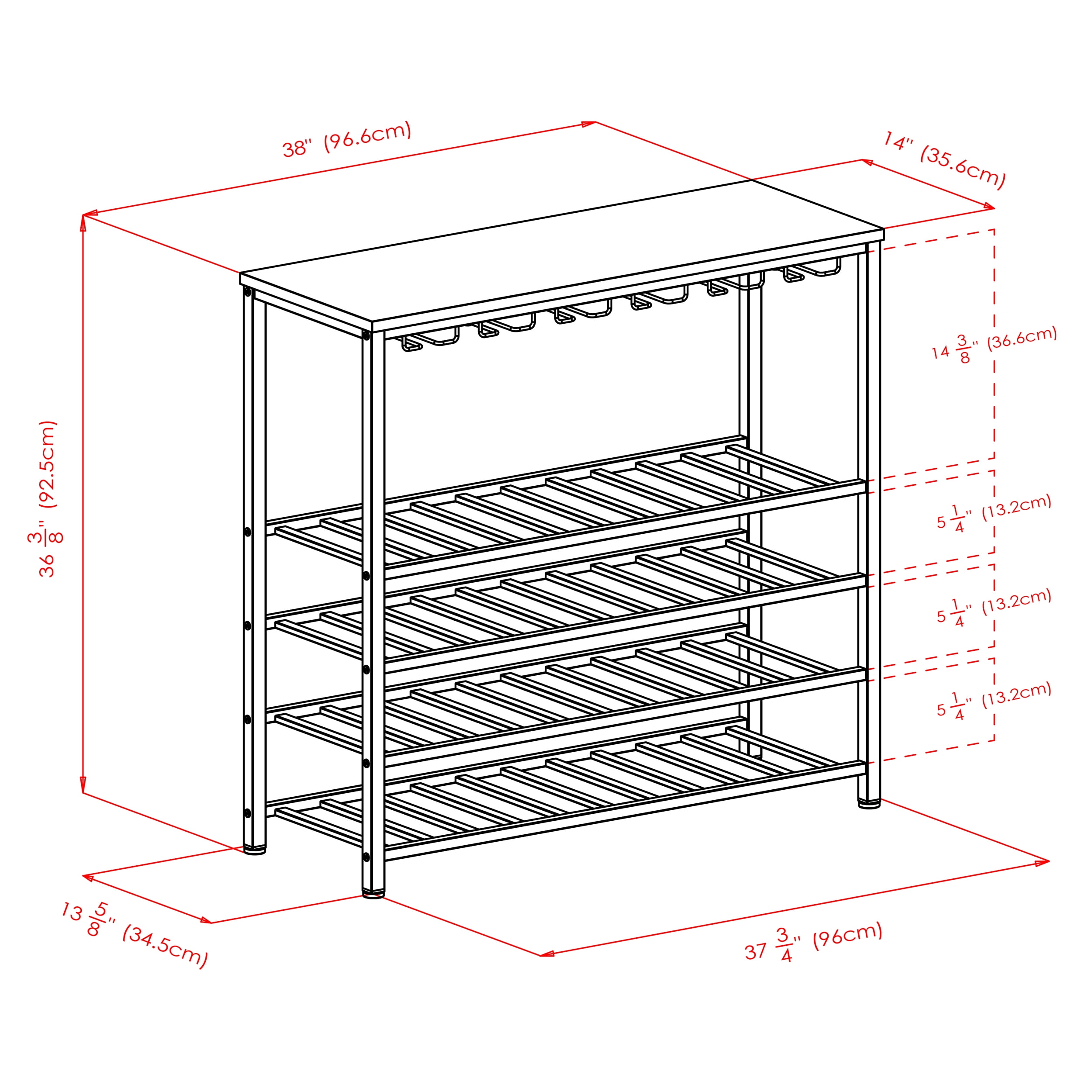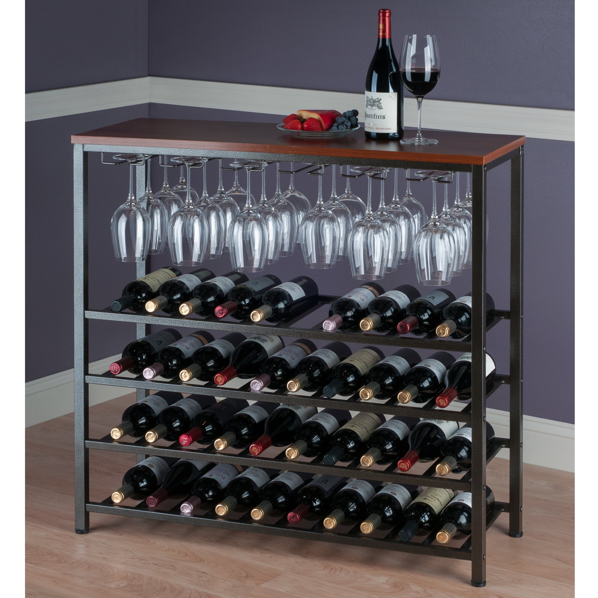 Winsome Wood Michelle Wine Display Rack, Antique Bronze & Walnut: Transitional style Overall dimensions: 38.03″W x 14.02″D x 36.42″H Walnut finish table top Antique bronze frame Stemware holder has 6 slots Holds up to 24 wine glasses (varies on diameter of glass) 4 wine bottle shelves Can store up to 40 wine bottles Metal frame Top constructed of MDF & melamine Item weight: 35.6 lbs Arrives in 1 box Box dimensions: 17.6″W x 41.75″L x 7.8″H Shipping weight: 41.95 lbs Assembly is required Replacement parts within 60 days from date of purchase Model #87438