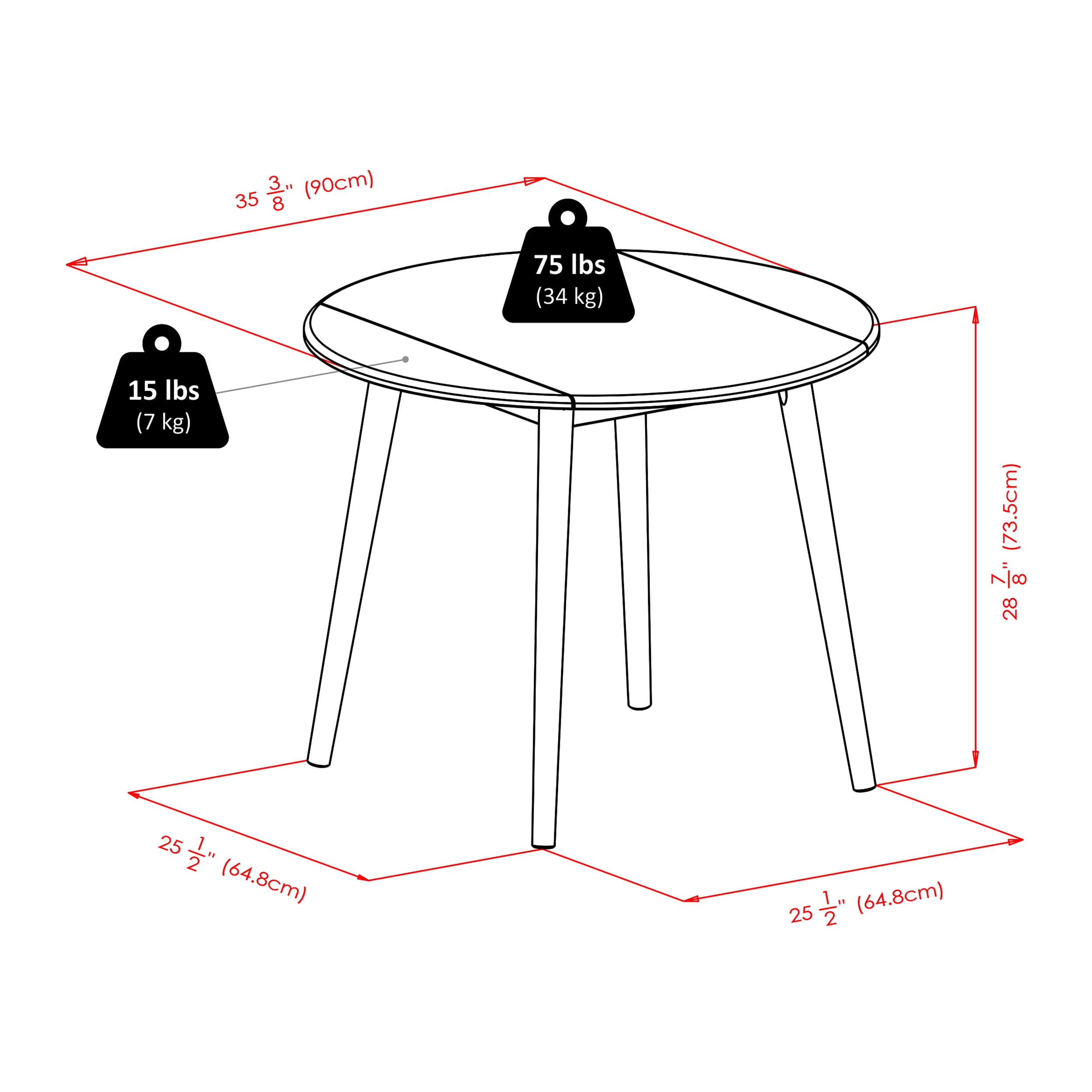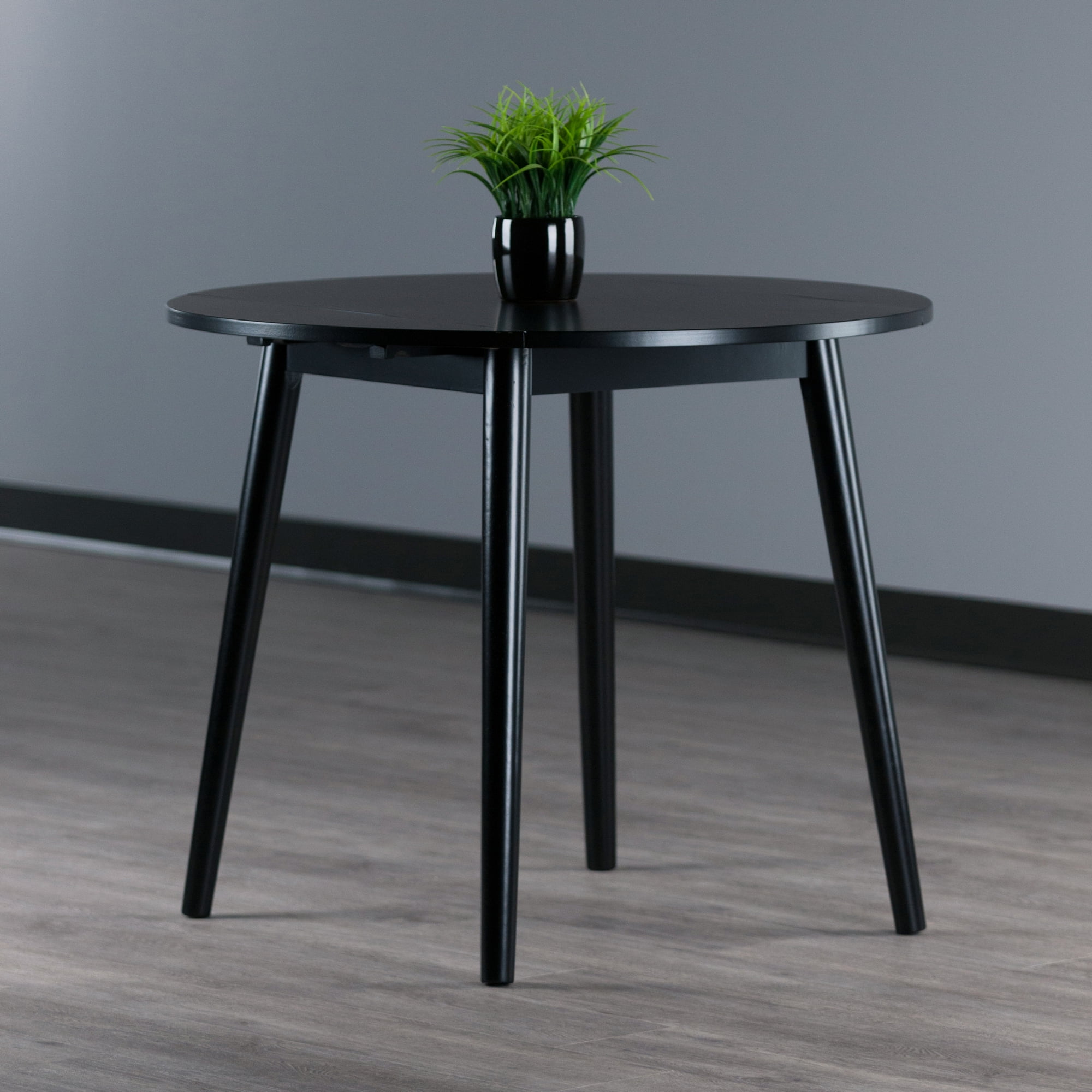 The Winsome Wood Moreno Round Drop Leaf Table offers a mid-century modern appeal and simplicity to apartment living and smaller dining areas. It features two drop leaves that, when open, create a 36″ round table that will seat up to four for a casual Sunday brunch or an intimate dinner. Generous height clearance that allows for dining chairs of any style to fit. When space is limited, lower one or both leaves to create the size that best suits your needs. In between meals, fold the leaves down to convert the table into a console on which to keep serve ware or a vase of flowers. Slightly tapered, angled legs give the table a graceful silhouette, while the solid and sturdy composite wood construction offers long-lasting durability. The smooth black finish works well in classic or contemporary settings. Conveniently packed and shipped in 1 box, that includes the hardware necessary for assembling.