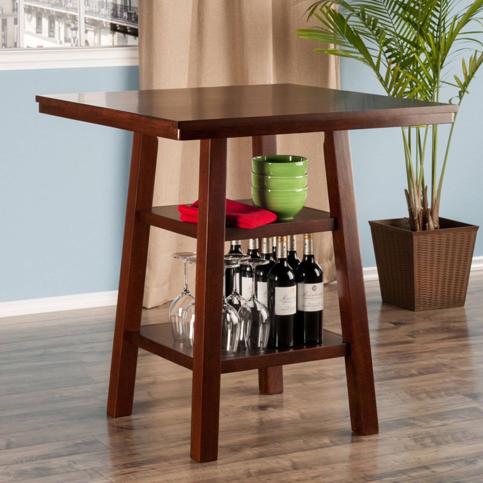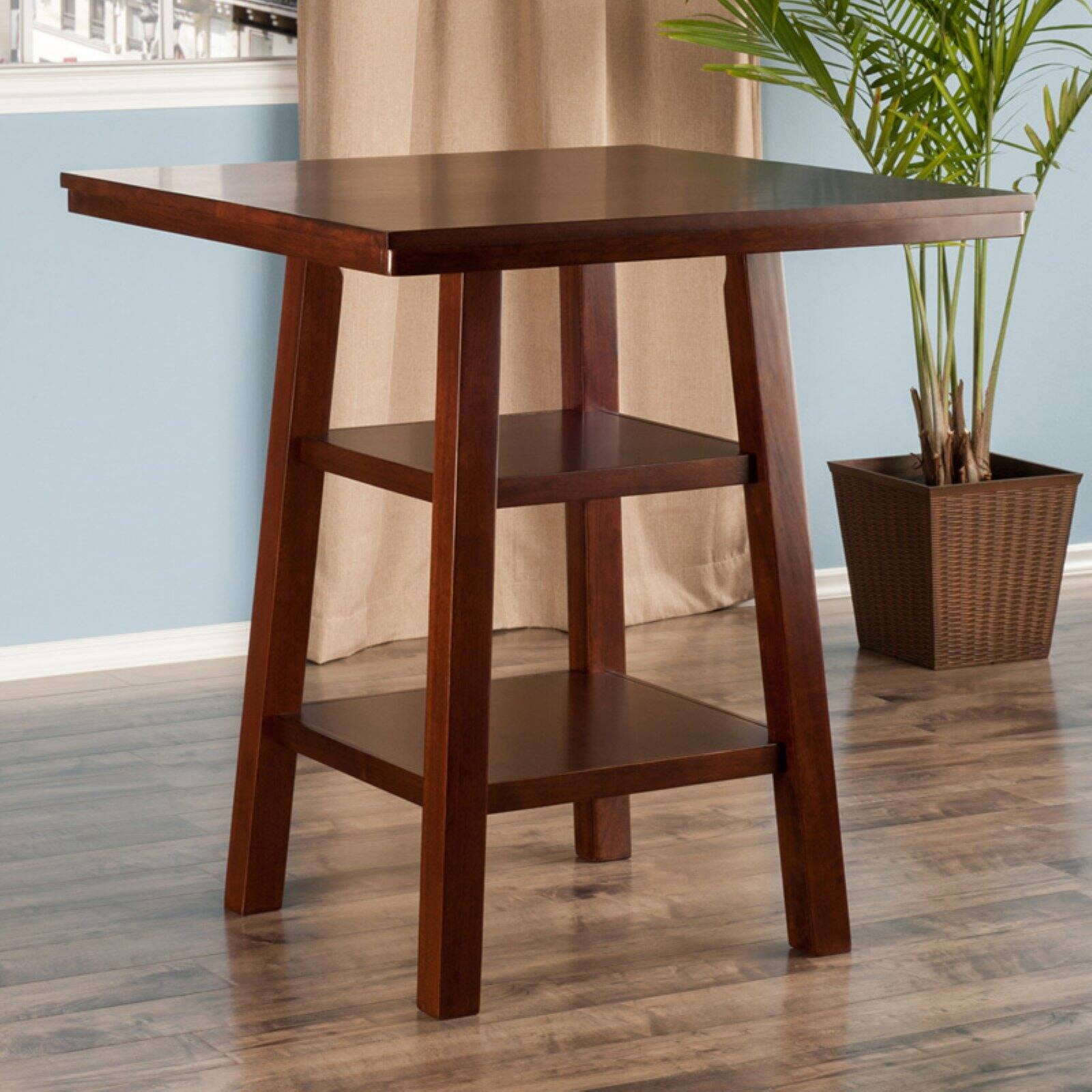 Dimensions: 33.86L x 33.86W x 36.06H in. Crafted from solid and engineered wood Walnut finish Square top and 2 open shelves Seats 4 Some assembly required