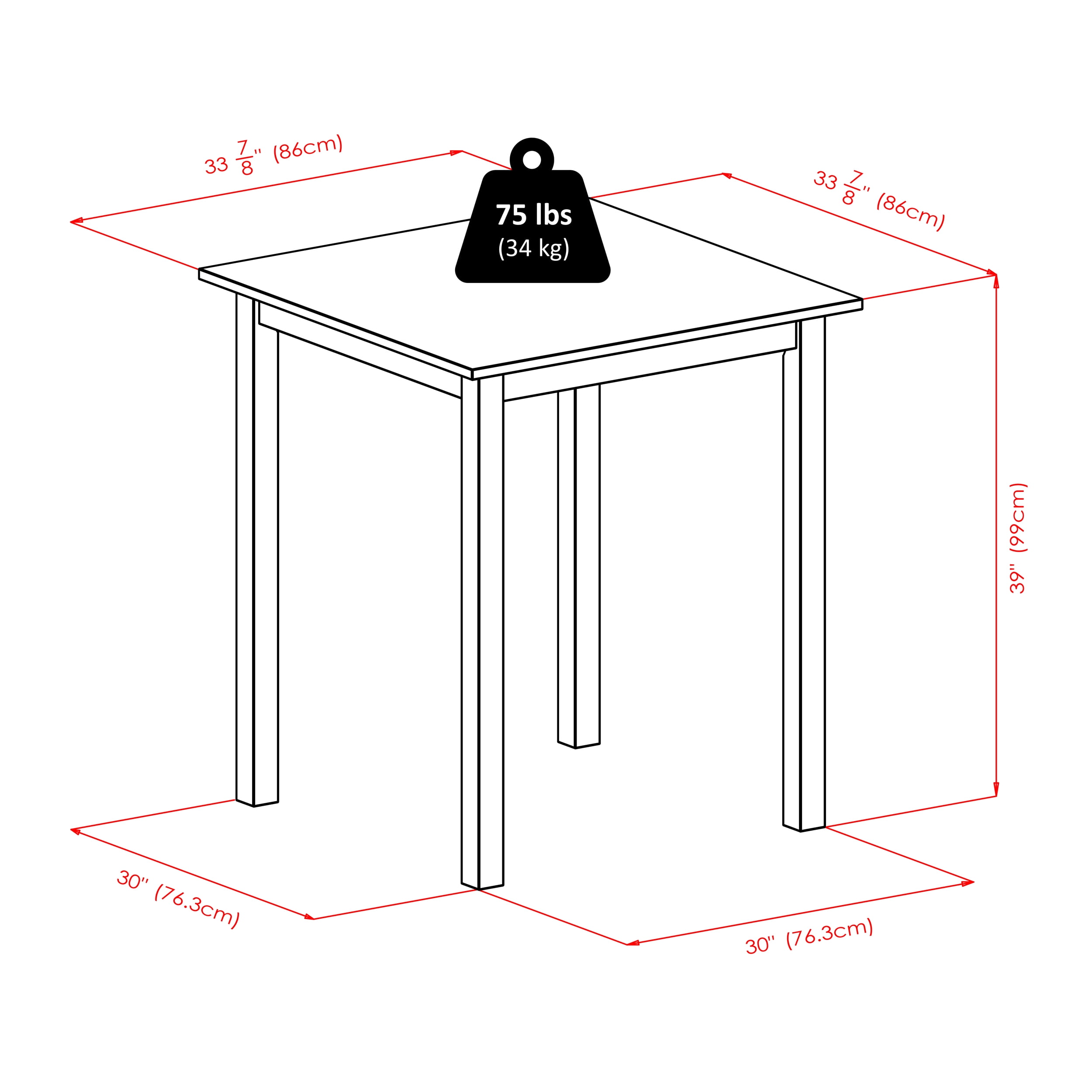 Square Table assembled size is 33.86″W x 33.86″D x 38.98″H. Includes 2 Ladder Bar Stool 16.58″W x 19.35″D x 42.46″H; Made from solid wood in warm walnut finish. Simple Assembly Required. Seat height is 30.12″ Seat Dim 16.34″ x 15.55″.