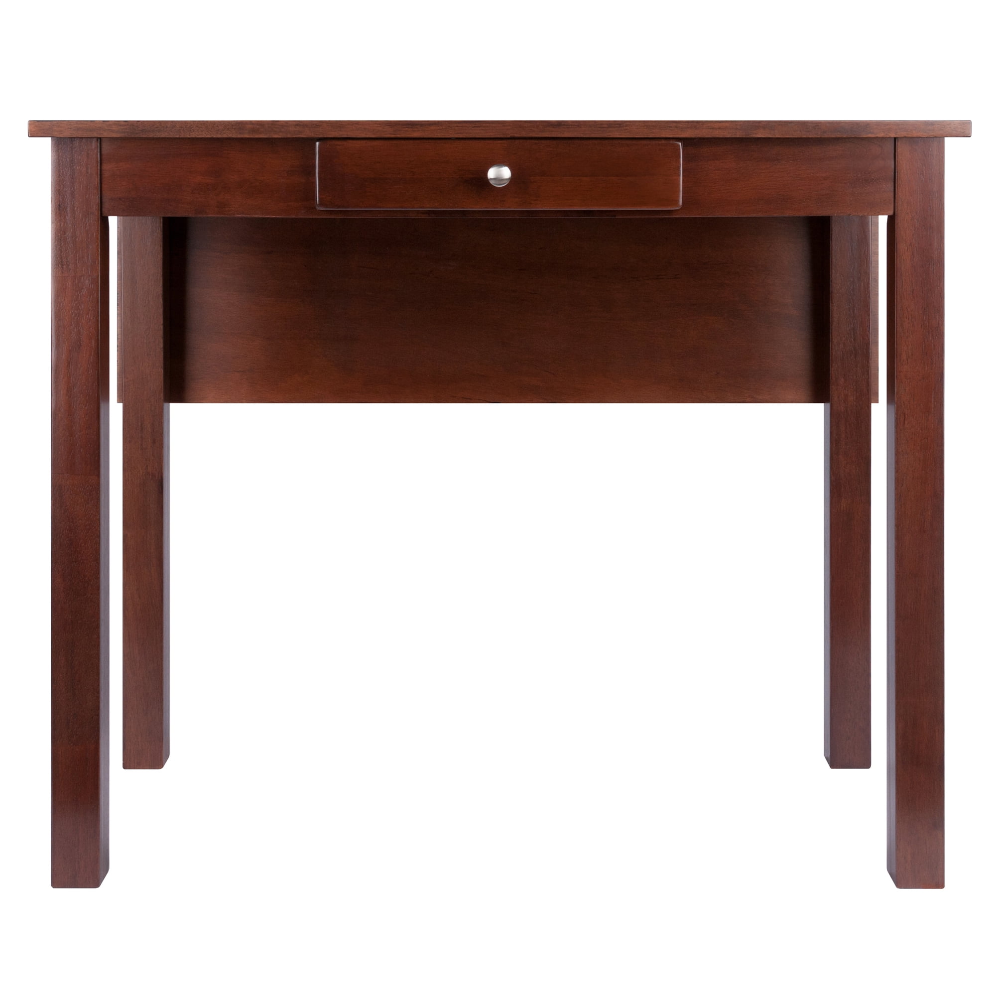 Take home a blend of grace and simplicity with the Winsome Wood Perrone High Table Set, an indispensable addition to any home. Offering exceptional versatility and making this an excellent space saving choice for a studio apartment or small spaces where a multipurpose table is ideal. Needing more surface space, this unique design offers the utmost in stability for expanding the table size. Pull out the apron, and the legs support the drop leaf when open, slide the apron back when the drop leaf is folded. With the leaf extended, the table seats four comfortably but for daily living keep the drop leaf down and conserve valuable floor space. A center drawer with a satin nickel finish knob keeps pens, pads, and other smaller items within easy reach. This table set is paired with two classically designed stools that are a perfect complement to the table. The 24″ counter stools have a unique saddle-shaped seat, which is extra-long, rectangular in shape, and curved in the middle for true comfort. Featuring a crossbar on all four sides, for stability and comfort making these stools not only attractive but also very functional. Enjoy this set for casual dining or use the table as a console or convenient place to work on your laptop. Constructed of sturdy solid wood for long lasting durability and finished in a rich walnut, this set can be incorporated effortlessly into nearly any existing decor. Ships in 3 boxes that include the hardware necessary for assembling. Replacement part request can be submitted directly to the manufacturer within 60 days from date of purchase. Overall table dimensions: 29.1″H x 40″W x 34.8″D (with leaf extended) 29.1″H x 40″W x 21.6″D (with leaf closed) – leaf dimension is 40″W x 14″D Inside drawer dimensions: 12.1″W x 8.9″D x 2″H Clearance underneath table (Front): 24.8″H x 34.1″W Clearance underneath table (Side): 24.8″H x 14.2″W Stool assembled size is 17.4″W x 14.47″D x 24″H Seat Dimension is 17.5″W x 9″D – Static Weight limit 220 Lbs. Assembly required Ships in 3 boxes