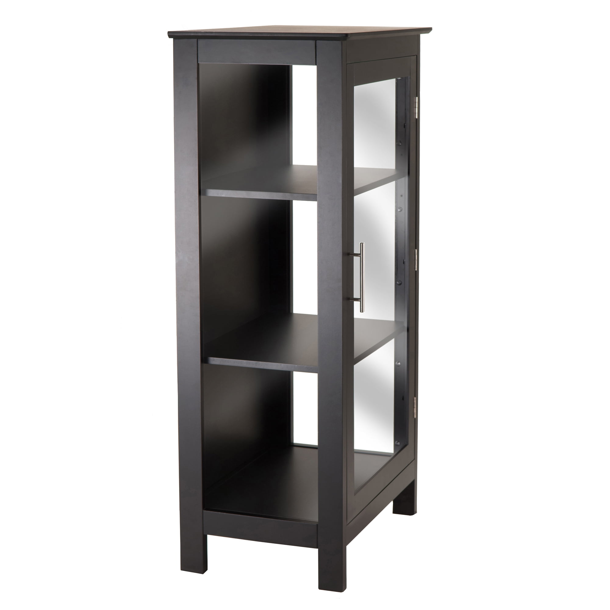 The Winsome Wood Poppy Display Cabinet is perfect for use all over the home for storage and display with modern style. Finished in a solid black, sleek with clean, angular lines that will allow this cabinet to easily mesh with most decors. A contemporary design adorned with a satin finish metal handle for added style and provides an easy to open door. Featuring tempered glass on the door and both sides, which is great for viewing. A great addition for the living room, office or kitchen. With three shelves perfect for displaying family portraits, heirlooms, porcelain figurines, or kids? trophies. Top shelf is adjustable allowing for extra height on the top or middle shelf, depending on how you decide to place the top shelf. This cabinet is constructed of sturdy, durable composite wood. Conveniently ships in one box that includes the hardware necessary for assembling. Replacement part requests can be submitted directly to the manufacturer within 60 days from date of purchase.