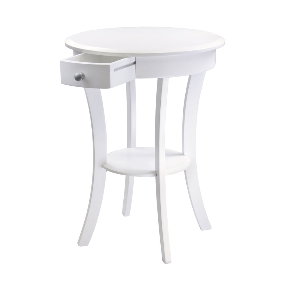 Winsome Wood Sasha Round Accent Table, White: Traditional style Sasha collection Accent table with one drawer and shelf Overall dimensions: 20″ W x 20″ D x 27″ H White finish Static weight capacity: 50 lbs Drawer (interior) dimensions: 5.75″ W x 7.78″ D x 2.32″ H Shelf diameter: 11.81″ Shelf clearance: 12.4″ (measured from under drawer) Item weight: 13.45 lbs Constructed of solid and composite wood Arrives in 1 box Box dimensions: 27″ L x 22.75″ W x 6.75″ H Shipping weight: 17 lbs Assembly is required Model #20227