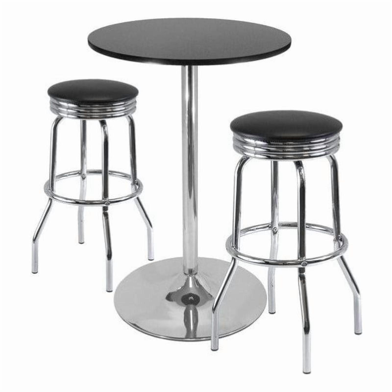 The Winsome Trading Summit 3 Piece Pub Table Set – Black is designed to bring retro style to your home bar. Included in the set is a pub table and two swiveling stools full of retro charm. The table has a round, black engineered wood top on a polished chrome pedestal-style base. The stools feature swiveling, black faux leather seats, ribbed polished chrome bases, and built-in footrest rings.