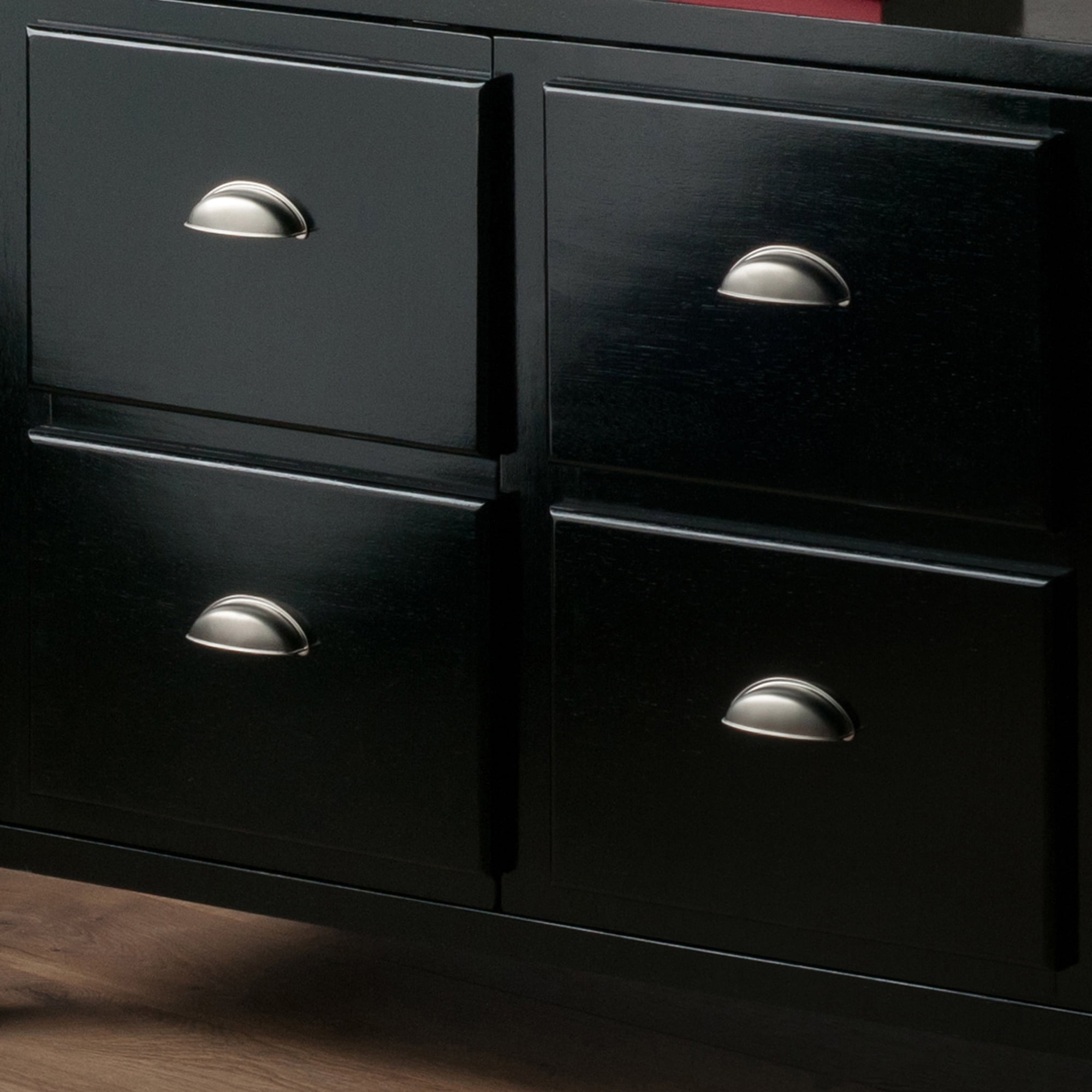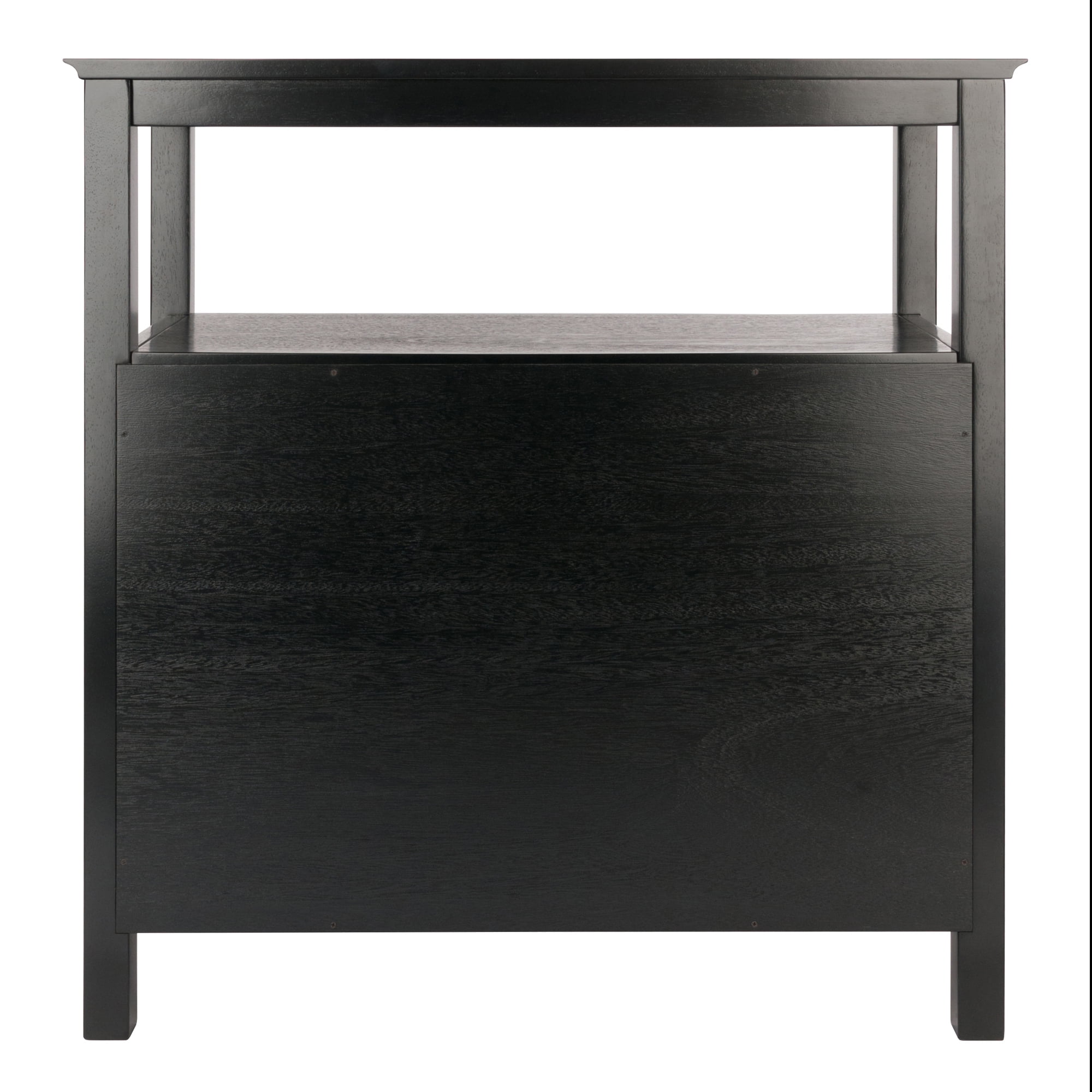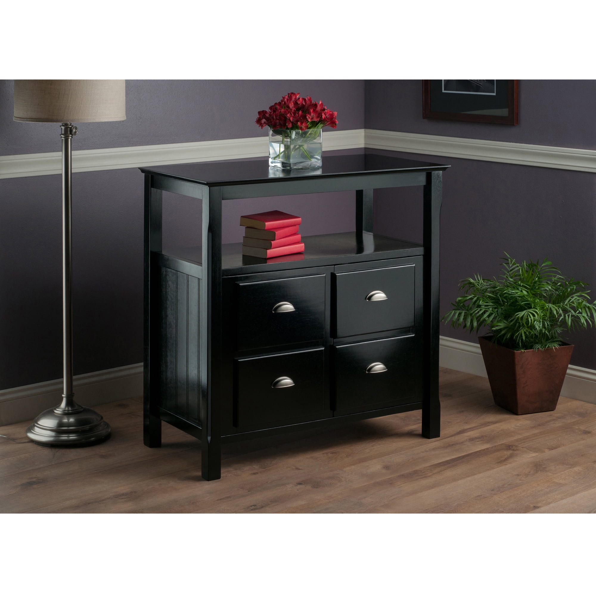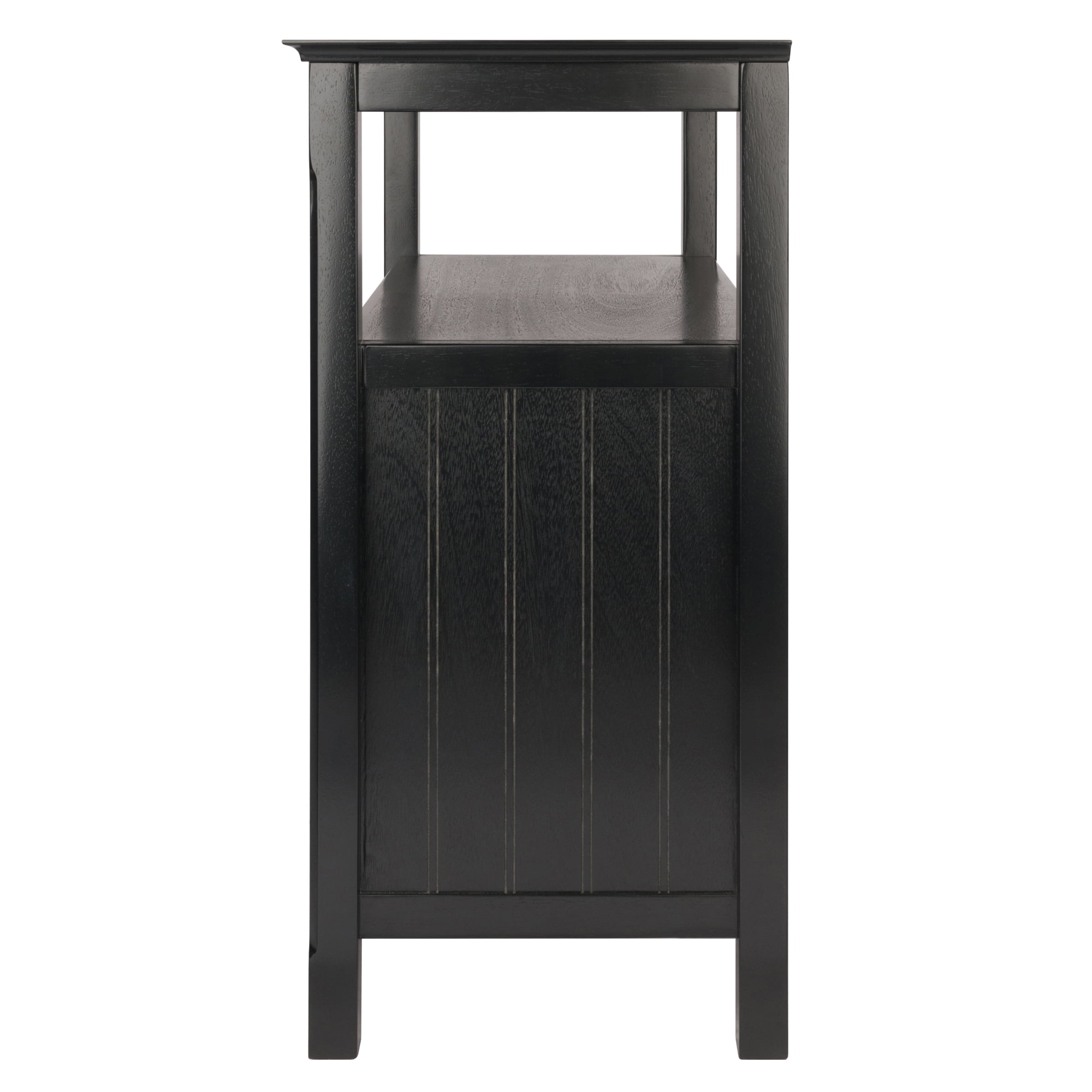 The Winsome Wood Timber Buffet Cabinet is a classic, versatile piece of furniture that provides accentual contemporary storage to your home or office with a nice clean design. Its simple black finish makes it easy to compliment almost any decor all while the brushed aluminum drawer pull offers a striking contrast of elegance. The headboard-inspired side panels and sculpted square legs help accentuate the look. Featuring an open shelf compartment and two doors with a shelf within for plenty of storage. So, whether it’s in your bedroom for clothes and towels, or in your home office for binders and books, you’ll have ample storage to keep organized. Complete your living area with the additional items from the Winsome Timber collection for a unified space (each sold separately). Conveniently packed and shipped in 1 box and ready to assemble.