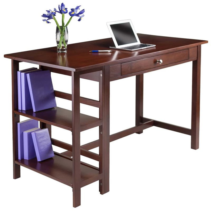 A unique style, exhibiting functionality paired with modernity will allow the Winsome Wood Velda Home Office Writing Desk to transform your home office into an inviting place to work. The large desktop surface provides for maximized workspace and the design creates a look that is both attractive and simple. Features a drawer to store office or writing accessories organized and out of sight. Two side shelves complete this desk, and can accommodate binder’s folders or books. Ample clearance underneath table apron to ground, 25.51”H, allowing for any standard chair to be used while at the desk. Constructed from solid and composite wood in rich walnut finish that can be incorporated effortlessly to any home. This writing desk conveniently ships out in 1 box, with the hardware necessary for assembly included.
