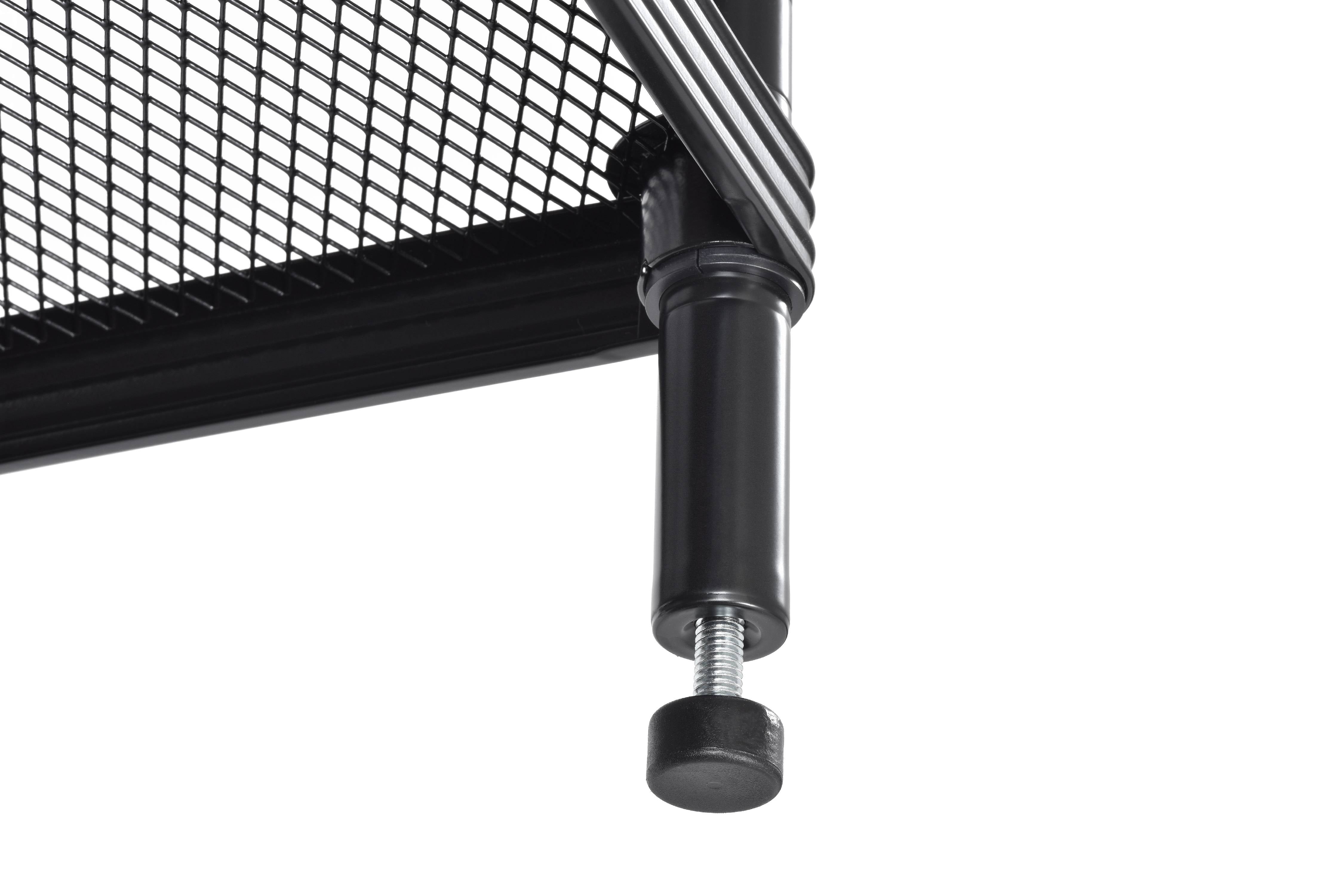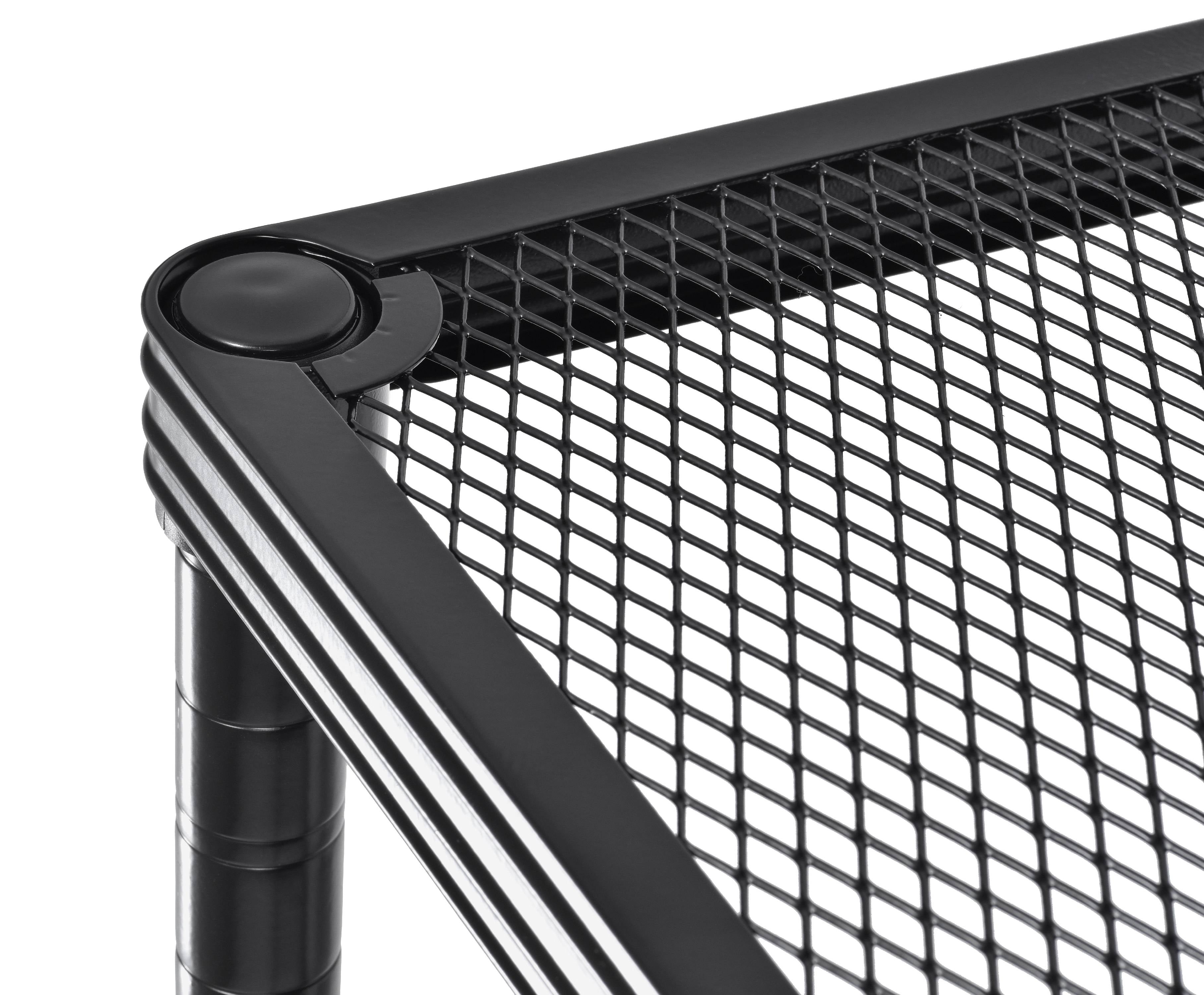 Mesh wire shelving unit has three adjustable shelves and is made of black-finished steel for strength, durability, and to resist dirt buildup and corrosion Posts come with adjustable levelers to facilitate use on uneven surfaces Has an 200 lb. per shelf capacity, evenly distributed Shelves adjust in 1″ increments