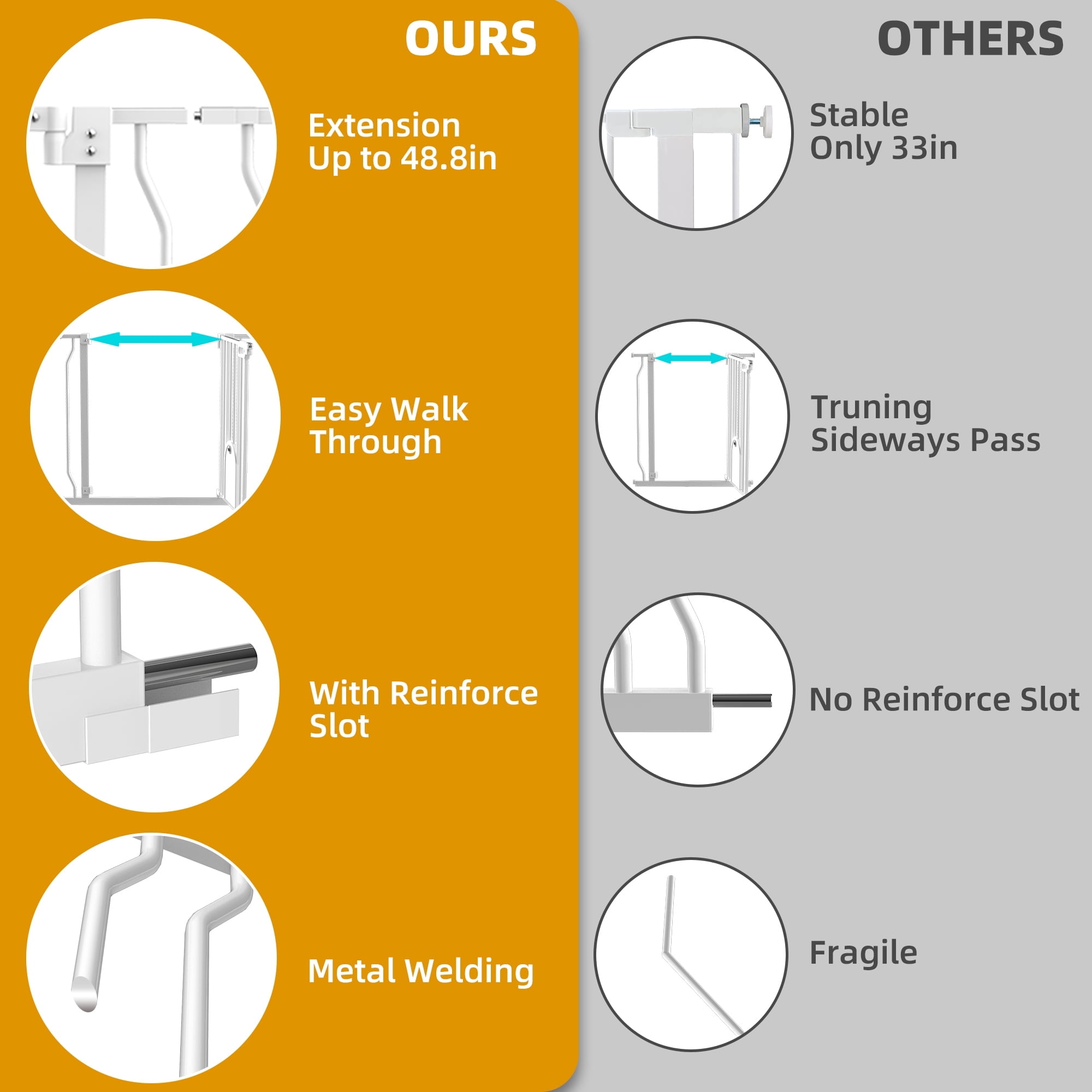 The baby gate includes 2 extensions, the width can be adjusted from 29.5-48.8inch, the widened passage easily passes through adults, strollers, dogs. 2.4in wide bars gap, prevents your pets from squeezing through. Perfect for doorways, hallways, kitchens and stairs. The dog gates can be swung in both directions, even if you are holding a baby, you can open it with one hand. You don’t have to worry about forgetting to lock the safety door. It will automatically close when it is less than 90°, and it will stay open when it is greater than 90°. You can choose pressure installation or screw installation. The pressure-installed baby metal gate does not require any tools, will not damage the wall. We have included screws to help secure it. Our pressure mounted design provides easy setup and flexibility throughout the home. Our stair gate features a secure pull and lift system along with a robust bottom lock, adults can open it easily but babies can’t open it easily, for 6-24 months kids. More safety with a double-lock system, push the button, and then lift it to open. 2 metal reinforcements are respectively spot-welded on the extension of the door rail, the high-quality metal material is more durable. Baby Gate can withstand impacts up to 150-210 lbs, such as Husky, Alaskan, etc. Never be afraid of pets jumping over a door. You don’t need to worry about this gate being knocked down and hurting your kids. 1* Main Gate 1* 4.7in Extension 1* 9.4in Extension 4* Sticky Pad 4* Tension Bolt 4* Wall Cup Several expansion screws and screws Material: Metal Baby Gate Height: 30in Baby Gate Width: 29.5in Extended to 48.8in Withstand Impacts: up to 150-210 lbs Closure Type: Latch Mounting Type: Pressure Mounted/Hardware Mounted Target Species: 6-24 Months Babies, Dogs, Pet Special Feature: Auto-Close, Double-Lock, Adjustable Frame Width 1. Please measure the width of the installation location before purchasing. 2. Before installation, please do not cut off the cable tie at the door lock position. 3. Before installation, it is normal that the two sides of the door lock cannot fit together. 4. During the installation process, the door lock fits closely with the pressure on both sides. 5. Please keep the door rail and the ground vertical, the firm effect will be the best.