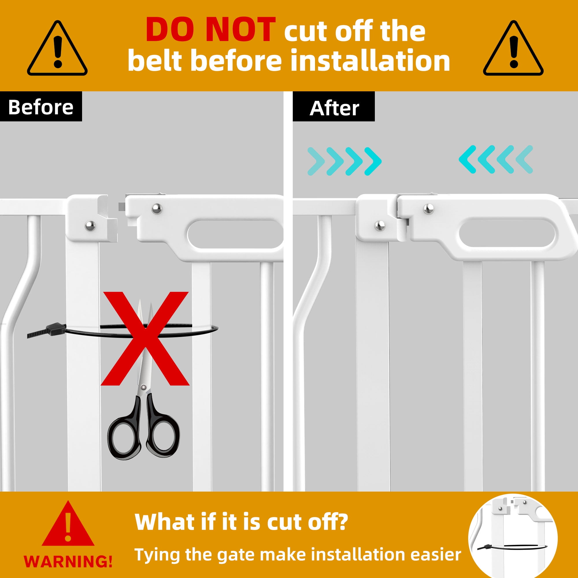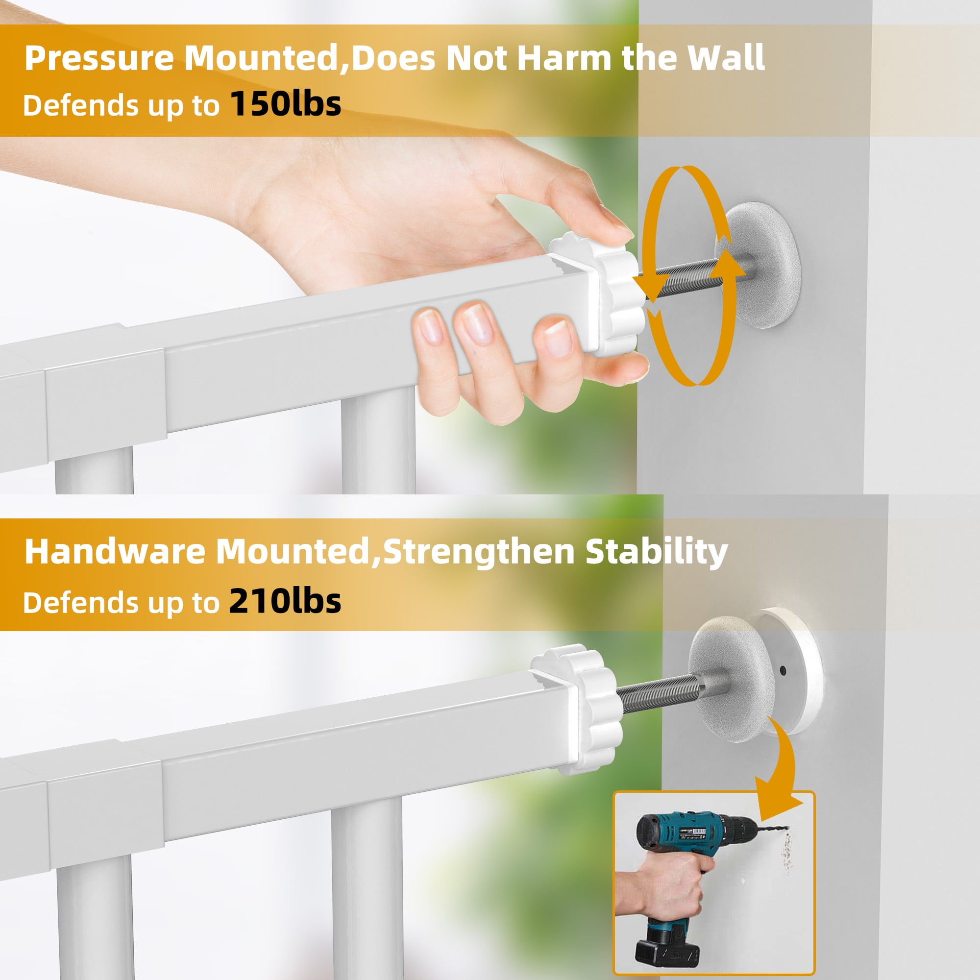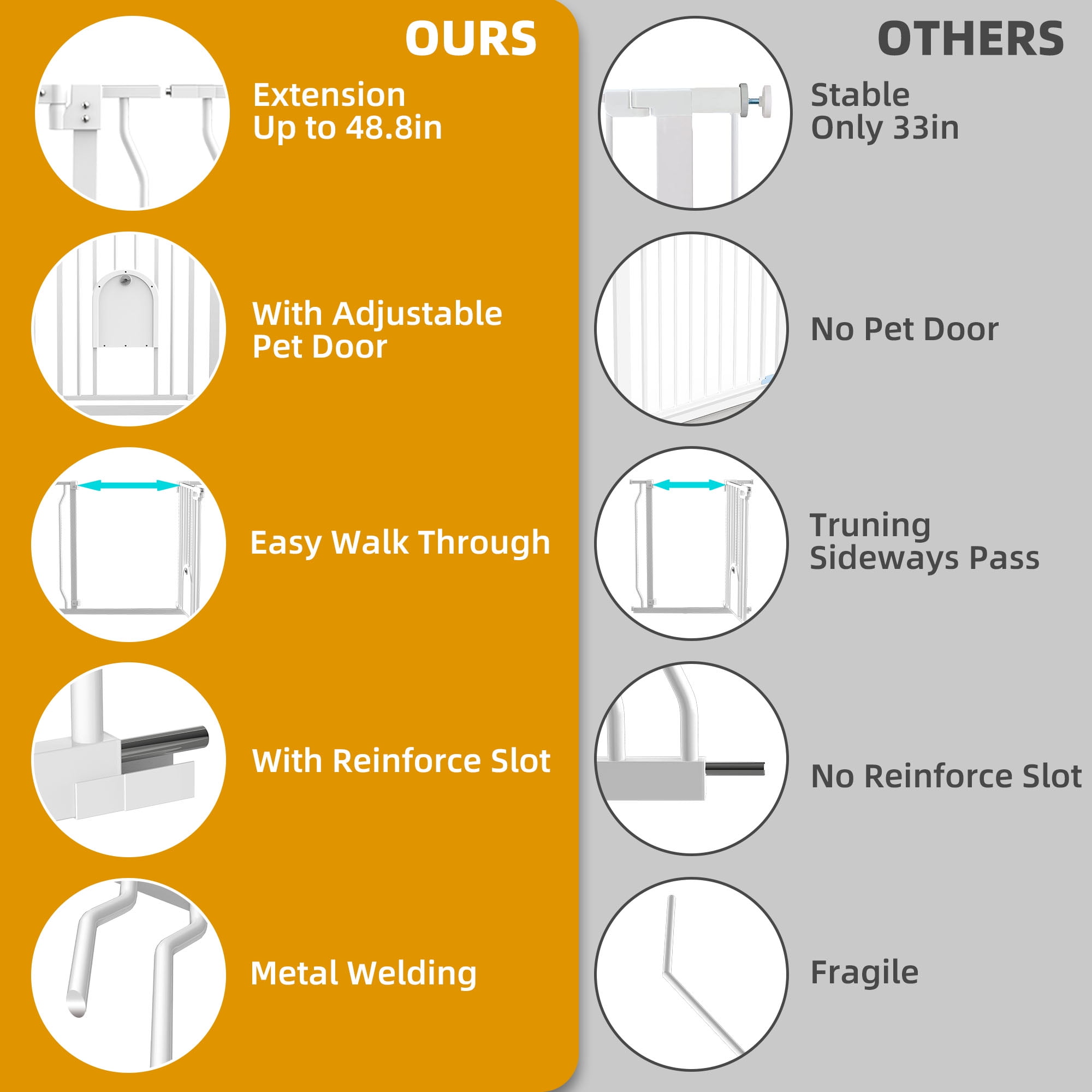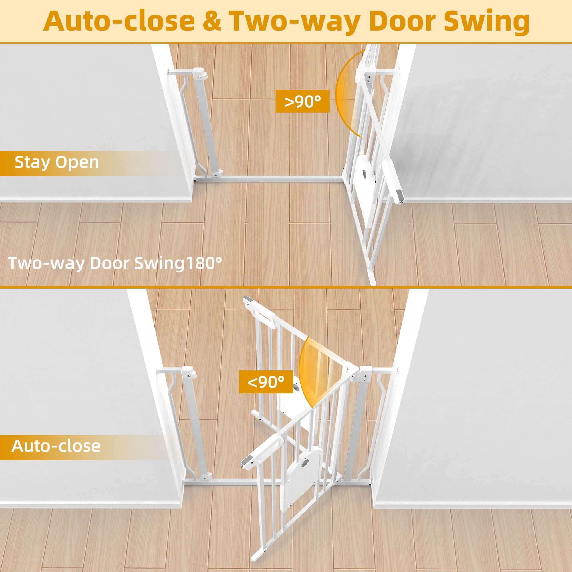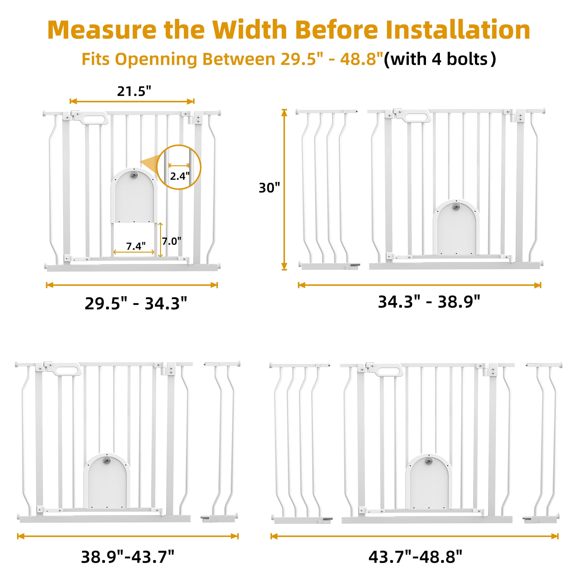 【Extra Wide & Esay Walk Thru】The baby gate includes 2 extensions, the width can be adjusted from 29.3-4.8inch, the widened passage easily passes through adults, strollers, dogs. Perfect for doorways, hallways, kitchens and stairs. 【Lockable Pet Door】The small pet door passage is 7.4”L*7.0”H, cats and small dogs can easily pass through, very suitable for children and families with multiple pets, providing a safe range for children, and also effectively avoiding fights between pets. The gap of the gate is only 2.4inch, which will not get children’s hands stuck and prevent animals from backlogging. A good choice for pet owners and parents of babies. 【Easy Installation & Automatic Closing】This pressure-installed baby gate does not require any tools and will not damage the wall, suitable for stairs, corridors. Even if you are holding a baby, it can be opened with one hand, so you don’t have to worry about forgetting to lock the safety door, it will automatically close when it is less than 90°, and it has a 2 way swing door. 【Double Safety System】The kid gate bar has a double safety door lock system, adults can open it easily but babies can’t open it easily, for 6-24 months kids. 【Sturdy Construction & Spot-Welded Reinforcements】2 metal reinforcements are respectively spot-welded on the extension of the door rail, the high-quality metal material is more durable. Baby Gate can withstand impacts up to 150-210 lbs, such as Husky, Alaskan, etc. Never be afraid of pets jumping over a door. You don’t need to worry about this gate being knocked down and hurting your kids. Documents ▶▶▶Click Here for User Manual(English) Packing Included: 1* Main Gate 1* 4.7im Extension 1* 9.4in Extension 4* Sticky Pad 4* Tension Bolt 4* Wall Cup Several expansion screws and screws Specification: Material: Metal Baby Gate Width: 29.5″ Extended to 48.8″ Baby Gate Height: 30″ Pet Door Size: 7.4″L * 7.0″H Pet Doors Through: Cats, Small dogs, Rabbits and Other Small Pets Note!!! 1. Please measure the width of the installation location before purchasing. 2. Before installation, please do not cut off the cable tie at the door lock position. 3. Before installation, it is normal that the two sides of the door lock cannot fit together. 4. During the installation process, the door lock fits closely with the pressure on both sides. 5. Please keep the door rail and the ground vertical, the firm effect will be the best.