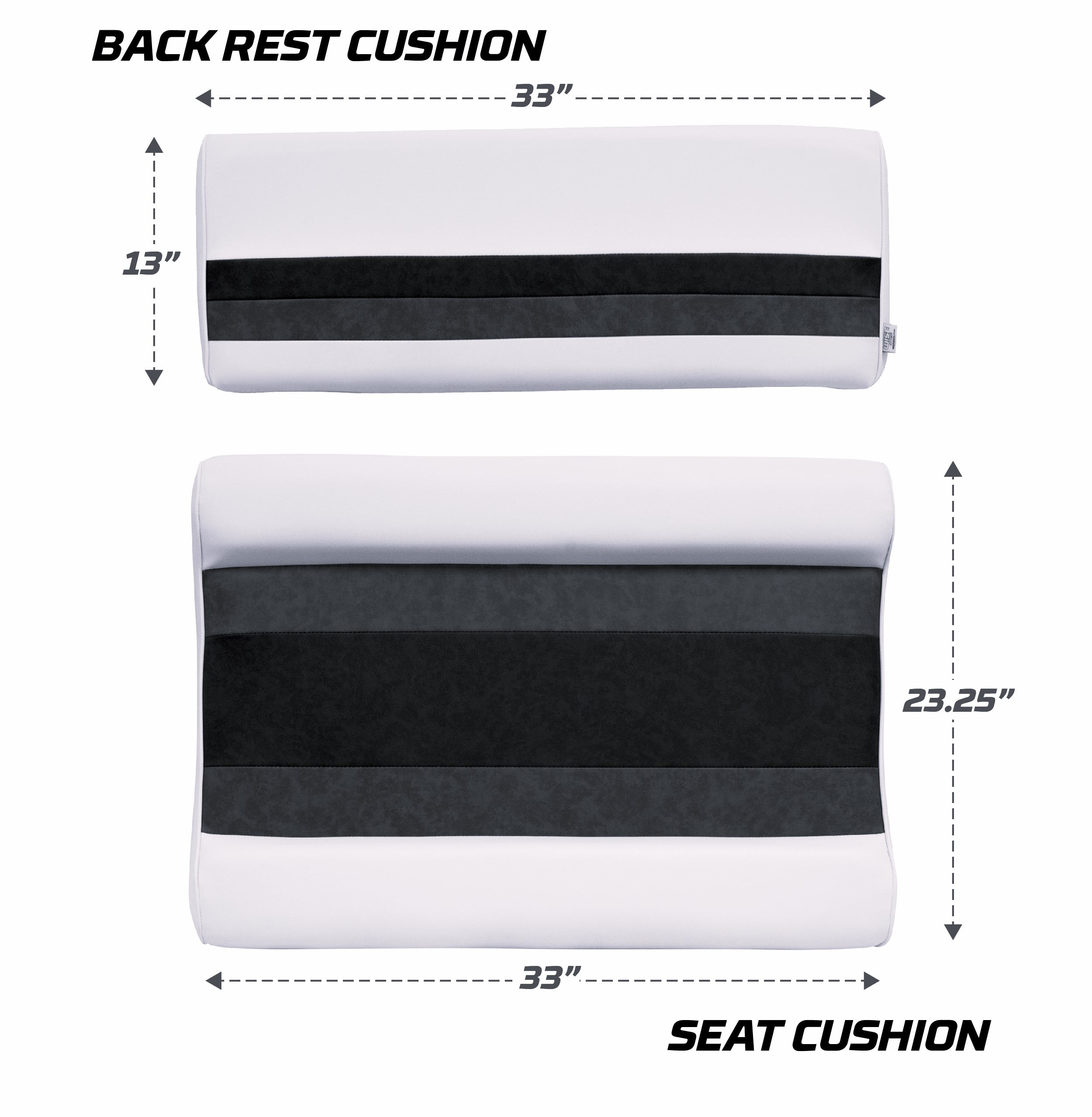 Deluxe Series Pontoon Flip Flop Bench Seat Cushion Set Only, Order #8WD125FF-1B-221 Pontoon Seat Base to Complete Set Flip-Flop backrest designed to accommodate seating from multiple positions; Two position swing back rest with anodized aluminum bars and SS hardware; Hinged lift-up seat cushion, designed for easy storage access when attached to Deluxe Series Base (sold separately) Contoured Cushions with Compression Foam Padding and Heavy Duty 28 oz. Marine Grade Vinyl withstands the effects of sun, heat, rain and soiling under normal marine environment conditions Perfect color and style match with other Wise Deluxe Series Pontoon seating components Seat Cushion Dimensions – Width: 33″, Depth: 23″, Cushion Thickness: 5″; Flip Flop Backrest Cushion Dimensions – Width: 33″, Height: 14″, Backrest Thickness: 4″; Overall Height with Base: 32.25″ Height to Top of Seat with Base: 18.5″ (Base Sold Separately)