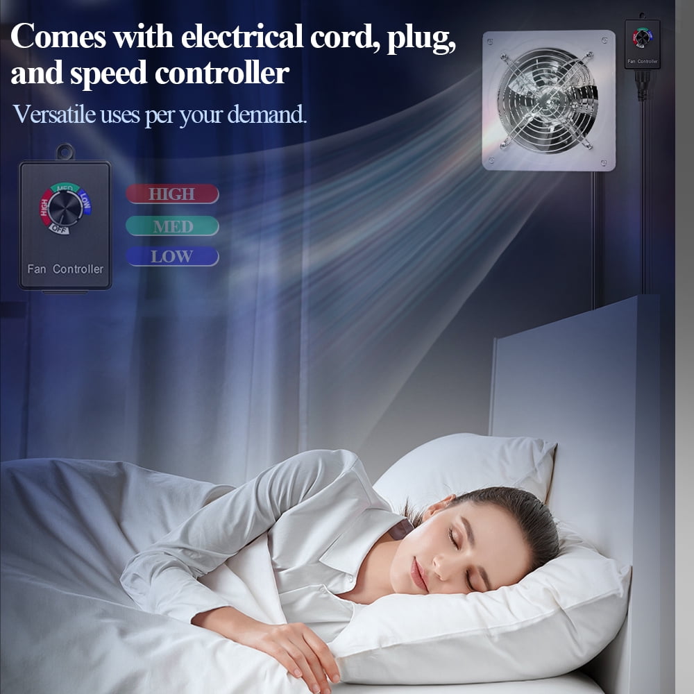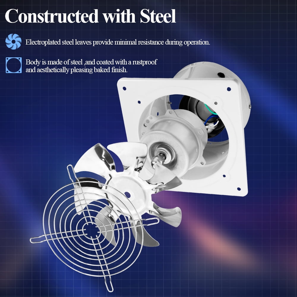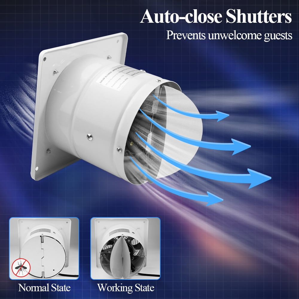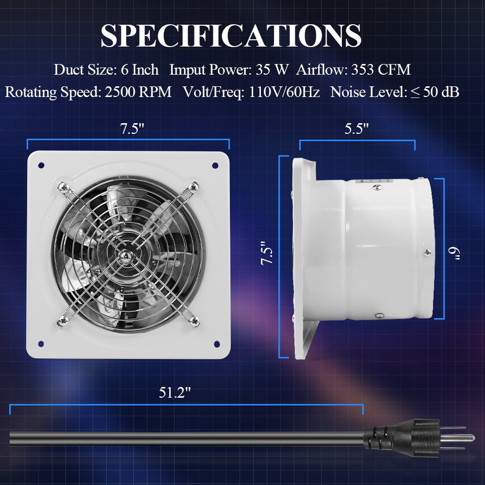 WiseWater 6” Duct 353CFM 35W Wall Mounted Ventilator Fan 50dB, 2500 RPM – White Venting Capacity: Maximum speed of 2500 RPM with an airflow rate of 353 CFM, suitable for areas of 4364 ft² (with an 8 ft ceiling) using only 35 W of power Premium Material: Blades made of rustproof electroplated steel; durable steel body with a stylish baking finish; features a pure copper coil for stable motor operation Speed Controller Included: Offers variable running speeds to help reduce electricity consumption Low Noise: Operates at a noise level of less than 50 dB for a quiet environment Critter Prevention: Equipped with gravity shutters at the outlet to block the entry of flies and other pests