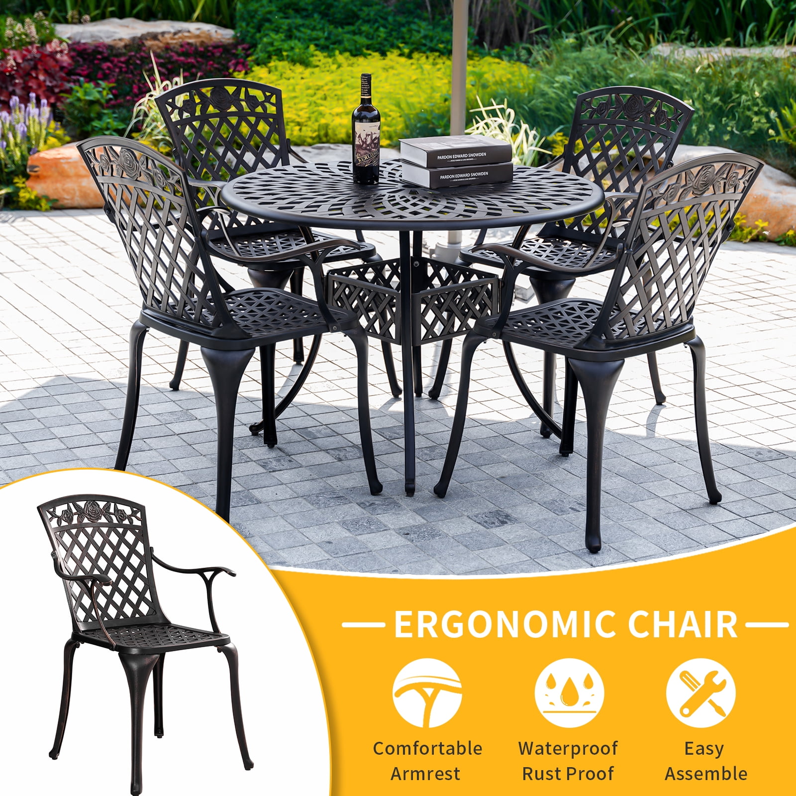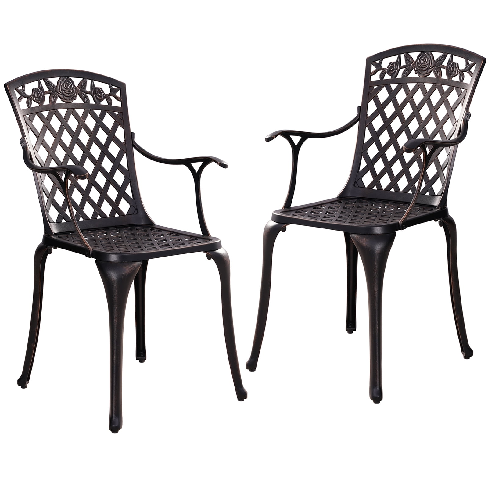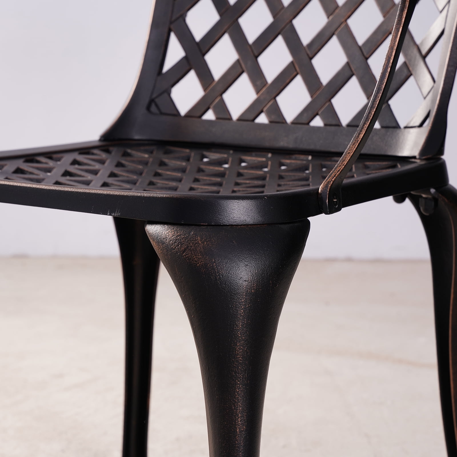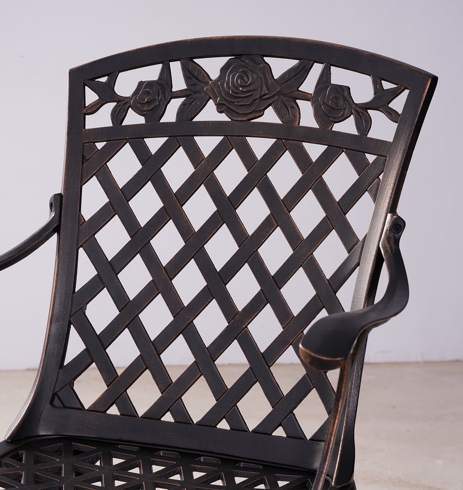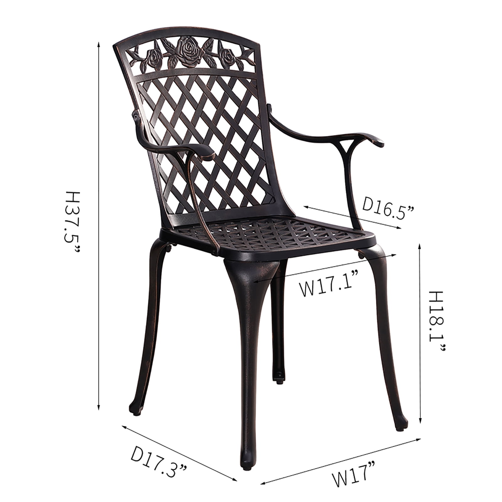 Feature: Patio dining chairs set made of solid cast aluminum frame and premium powder coated finish, waterproof, rust resistant and fade resistant. Smooth curved armrests enhance the comfort of the patio dining chairs and relax your arms. You can learn the whole body on the wide seat and cozy back to relax The legs and back. The sturdy cast aluminum structure provides excellent stability. These outdoor dining chairs are a combination of beauty and practicality, making it stand out from homes and patios both in function and vision. The package includes 2 cast aluminum chairs with all accessories and tools and clear instructions, which can help you assemble the chairs quickly. Metal chairs with woven lattice design and antique bronze finish add beauty and style to the garden, you can also use them for a front porch or patio, balcony, poolside, apartment, cafe, bistro, and other spaces Specifications: Material: Cast Aluminum Color: Antique Bronze Chair: D 17.3″ x W 17″ x H 37.5″ Seat: D 16.5″ x W 17.1″ x H 18.1″ Max. A load of single dining chairs: 396 lbs Note: Due to light or monitor reasons color will be slightly different. Product sizes are manually measured, there will be 1-2 inches of error. Outdoor Chair x 2