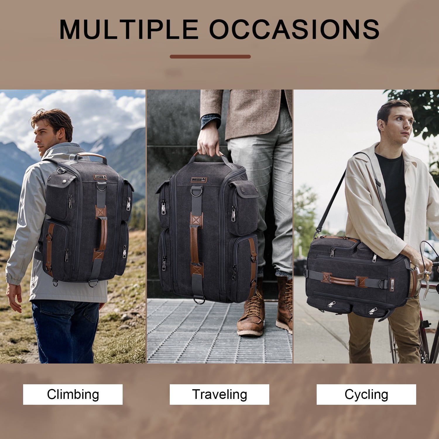 This man’s canvas luggaga backpack for airplane is made of high quality canvas and PU leather fabric with a unique feature design with U-shaped opening. The spacious main compartment is perfect for storing daily necessities, travel accessories, clothes, stationery, school books. Versatile pockets keep your items organized and easy to find. It’s the perfect travel companion for men or women who enjoy international travel, camping, trekking, hiking and overnight trip. There are three colors to choose from: black, brown, army green, suitable for teens and adults. Four carrying options in one backpack, it is convenient for you to used as a backpack, crossbody bag, shoulder bag and duffel backpack. This large travel backpack capacity is comfortable to carry, especially with its ergonomic layout and good zipper quality.
