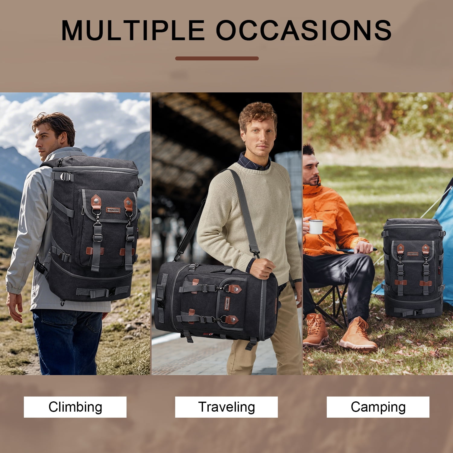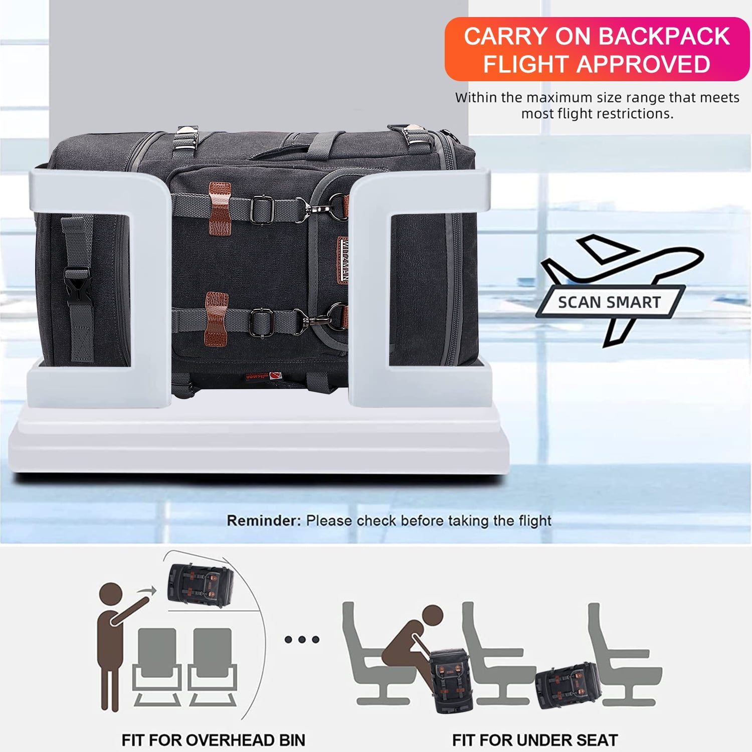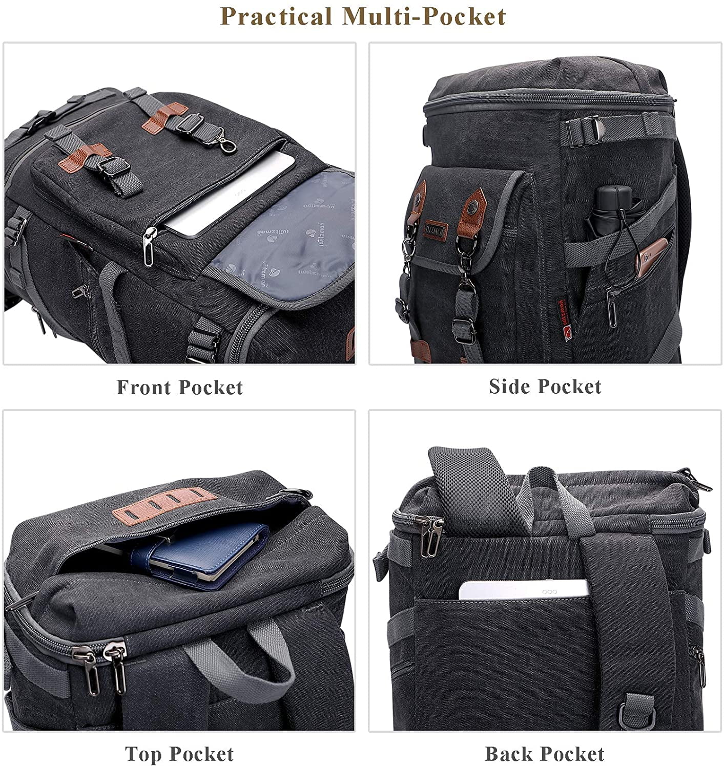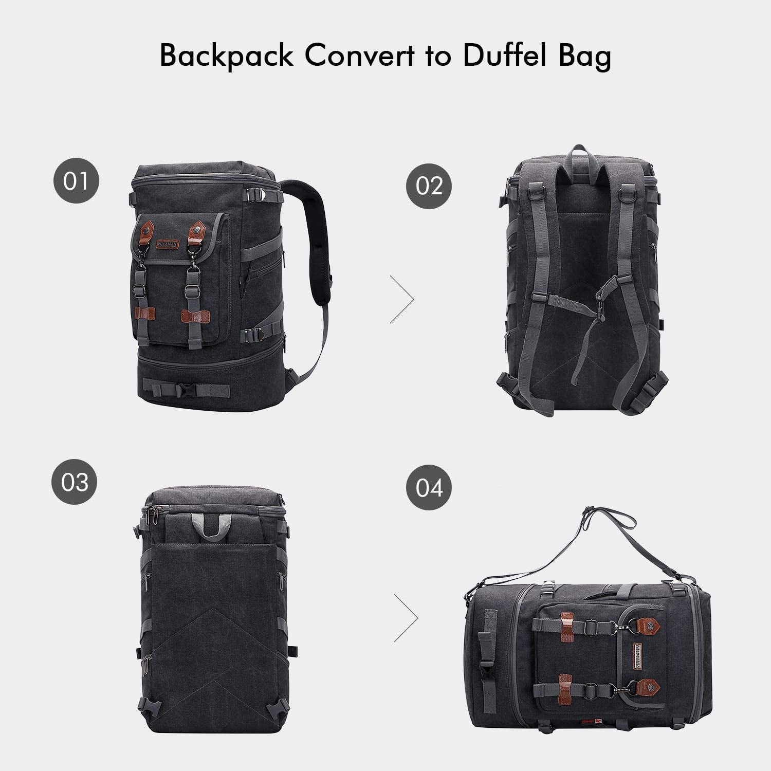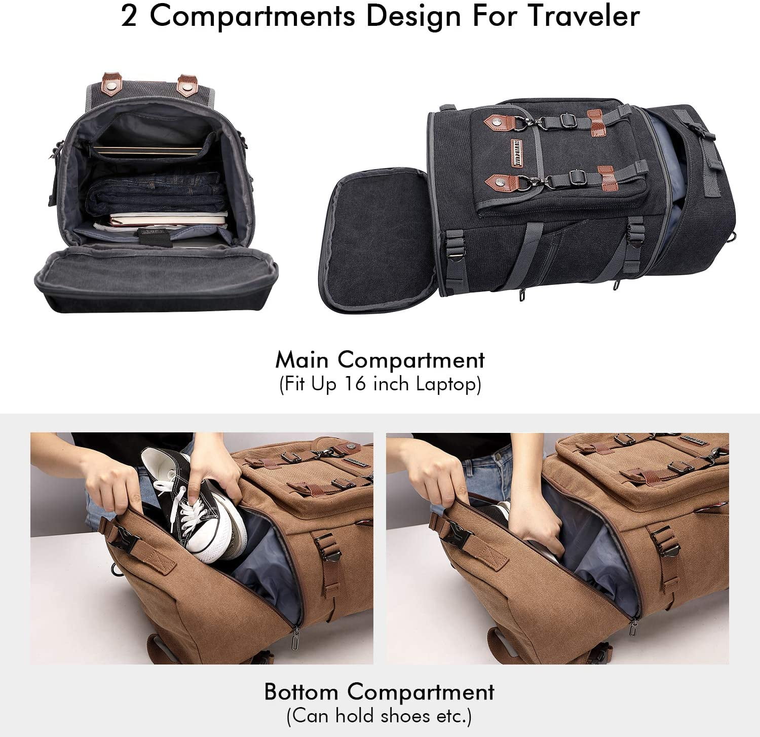 ✈【Convertible Backpack】— The backpack straps can be hidden in the back compartment. With a long strap, you can easily convert it into a cross-body bag , duffle backpack or shoulder bag. ✈【Materials】 — This mens laptop rucksack is made of high quality canvas with PU leather; polyester lining; gun color hardware. ✈【Dimensions】— L 13 x W 7 x H 22 inch / L 33.2 x W 17.8 x H 56 cm; Weight: 1.40 kg (3.01 lbs); Come with a 53 inch removable and adjustable shoulder strap, large capacity 40L. ✈【Double Compartment Design】 — Main compartment and bottom compartment. Product Structure: 1 main compartment with 1 padded laptop compartment and 1 zip pocket, 1 bottom compartment, 1 back compartment, 1 front zip pocket, 1 hidden zipper pocket on top, 2 pockets on both sides. The multi pocket design makes this bag more practical. ✈【Easy to Organize】—The travel backpack’s main compartment with a laptop pocket for 12 to 17 inch laptop roomy space to store different travel gears. The bottom compartment easily separates dirty items, such as dirty shoes and clothing. The travel backpack is large enough for vacation, weekend getaway, overnight trip .The travel backpack is large enough for vacation, weekend getaway, overnight trip.