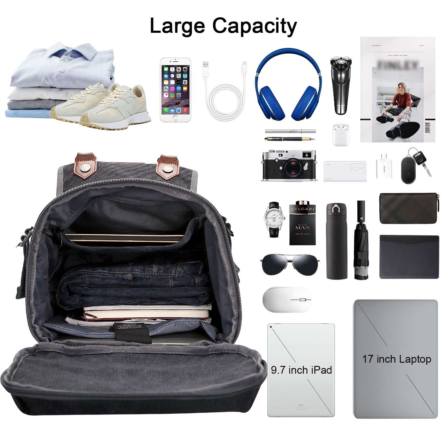 Retro Canvas Rucksack for Laptop Backpack Travel Duffle Bag, which is casual travel style. This carry on luggage backpack is made of canvas with PU leather and hardware trim, polyester lining, durable for use. You can use it as a weekender backpack or duffel bag, for work backpack,travel backpack, hiking backpack, camping backpack, or other outdoor travel bag. Double compartment design, easy to separate items. Can fit your clothes, travel accessories, books, binders, electronic accessories, shoes, etc. And the laptop compartment can fits up to 17-inch laptop/notebook, and the laptop compartment is designed with padded to protect your devices. Bottom compartment: Can hold your shoes. The backpack versatile for people of all ages, serves you well as college, high school, middle school backpack for men,boys,teens, adults.