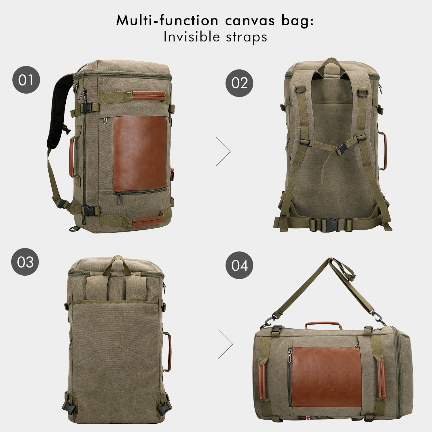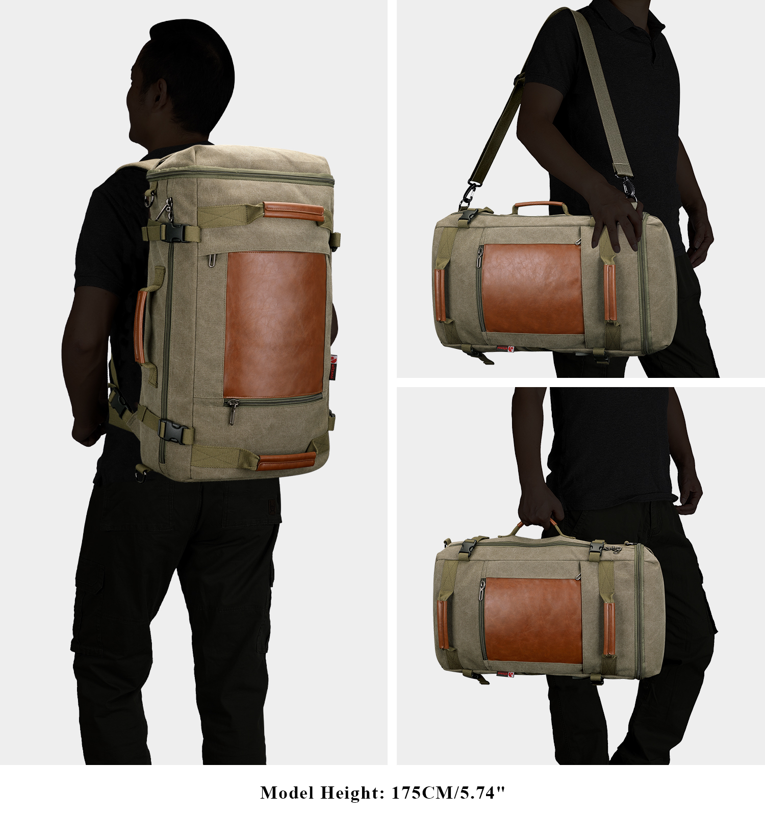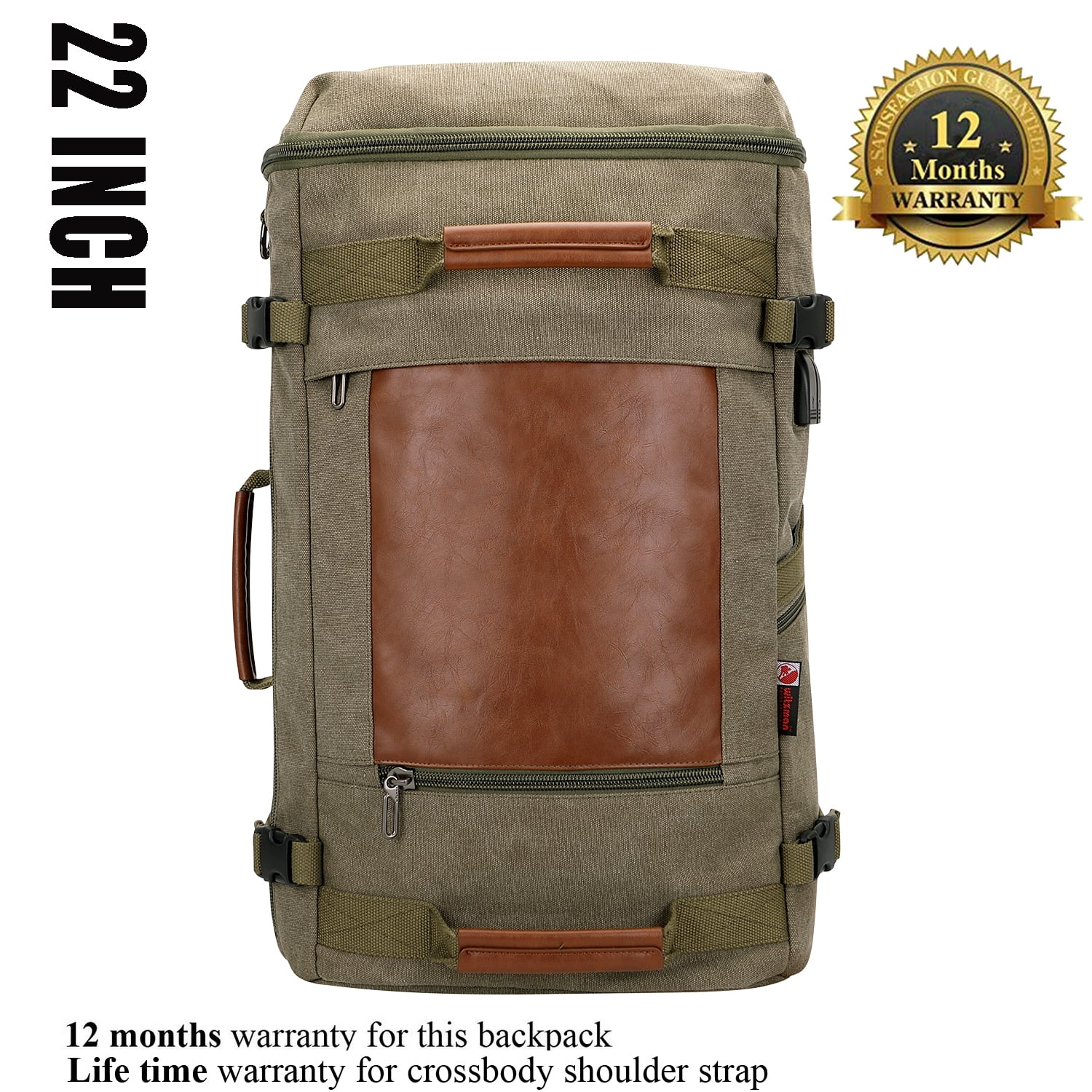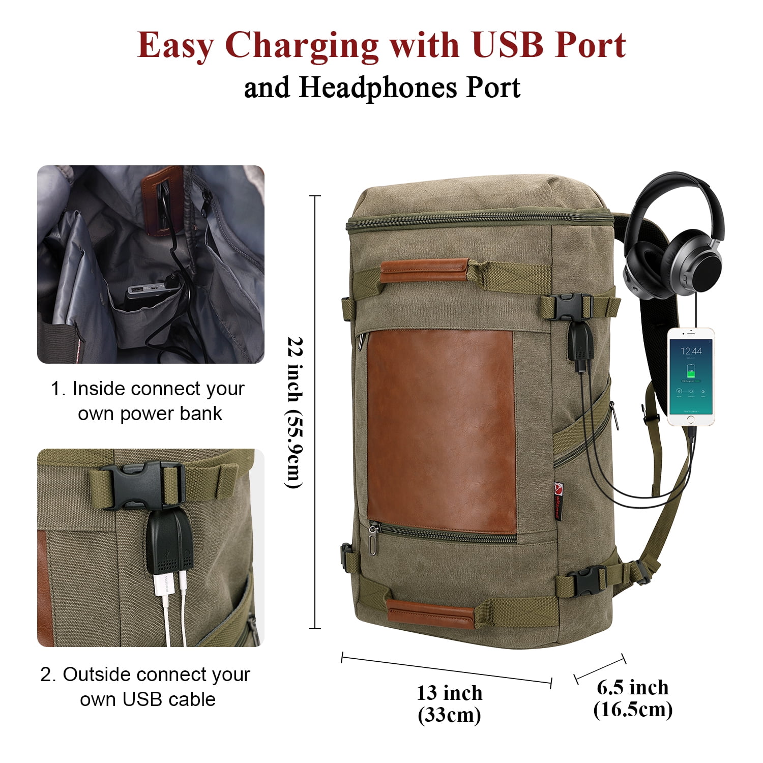[Convertible Luggage Backpack] — With a removable shoulder strap and a handle, not only a backpack, but also a carry on duffel bag, laptop backpack luggage and even a weekender handbag/tote bag. [Materials & Dimensions] — Made of high-quality canvas with PU leather; Polyester lining; Gun color hardware. Size: L 13 x W 6.5 x H 22 inch / L 33 x W 16.5 x H 55.9 cm; Weight: 1.53 kg (3.37 lbs). [Large Capacity with Multiple Pockets] — External: 2 front zip pockets, 1 top zip pocket, 2 pockets on one side, 1 back large zip pocket; Internal: The main pocket includes a top zip pocket + a 17-inch laptop pocket + a iPad pocket + a large zip pocket + 2 open pockets + a charging cable pocket. [Convenient USB Port and Headphone Port Design] — With built in USB charging port and headphone port outside and built in charging cables inside, convenient for charging your phone and listening to the music on the way. Please note that this backpack doesn’t power itself, only offers an easy access to charge. [Warranty] — All of our bags have 1-YEAR WARRANTY and the removable shoulder strap is LIFETIME WARRANTY. Any problems with your bag, please contact our customer support team for quick solutions by contacting us through ; [Travel Bag]—The large capacity backpack is a great travel backpack for OUTDOOR/INDOOR activities and perfect for camping, hiking, vacations, travel, trekking, hunting,fishing, cycling, mountaineering, weekend getaways, occasional travel, overnight trips and many outdoor activities. The unisex design fits people of all gender