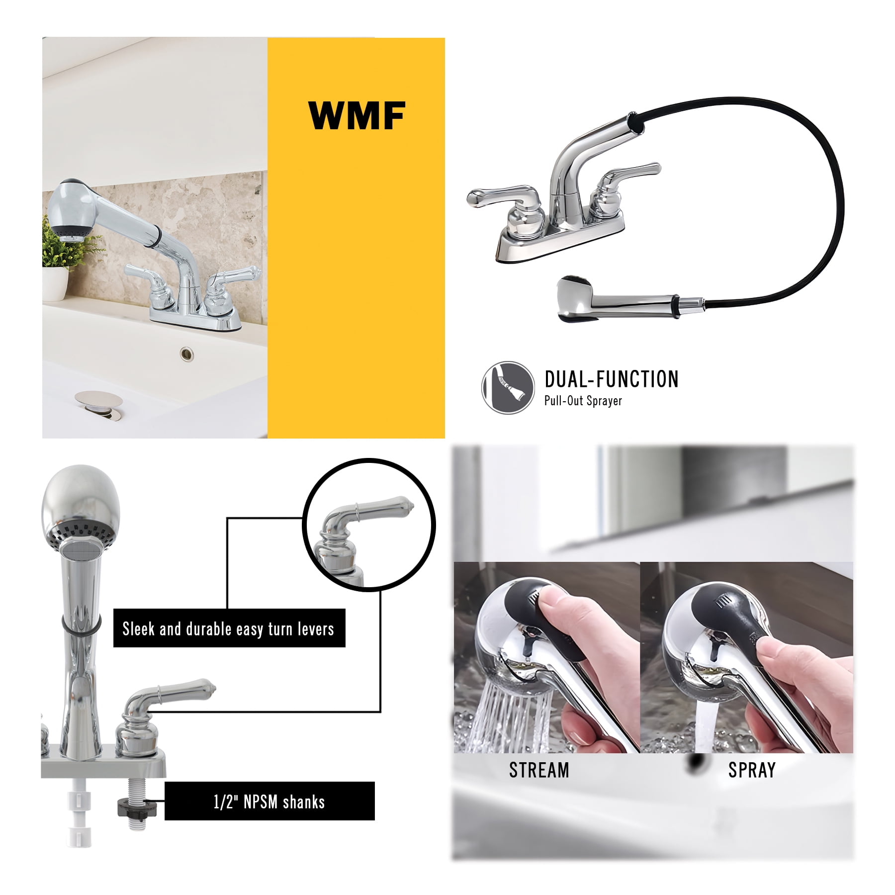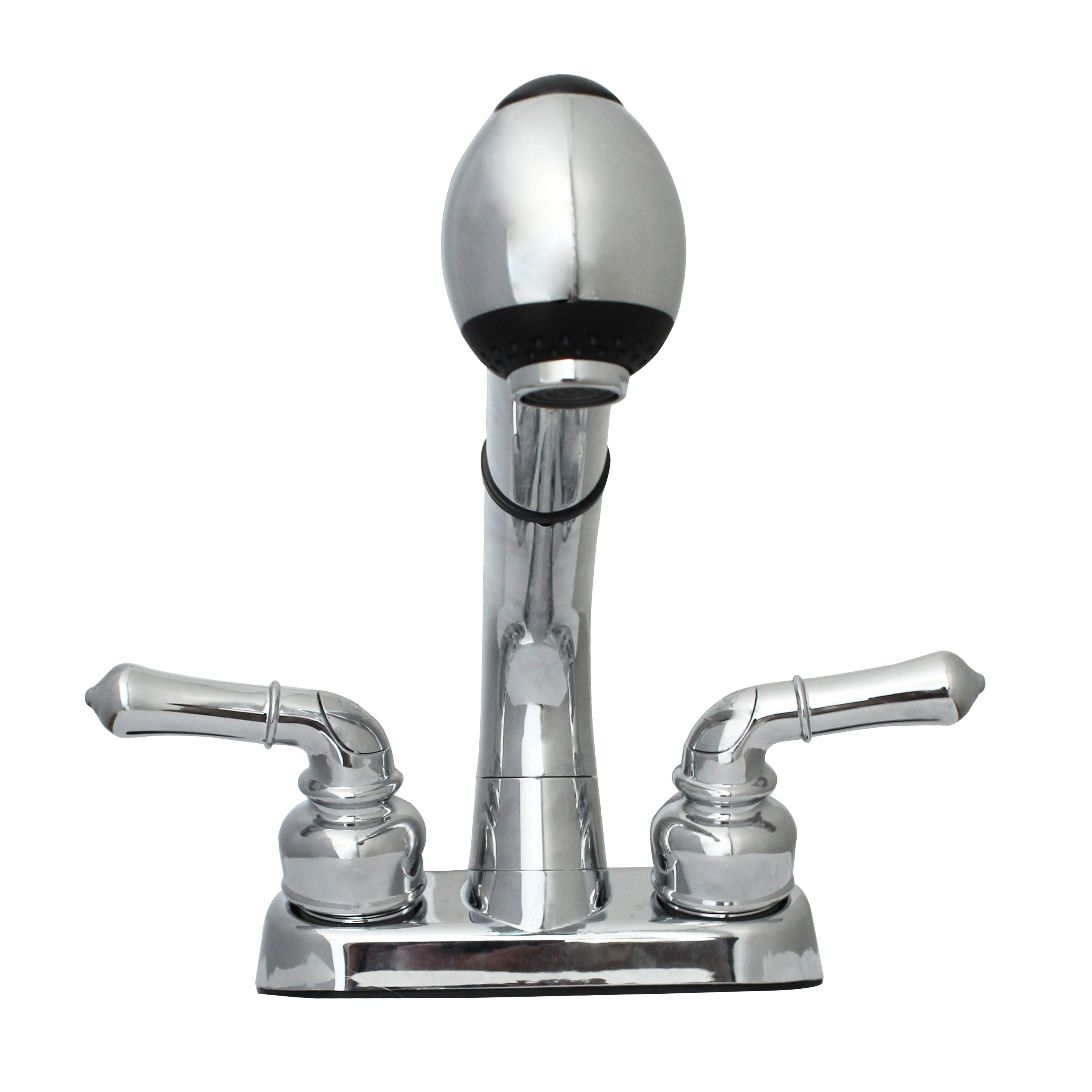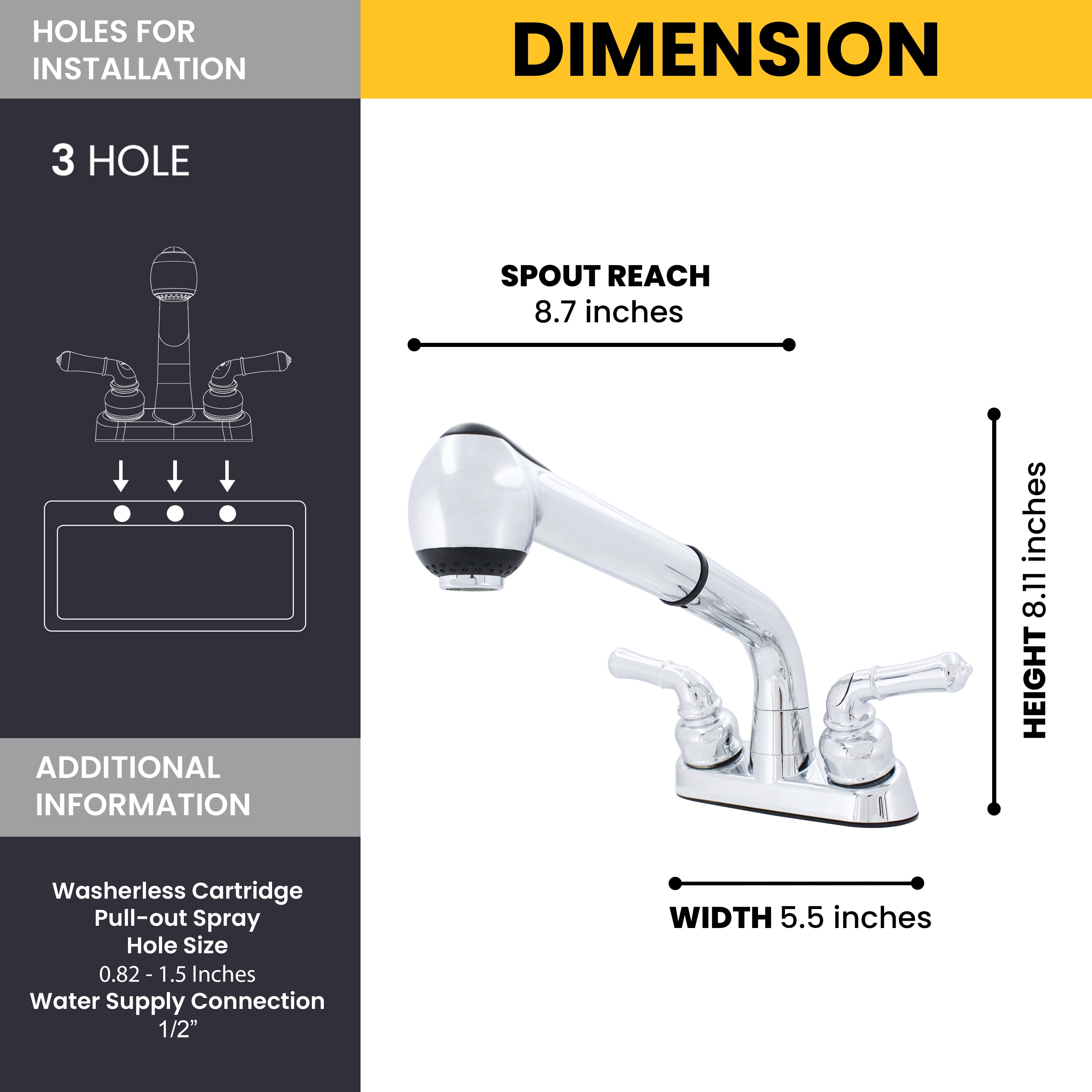 FEATURES – The modern exterior comes with a two-lever operation to quickly adjust temperature and water pressure. This unit has an aerated flow, and includes a fully functional shower hose diverter. DESIGN – This design faucet come with pull-out sprayer with virtually all decor styles. This unit is made with premium grade lightweight synthetic waterways and plastic construction. QUALITY – This dual lever faucet comes with a durable easy-to-turn design, which provides a smooth turning action and prevents dripping. This model is lead-free certified INSTALLATION – If you are concerned about adequate space on your sink top to accommodate this faucet, dont worry! It was made with a recreational vehicles space in mind. Works with any 2-hole sink opening, center to center installation width is 8. Flow rate is 1.8 GPM. UPC and CUPC Certified. Pop-up not included, but can be purchased separately.