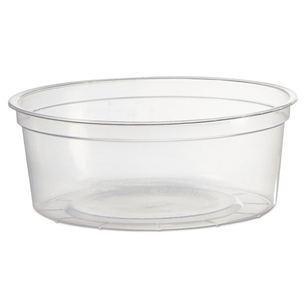 Deli Containers, 8 oz, Clear, Plastic, 50/Pack, 10 Pack/Carton Plastic containers are an excellent way to serve salads, olives, cold cuts and more. Smooth, rounded surfaces take both adhesive and marker labels easily. Refrigerator- and microwave-safe. An excellent way to serve salads, olives, cold cuts and more. Easy to label. Refrigerator- and microwave-safe. – Color: Clear – Food Container Type: Base – Global Product Type: Takeout Food Containers – Material: Plastic – Number of Compartments: 1 – Material Type: Plastic – Hinged Lid (Yes/No): No – Vented (Yes/No): No – Interior Volume Capacity: 8 oz – Product Biodegradability in Days: 0