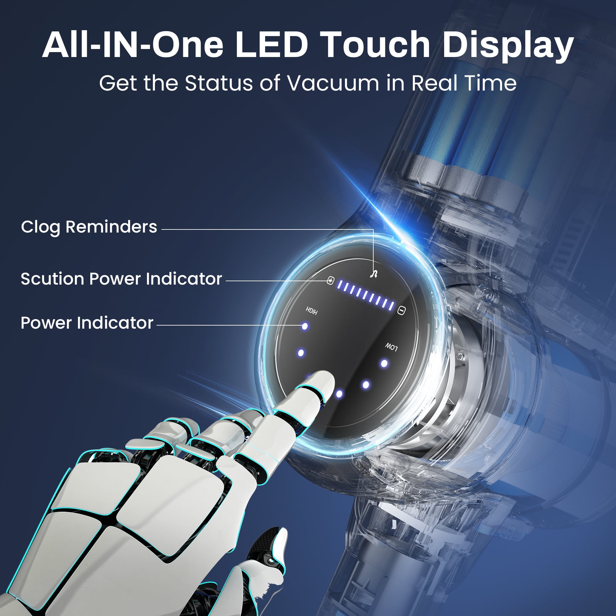 Powerful 25Kpa suction delivers thorough cleaning performance on carpets and hard floors. Brushless motor provides efficient and ultra-quiet cleaning experience less than 65 dB. Up to 45 minutes of runtime on the eco mode, perfect for whole-house cleaning. 6-in-1 versatile design with multiple accessories for cleaning floors, furniture, and tight spaces. Large LED display lets you monitor the vacuum’s status, including battery levels and suction performance. High-efficiency HEPA filtration system captures 99.99% of fine dust as small as 0.1 microns. Self-standing design allows you to store the vacuum upright without a wall mount. 1L large dust bin is easy to empty with a single click.