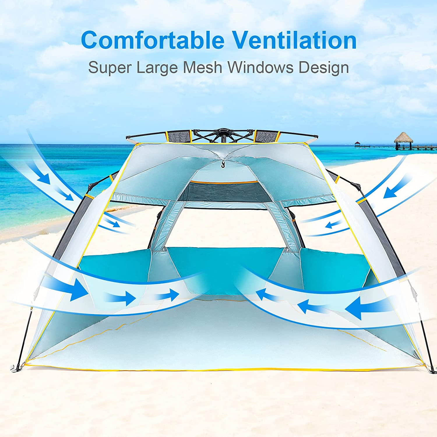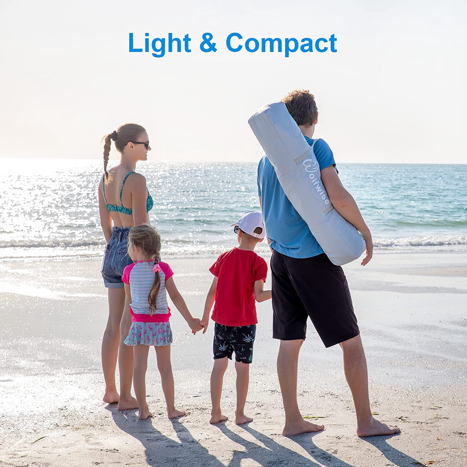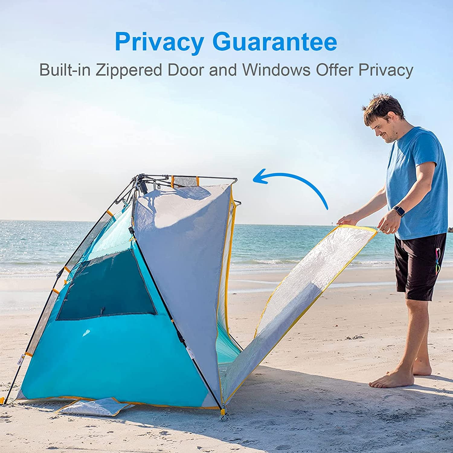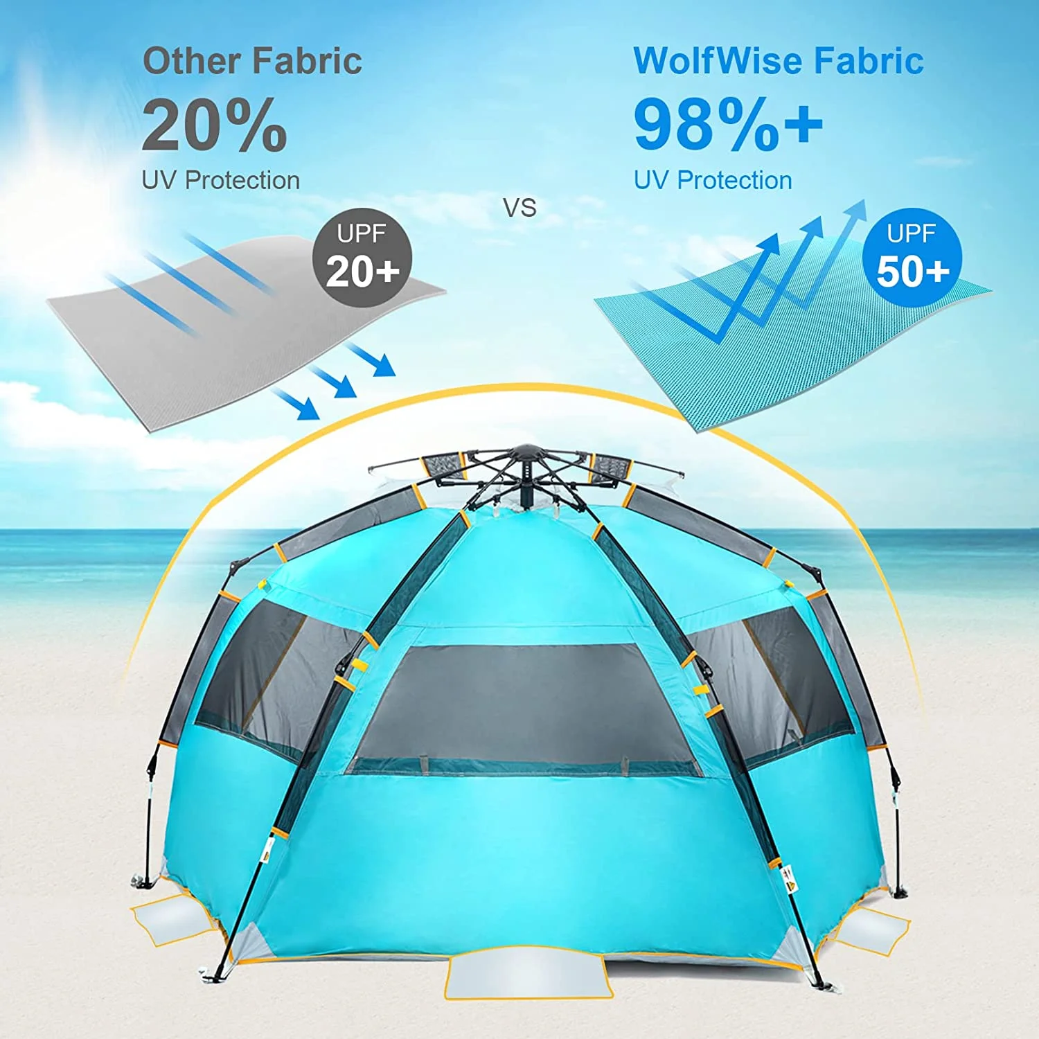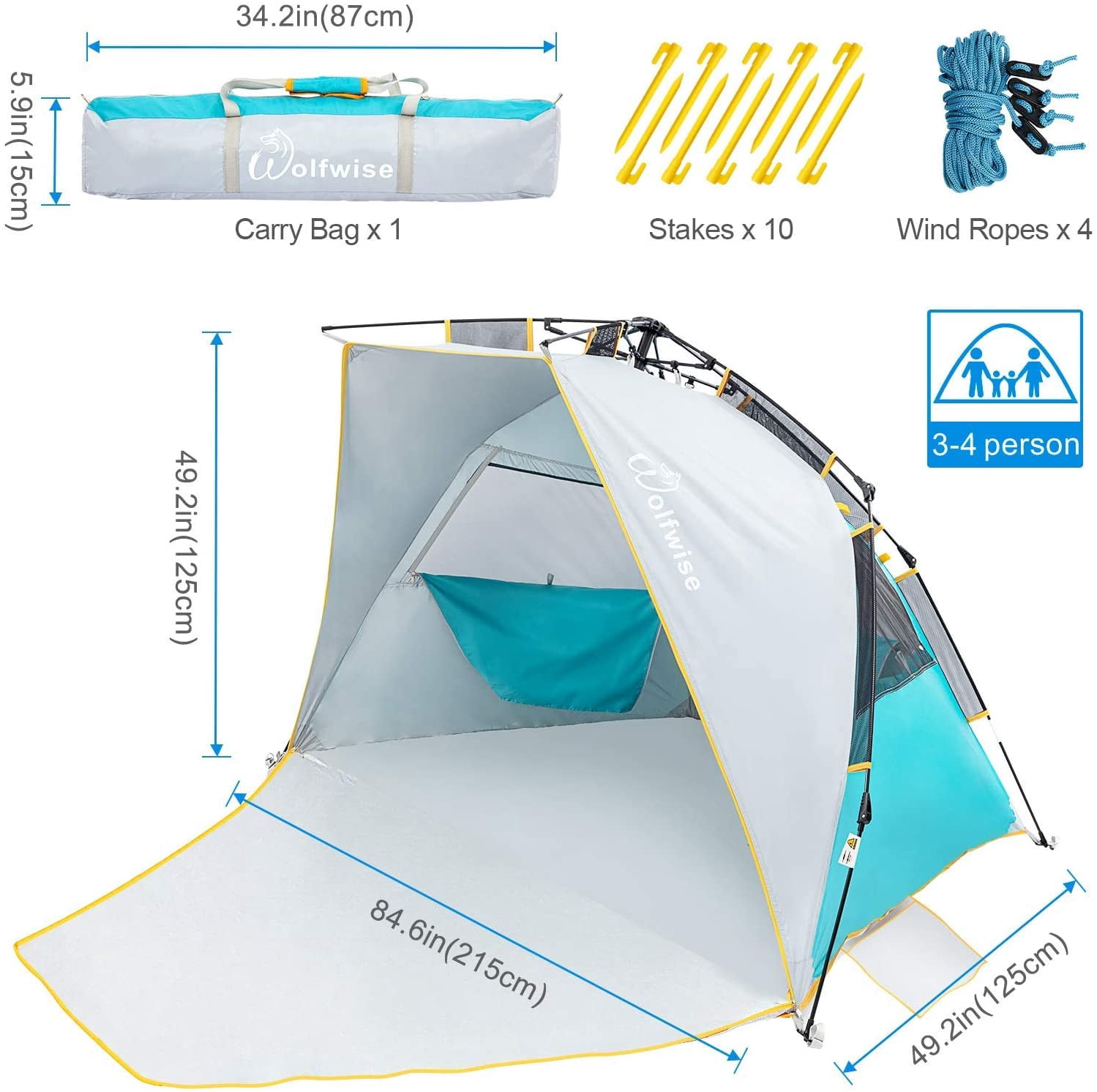 Wolfwise Easy Setup 84.60″ x 49.20″ Beach Tent, Blue Easy Setup & Super Stable: The specially designed spring opening system allows for quick setup by one person in seconds, making it faster and more effortless than traditional designs Spacious Space: When open, this beach shade measures 84.6″ L x 49.2″ W x 49.2″ H with a 47.2” front porch, comfortably accommodating 34 people or two regular beach chairs It folds down to a compact size of 342″ L x 59″ W x 59″ H for easy transport Privacy Guarantee: The zippered door and window design provide a private space for changing swimsuits or breastfeeding, allowing your family to rest comfortably after a long day of play UPF 50+ & Water Repellent: Constructed from waterrepellent polyester fabric with a silvercoated interior, this tent effectively blocks harmful UV rays, keeping you cool and protected