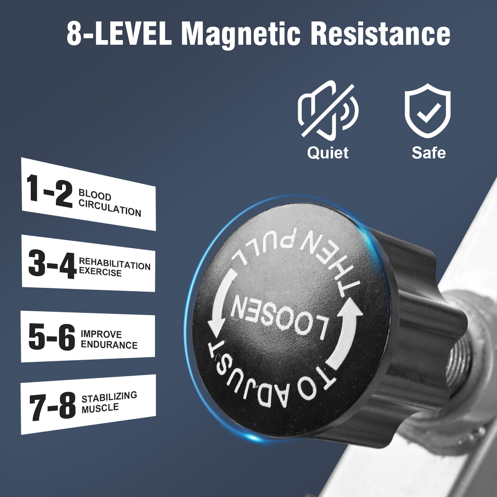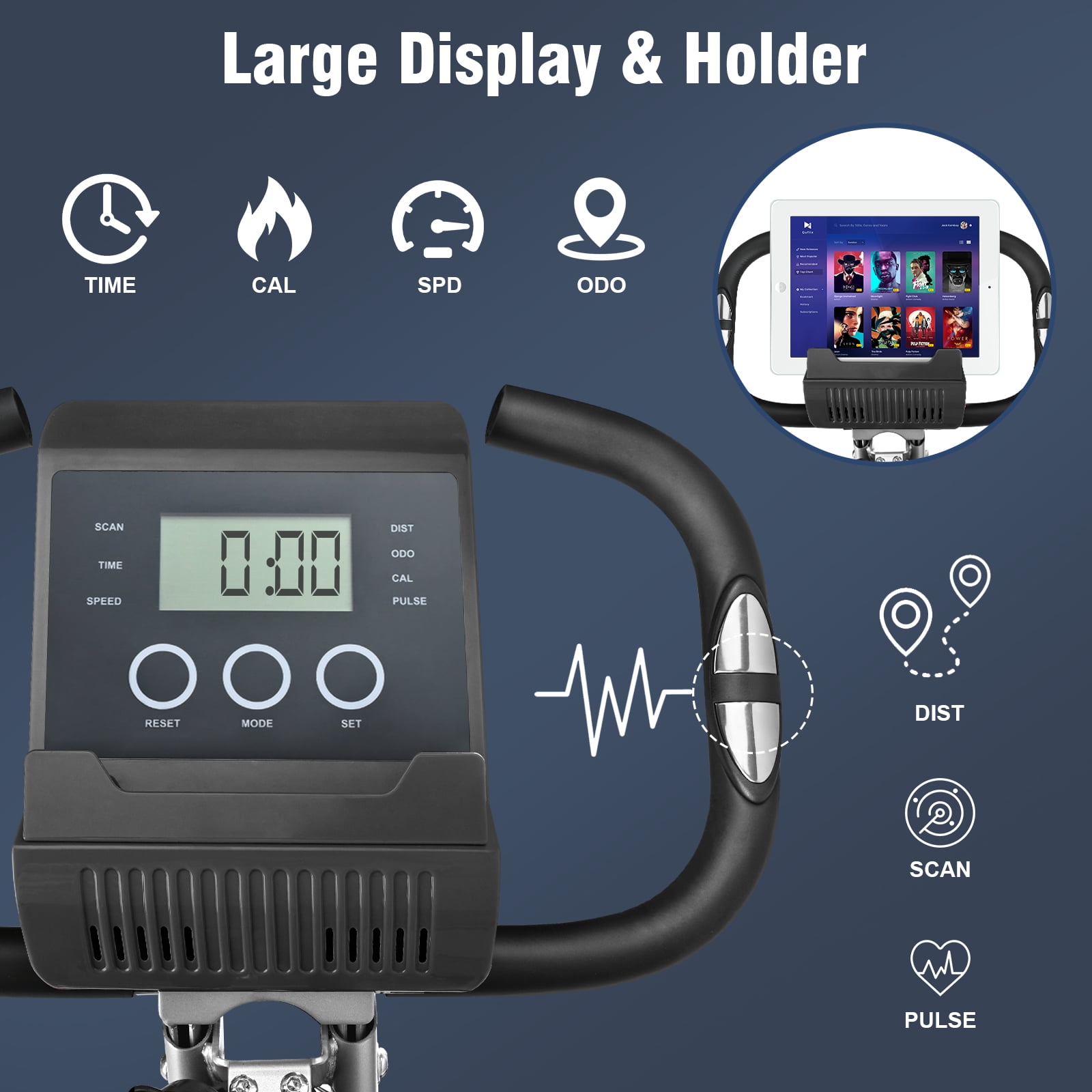 Key Features: 【2-IN-1 Workout Station】- The resistance level of magnetic exercise bike can be easily adjusted from Level 1 to Level 8 by the tension knob. The arm resistance bands helps to tone your upper muscles. Work out your whole body with Wonder Maxi exercise bike! 【Extra Large Seat and Pedals】- Upgraded with broadened rear handlebar and backrest, the exercise bike is equipped with a fully-padded PU seat serving great rebound performance and comfort. Large non-slip pedals with adjustable safety straps fit all size of users. 【Digital Tracking Monitor & Pulse Sensor】- It tracks your multiple sports data, including real-time heart rate, speed, time, scan, distance and calories. The tablet device holder and an extra independent phone stand enable you to view workout videos or favorite shows while exercising. 【Solid and Sturdy Steel Construction】- Strong enough to hold a maximum weight capacity of 300lbs. The enhanced upright stabilizer provides extra support and balance during your vigorous cycle training. 【3 Modes Design】This folding exercise bike has 3 modes – upright,semi-stationary and recumbent, It can be easily adjusted with the lever. The recumbent bike take pressure off your lower back and prevent you from slouching while targets the Quadriceps, Hamstrings Calves, Tibialis Anterior, and Glutes. The upright bike offers you a low-impact workout from a seated position, targeting the same muscles with the addition of core. 【Foldable Compact Space Saver】- Ultra-compact indoor exercise bike requires minimal floor space. Foldable and portable for easy storage and move with built-in transportation wheels. We also offer 12 months parts WARRANTY and TELEPHONE service to secure customer experience. ✔Product Specifications: Feature: Adjustable, quiet and folding. Product dimensions:37.5*16.9*44.5 (L x W x H) Inches Gross Weight:44 LBS Battery: 2*AA Seat height adjustment range: 0 ~ 3.15 inches Maximum load bearing: 441 LBS Applicable height: 4ft 11in to 6ft 3in Stretching range of pull rope: 0 ~ 39.4 inches ✔Package Includes: 1 x Exercise Bike (Accessories and Tools) 1 x User Manual