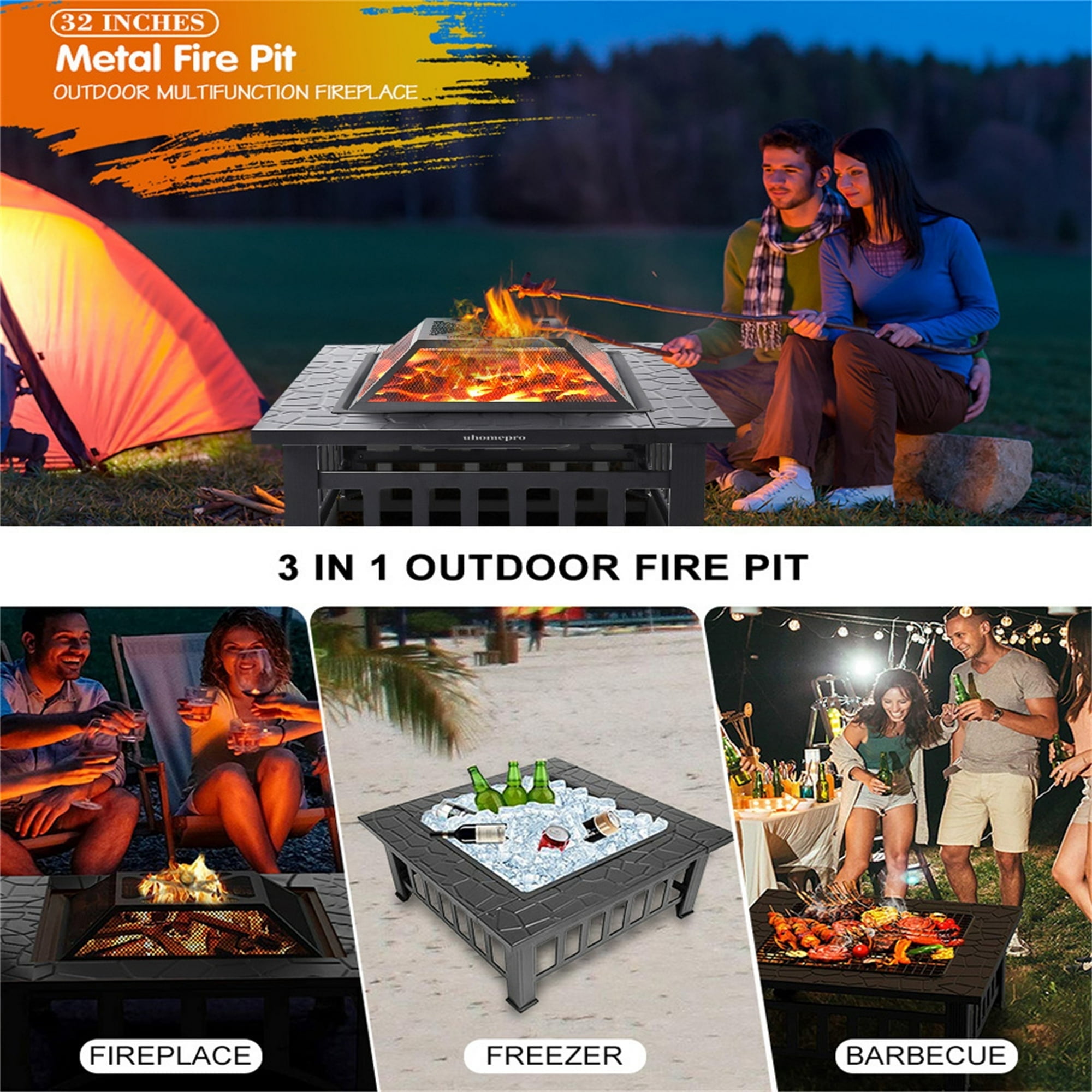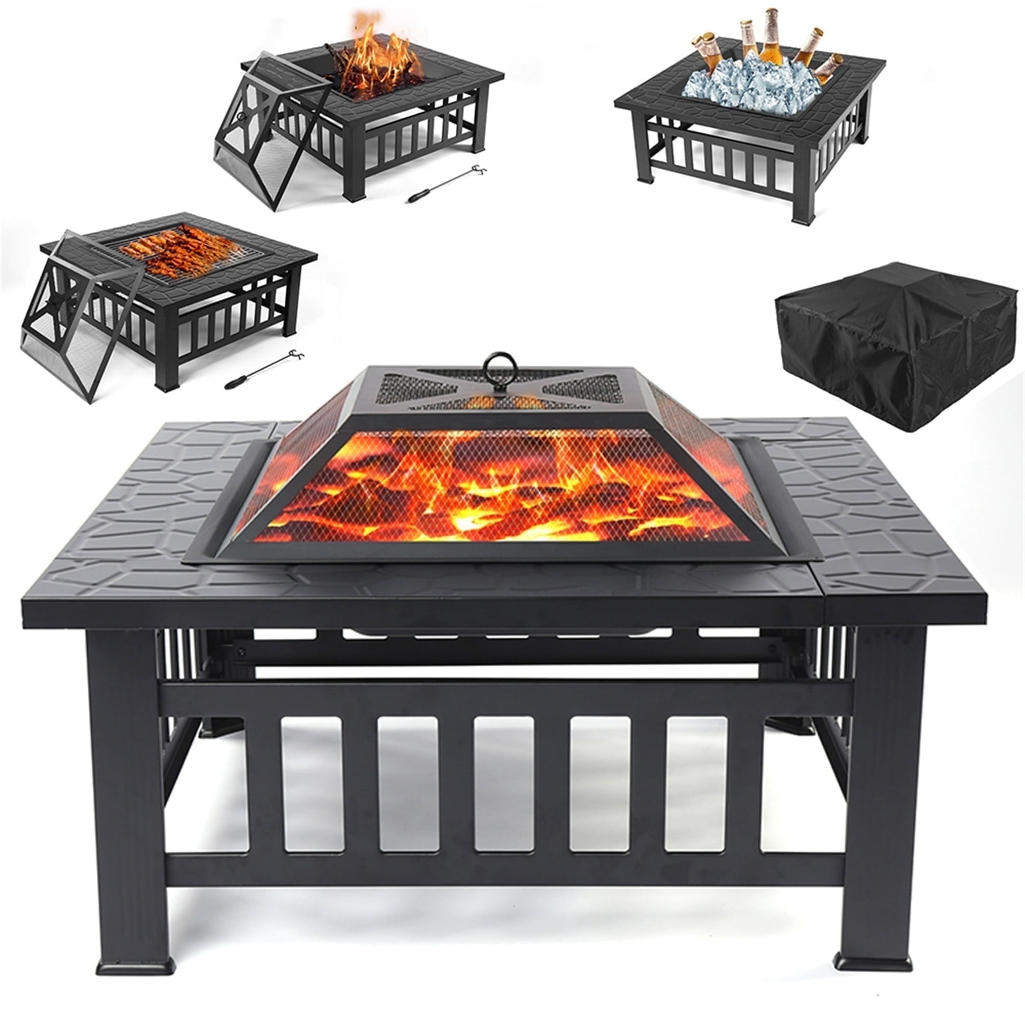 32″ Square Fire Pit, Fire Bowl Outdoor BBQ Burning Grill Heater for Backyard, Camping, Picnic, Upgrade Metal Patio Fire Pit with BBQ Net, Waterprrof Cover, Mesh Screen Lid, Wood Grate, Poker, 32x32x18.5in DESCRIPIONS: ▲1.DURABLE SOLID CONSTRUCTION This outdoor square fire pit is constructed of heavy-duty iron mesh and frame with a high-temperature copper finish for added resistance to rust. Sturdy and well constructed of the fire pit for a high-quality fire. So the garden stove brazier is built in a square shape for stability. ▲2.MULTIFUNCTION FIRE PIT This 3 in 1 outdoor fireplace can be used as a fire pit/grill/ice bucket. Our square fire pits are suitable for many outdoor occasions such as backyards, poolsides, and patio without seasonal restrictions. On cool nights, the fire pit provides cozy warmth, charming lighting, which creates a beautiful atmosphere. ▲3.BEAUTIFUL AND SAFE DESIGN With an attractive faux stone line design with splicing, the fire pits outdoor feature applies to the top frame. Not only enhances its aesthetics, but the outdoor fire pit also makes it slip-resistant. Mesh lid can always provide sight of fire, and prevent sparks or splashes of debris, poker can be used to ignite the flame and remove the mesh cover. So this garden fire pit fully guarantees the user’s safety. ▲4.REASONABLE OVERALL DIMENSION Overall dimensions (32 x 32 x 18.5)” (L x W x H). This backyard fire pit tabletop is wide enough. You can place drinks and roasting supplies on the tabletop around the centerfire area. With the 4-leg stand, the 14.3 inches above the ground. So you can enjoy the joyful moment with family and friends. ▲5.PERFECT FITS FOR OUTDOOR The scientific and reasonable structure of the fire pits for the outside is designed by a professional engineer. The fire pits are not only a practical item for home use but also a good landscape for the garden or courtyard. With fine workmanship on the basis of high-class materials, this fire bowl is in good quality and reliability. ▲6. EASY TO ASSEMBLE This square fire pit features with mesh lid to prevent burning embers blowing and comes with a poker to stoke fire and remove the mesh lid safely. All the fire tools you need to enjoy your campfire or backyard bonfire. ▲7. WARMING TIPS — BBQ Net – What a blessing to have a barbecue with your family outdoors. — Waterprrof Cover – Never worry about the fire pit getting wet from rain when stored outdoors. — Screen Cover – It keeps the sparks under control when the wind –comes up and allows for an open view of the fire. — Handle – It is very easy to take the top on and off with this handle. — Poker – The handle is designed to grasp and lift the top of the fire pit so during fires it’s easy and safe to add more wood. FEATURES: 1. High quality and in a good condition 2. High-class metal material, exquisite treatment, stylish and practical 3. Act as a heater in the cold days 4. Small size, lightweight for easy operation 5. It comes with necessary accessories for convenience SPECIFICATIONS: 1. Material: Metal 2. Color: Black 3. Weight: 25.3 lbs 4. Overall Dimensions: (32 x 32 x 18.5)” (L x W x H) PACKAGING INCLUDES: 1 x Metal Fire Pit 1 x BBQ Net 1 x Waterprrof Cover 1 x Mesh Screen Lid 1 x Poker 1 x Instruction KINDLY NOTES: 1. Place your fire pit 10 feet from any structure or neighboring yard. Do not place your fire pit under a covered porch, trees, or on a wood deck. 2. For safety concerns, never leave the fire pit outside with fire while nobody around, or place pit on a wooden floor or flammable floor, for metal conducts heat or start popping out.