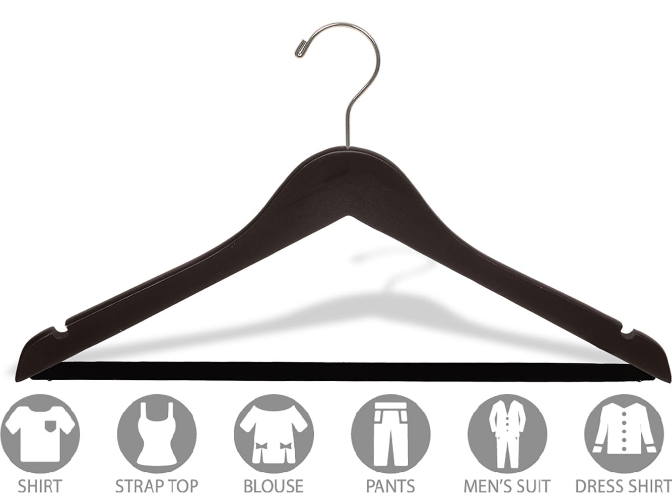 Fine Hardwood – Flat Body – Length: 17″ – 7/16″ – Espresso Matte Finish – Brushed Chrome Hardware – Non-Slip Velvet Pant Bar – Notches For Hanging Straps