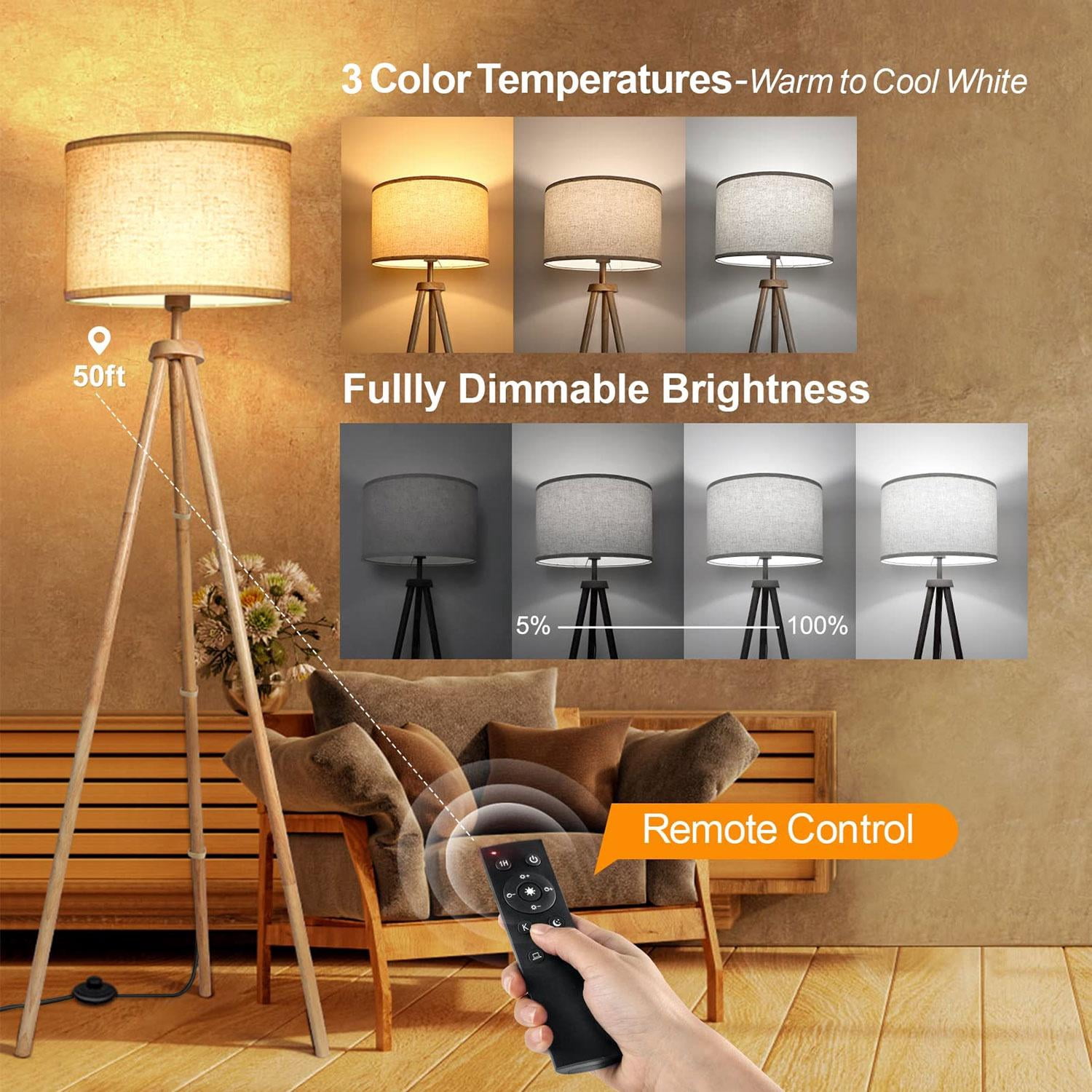 Elevate your home decor with the Elemore Home Wood Tripod Floor Lamp. This mid-century inspired lamp combines style and functionality, featuring a remote control for easy operation. With 3 color temperature options, you can adjust the lighting to suit any mood or setting. The LED modern dimmable design ensures customizable brightness levels, while the beige linen texture shade adds a touch of elegance. Perfect for living rooms, bedrooms, or offices, this tall standing lamp brings a warm and inviting glow to your space. Transform your room with this sophisticated lighting fixture that seamlessly blends timeless design with modern convenience. Package Included: 1 x Floor Lamp; 1 x Lamp Shades (Beige); 1 x 9W LED Bulb(E26 Base); 1 x Remote Control(2 AAA Batteries Excluded); 1 x User Manual.