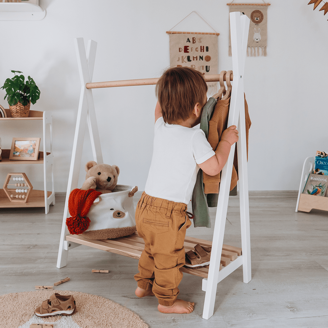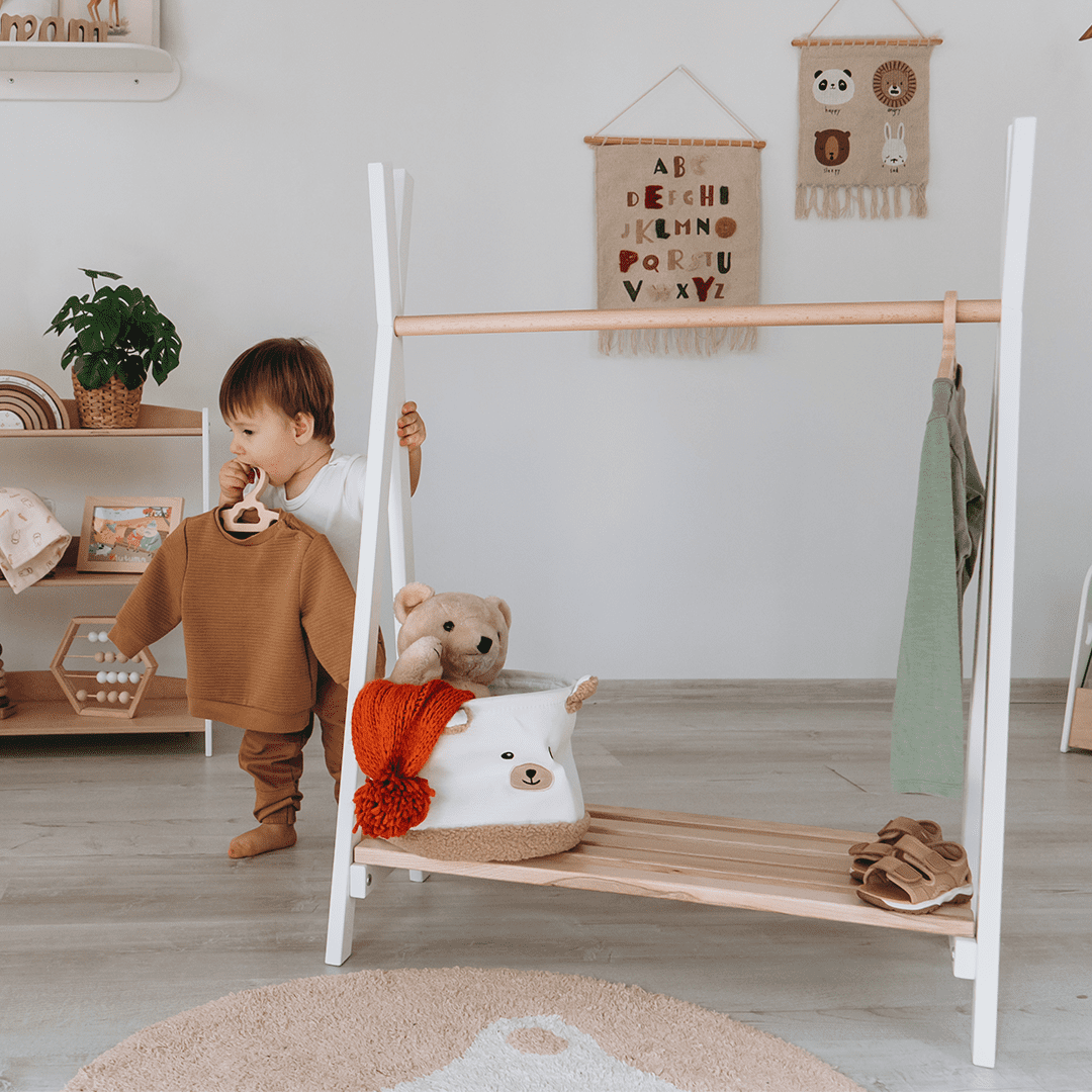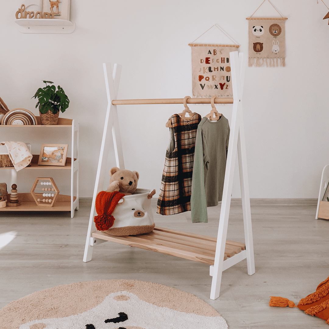 WoodandHearts Teepee Stand, Montessori Clothes Rack for Toddlers, White and Natural wood