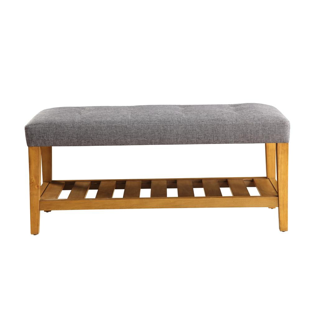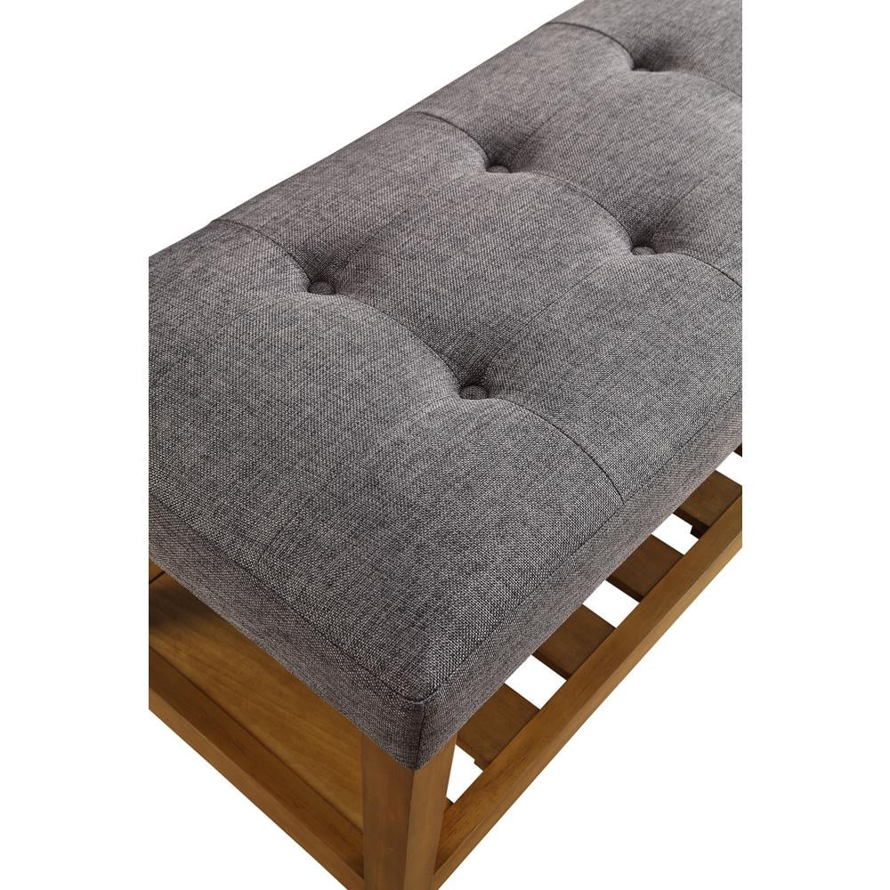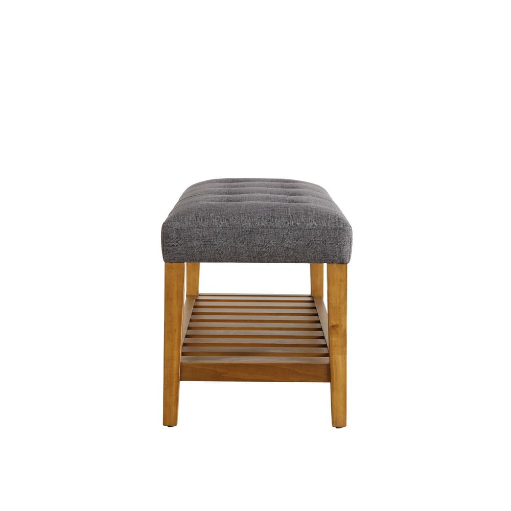 Open Storage: Slatted shelf Tufted and padded seat cushion Polyester fabric cushion Wooden tapered legs and shelf Wood frame Optional Colors