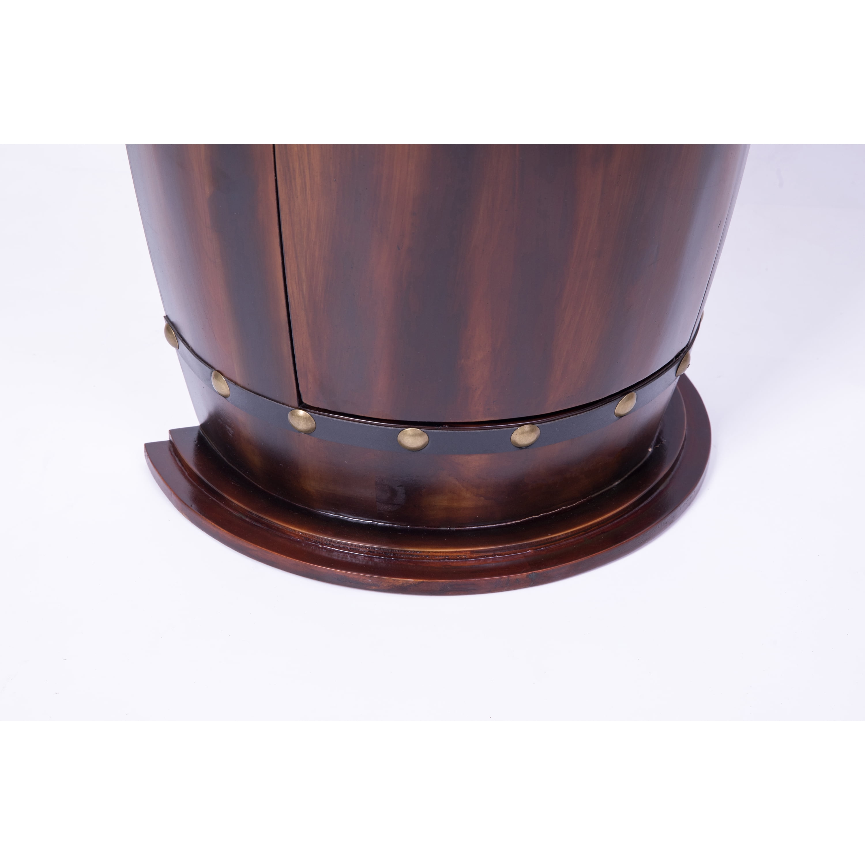 Wooden Wine Barrel Console Bar End Table Lockable Cabinet Size: 11.75 W x 23.5 D x 29.5 H In. Beautiful wood finish Cabinet for storage protection with latch 2 interior shelves provide ample storage room Rustic home bar addition This wooden barrel-shaped wine rack console end table will add a final touch to your dining room or wine cellar. Designed to be used in living space as well as storage areas, it provides convenient and practical storage as well as classic elegant style. Freestanding design keeps the bar table steady and your wine collection secure. Use it to store wines or liqueur in the cabinet or display glasses on the top. For bonus protection, the cabinet is secured with a lockable latch.