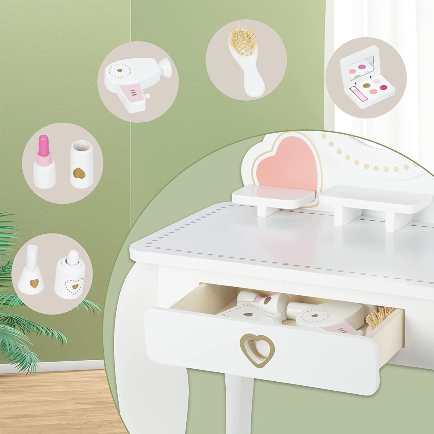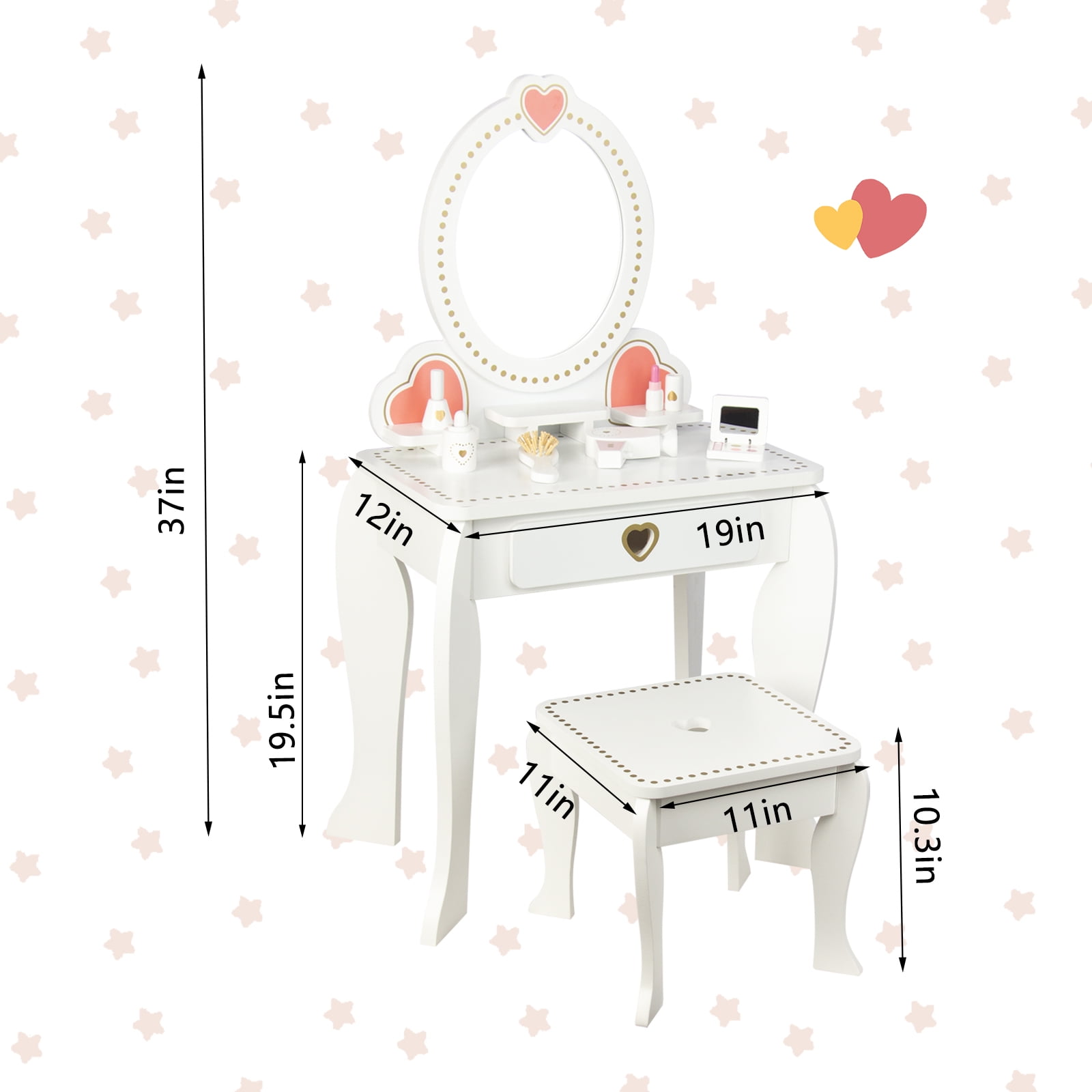 WoodenEdu Kids Vanity Set with Mirror and Stool, Beauty Makeup Vanity Table and Chair Set,White
