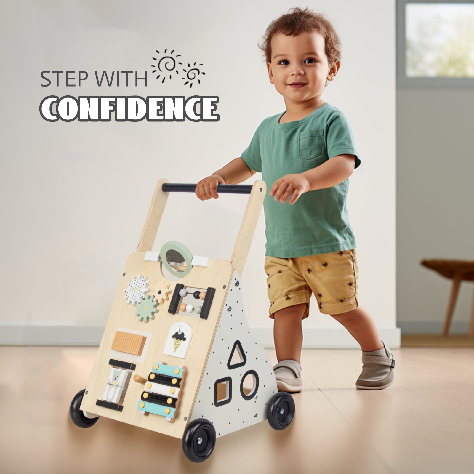 Wooden Baby Walker Push and Pull Learning Activity Walker Develops Motor Skills & Stimulates Creativity Push and pull walker comes with Xylophone,mirror,shapes puzzle,beads,gears,and much more keep Baby entertained. Various activities to stimulate baby’s senses. Made of premium quality birch plywood,Non-slip rubber bands allow the child to brake slowly, without danger. Pefect size for toddlers. It is not only a walker but an early education toy. Get more fun on the basis of allowing baby to build confidence and balance as they learn to walk.