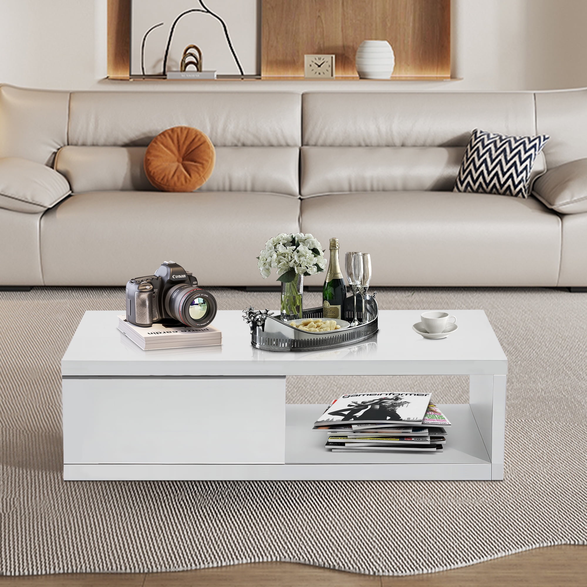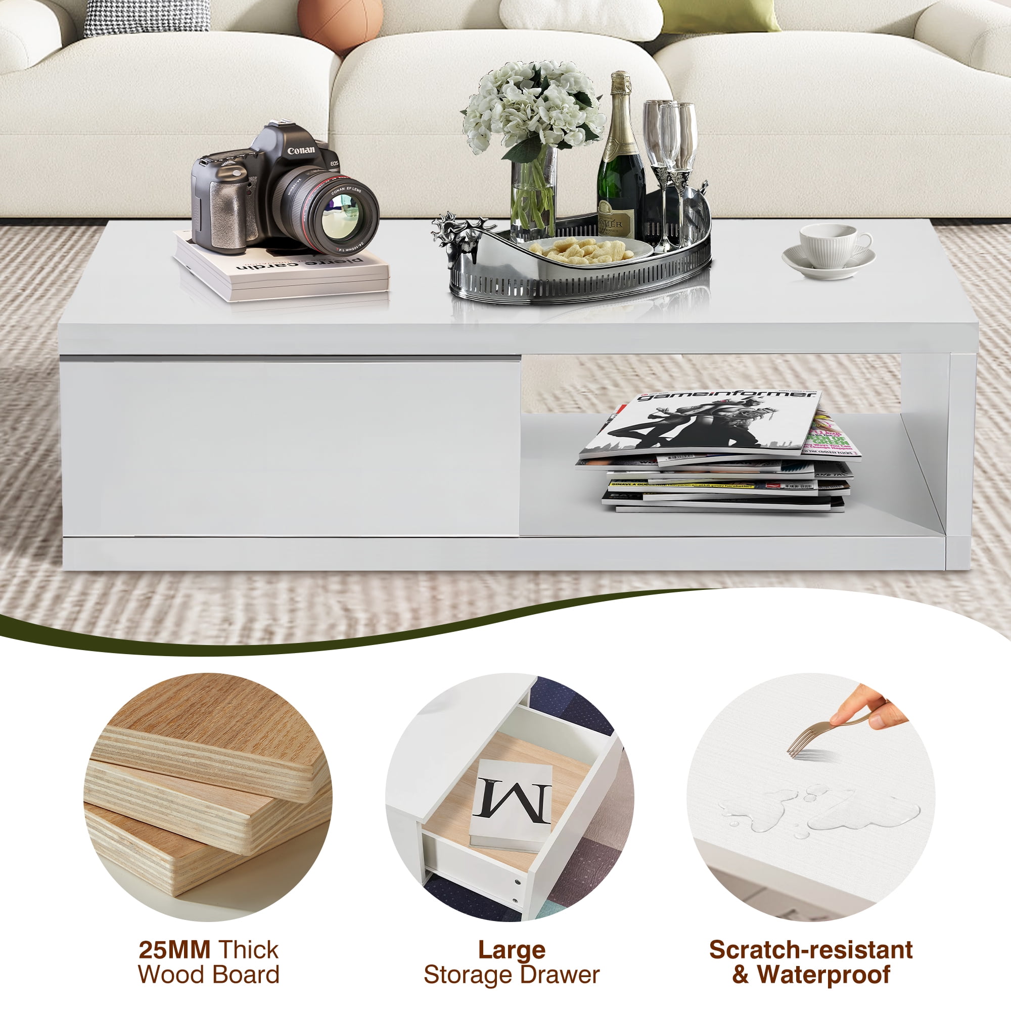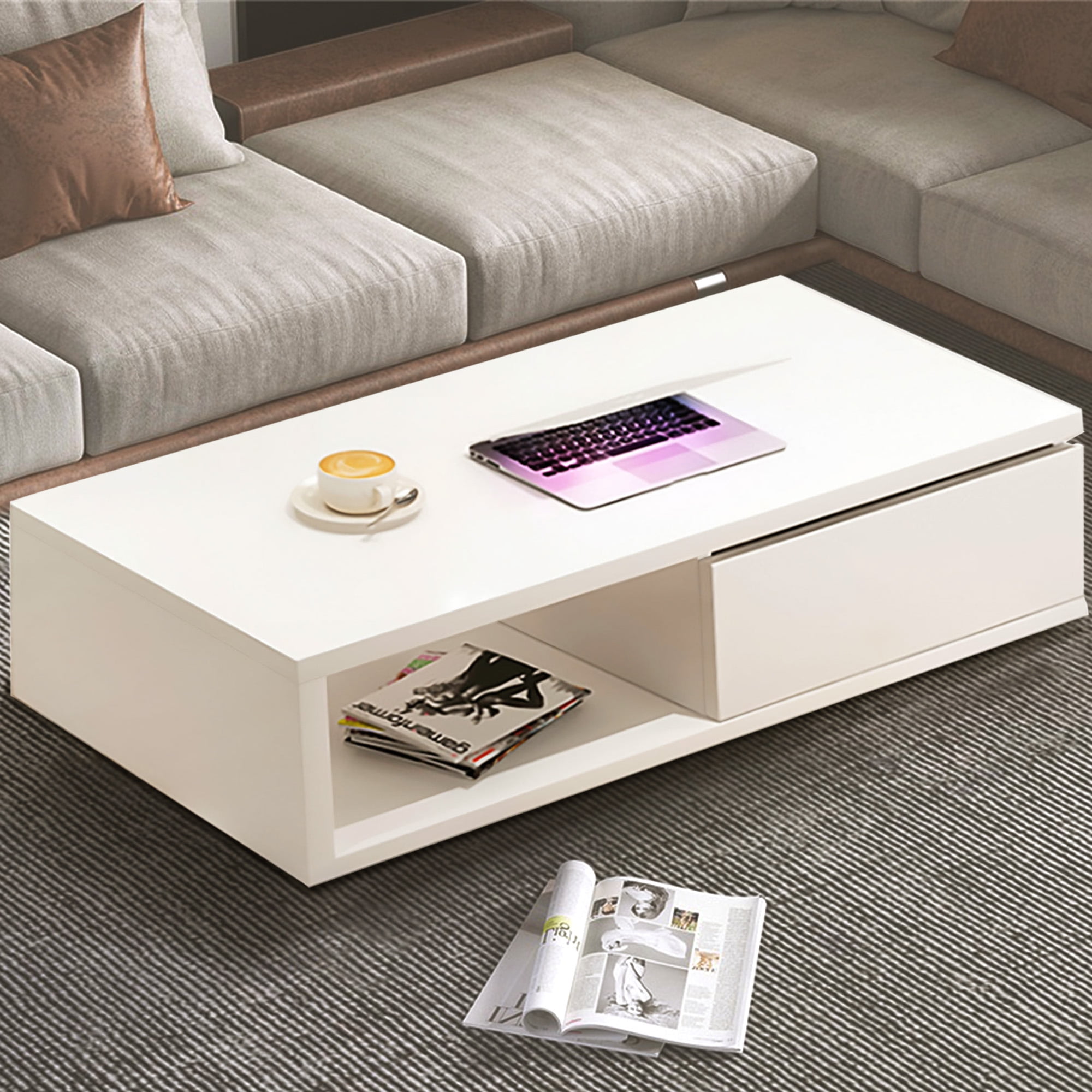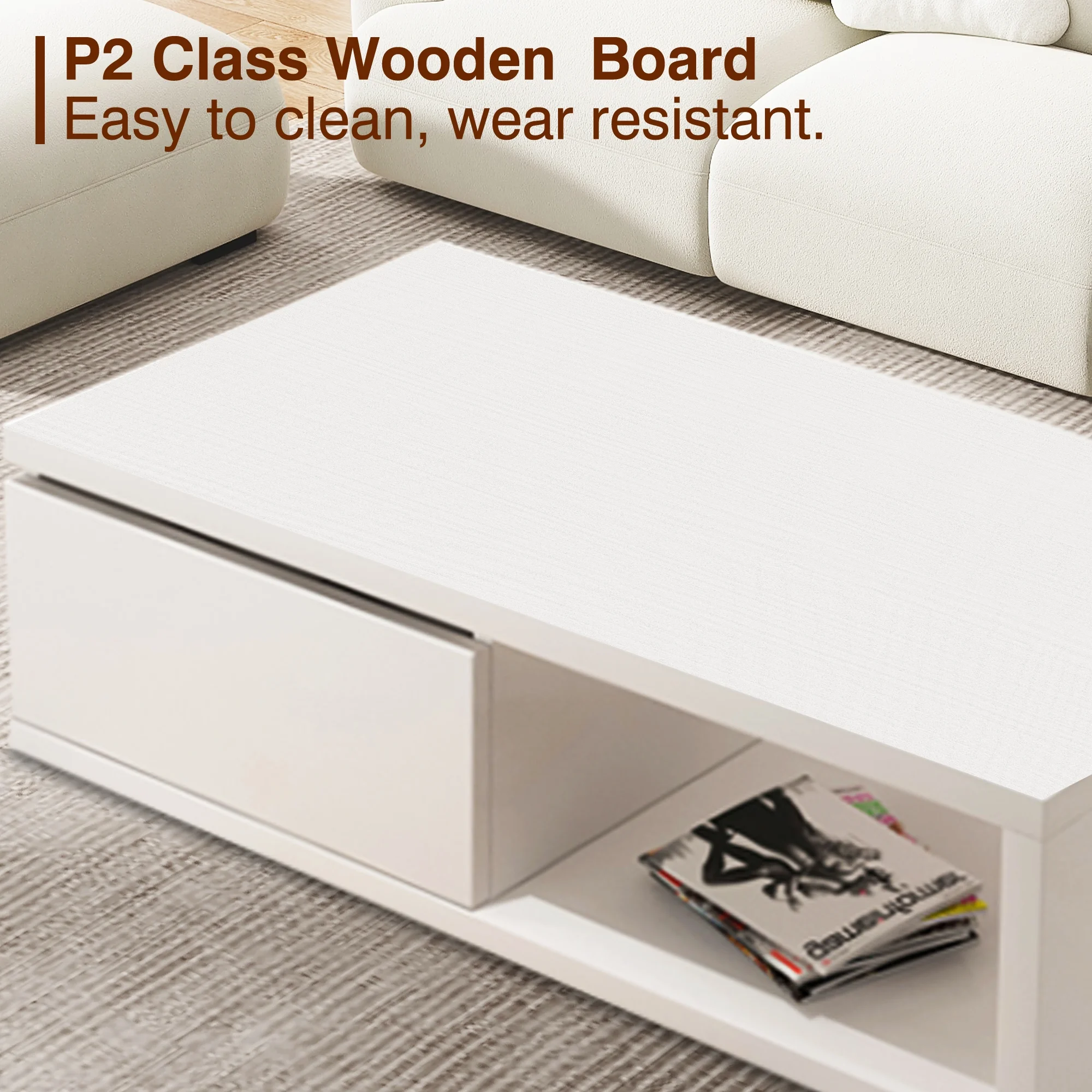 One warm and elegant style coffee table Handcrafted meticulously with wood for long lasting durability Open design cube shape gives a striking and modern appeal Offers a spacious tabletop for serving snacks and beverages Enriched with aesthetically pleasing wood grain and knot details One bottom shelf for placing decorations hand curated collections or books Easy pull-out mechanism to take the item in or out effortlessly. And the drawer provide ample space to keep smaller items organized and within reach. White matte finish radiates a farmhouse appeal Solid Construction: Designed to support up to 300 lbs, this coffee table features durable materials and robust table legs for long-lasting reliability. Easy Assembly: Pre-installed rails in the drawers make assembly quick and easy. Plus, the clear instruction manual included in the package ensures a hassle-free setup process. Color: White