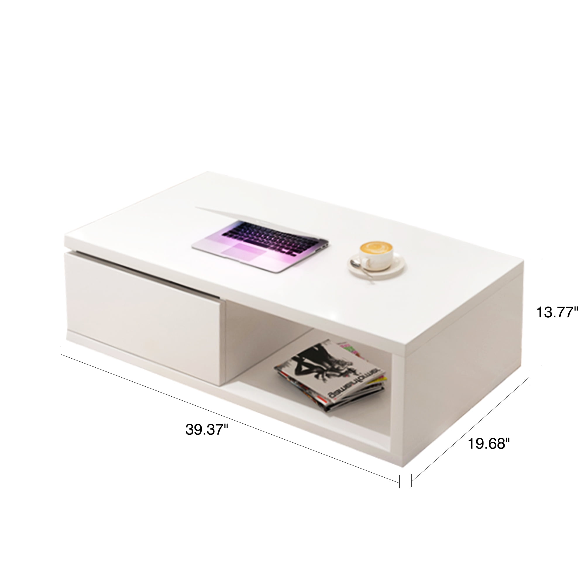 WoodFX Modern Wood Coffee Table with Storage Drawer and Open Cube for Living Room, White Finish
