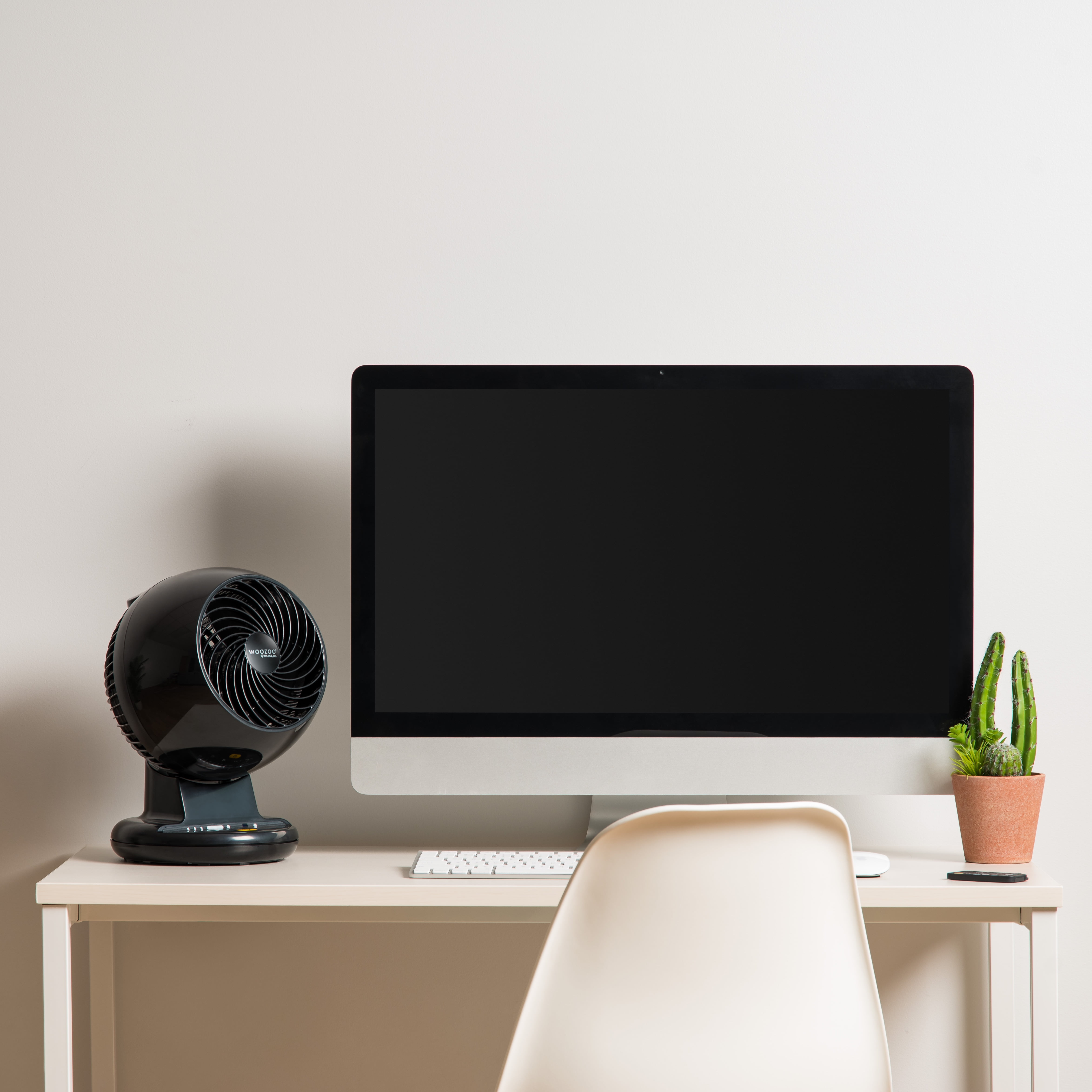 Remote controlled desktop fan offers plenty of cooling power while compact size saves space Oscillates left, right, up, and down so you can direct airflow anywhere you want it Three speed and natural breeze settings on tabletop circulator to meet your cooling needs Auto-off timer settings let the corded desk fan shut off after 1, 2, or 4 hours Dimensions: 8.66″L x 7.99″W x 11.93″H Cord length: 70.9” Fan blade diameter: 5.5″