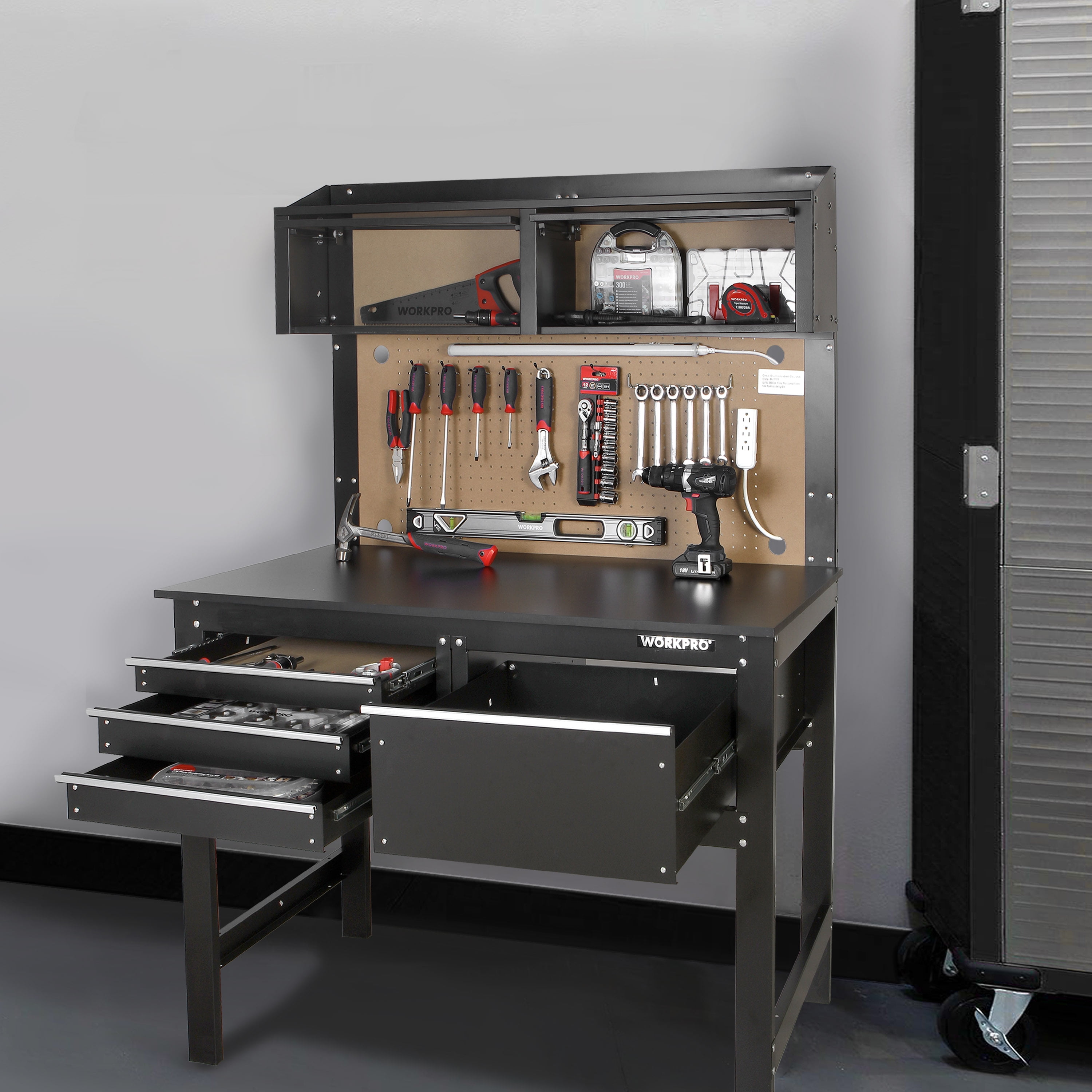 Handle the Heavy Load of Tool Storage. All-Steel Frame Rust-Resistant Surface Power Strip Attached to the Workbench WORKPRO 5W Work light Included Can hold up to 558 lbs. 4 Drawers and 2 Cabinets for Extra Storage Peg Board Backer for Various Peg Board Accessories Great for a Garage or Workshop