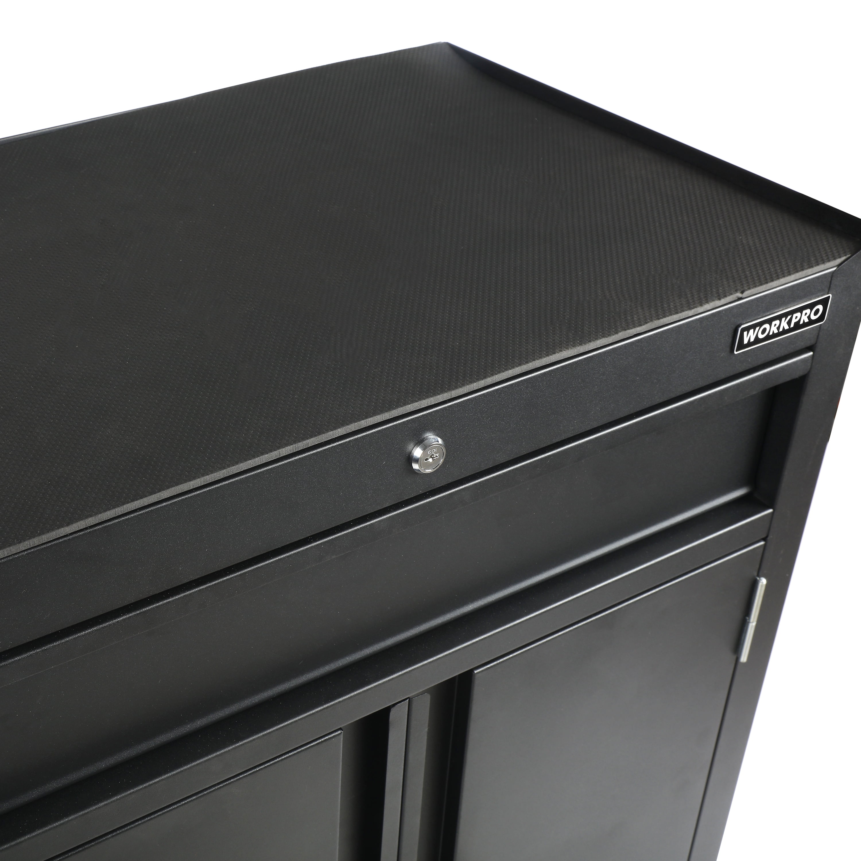 Get the storage and security you need with the WORKPRO 28-Inch Garage Storage Base Floor Cabinet. The heavy-duty rolling floor cabinet has 4-inch casters that easily move the loaded down base cabinet from one job to the next, two if them include locks so you can secure the cabinet at each job site. The top surface also includes a shelf liner so you can confidently use this area as a mobile work surface. Featured in this garage base cabinet are sliding ball bearing drawers for smooth closing and opening with a drawer liner to support and organize your tools. Giving you the security of a safe, this lockable two door cabinet also features an adjustable shelf that has a 60 lbs. weight capacity. Two keys are included with this base cabinet to secure the lockable cabinet and drawer. This rolling base cabinet will help store your tools and stay organized while you get the job done. Dimensions with Casters: 28 in. Width x 37 in. Height x 18 in. Depth
