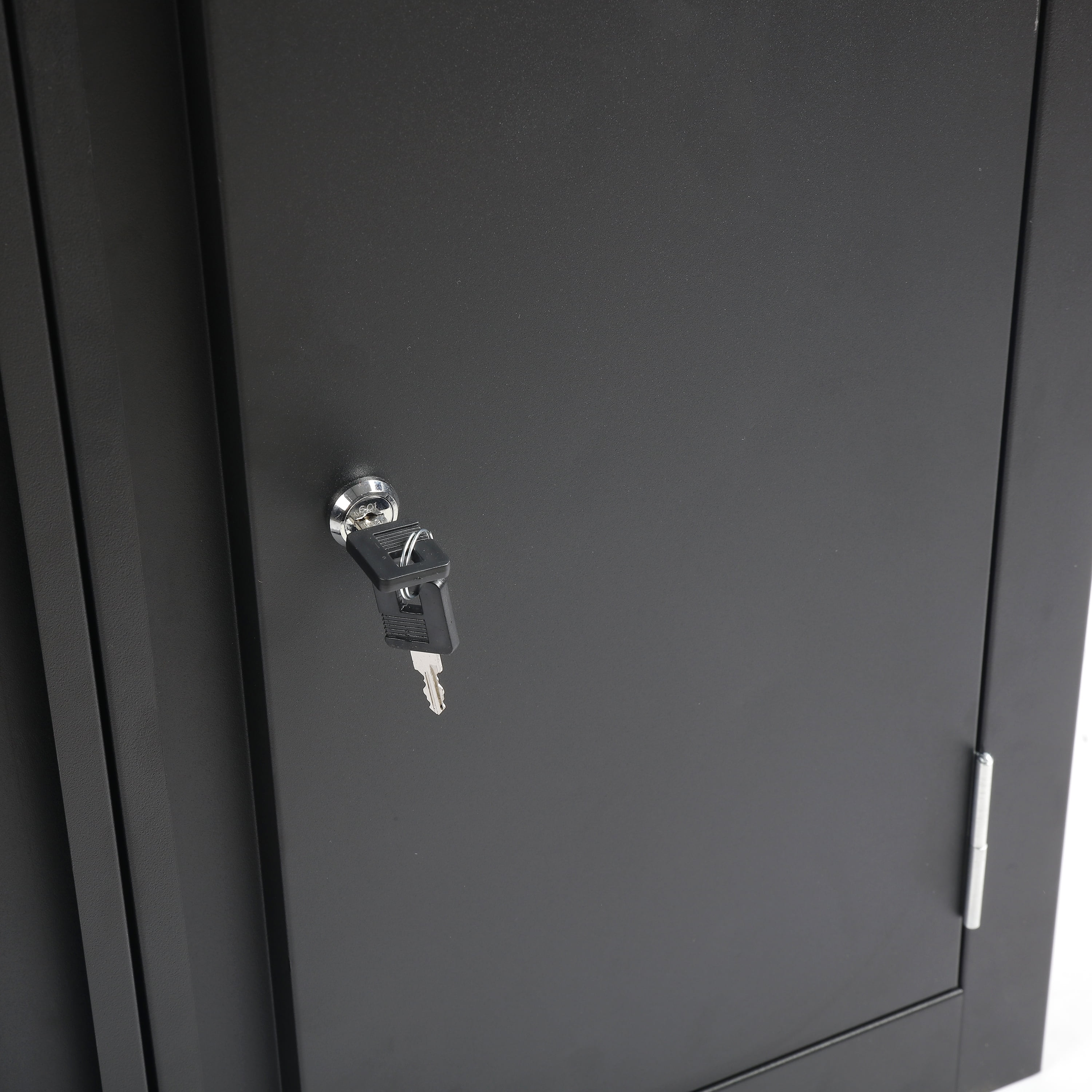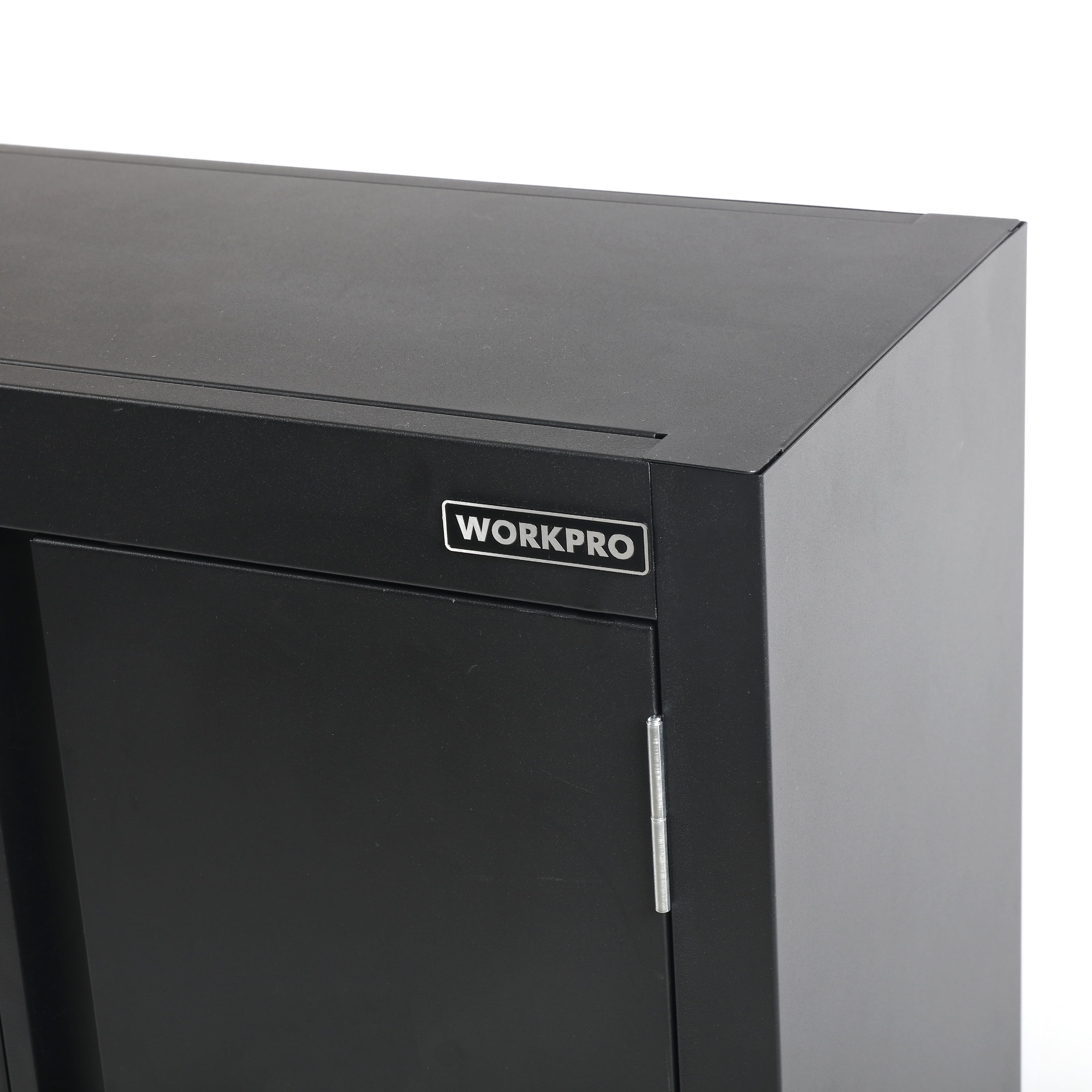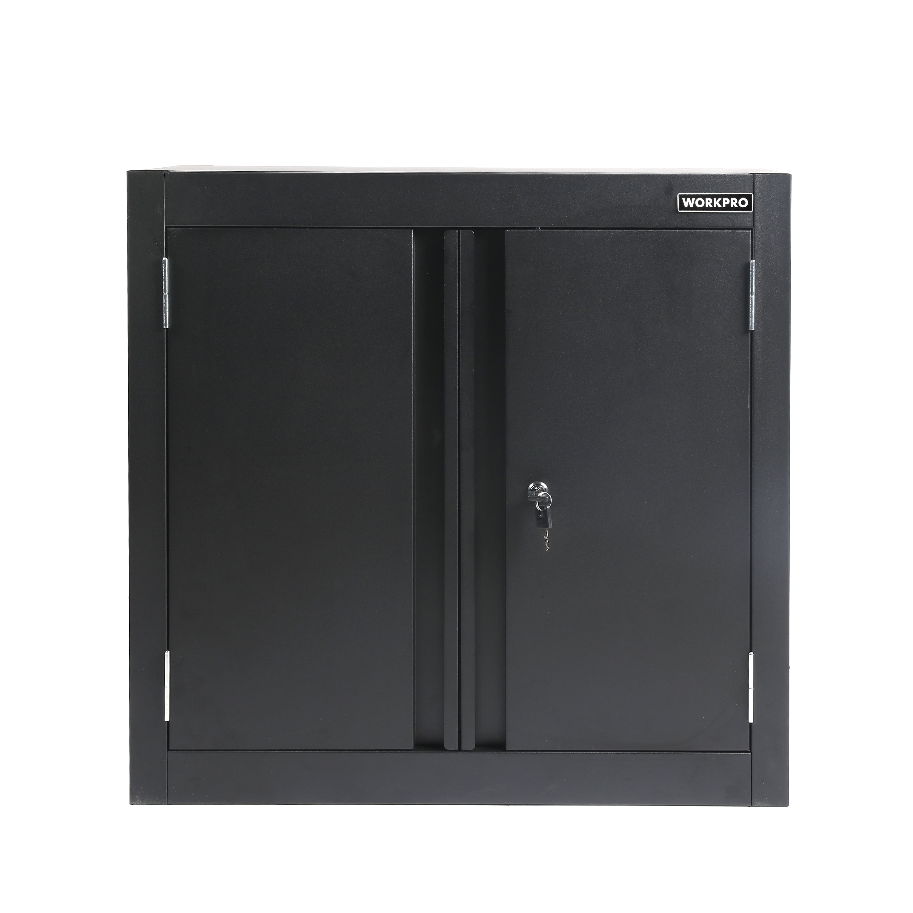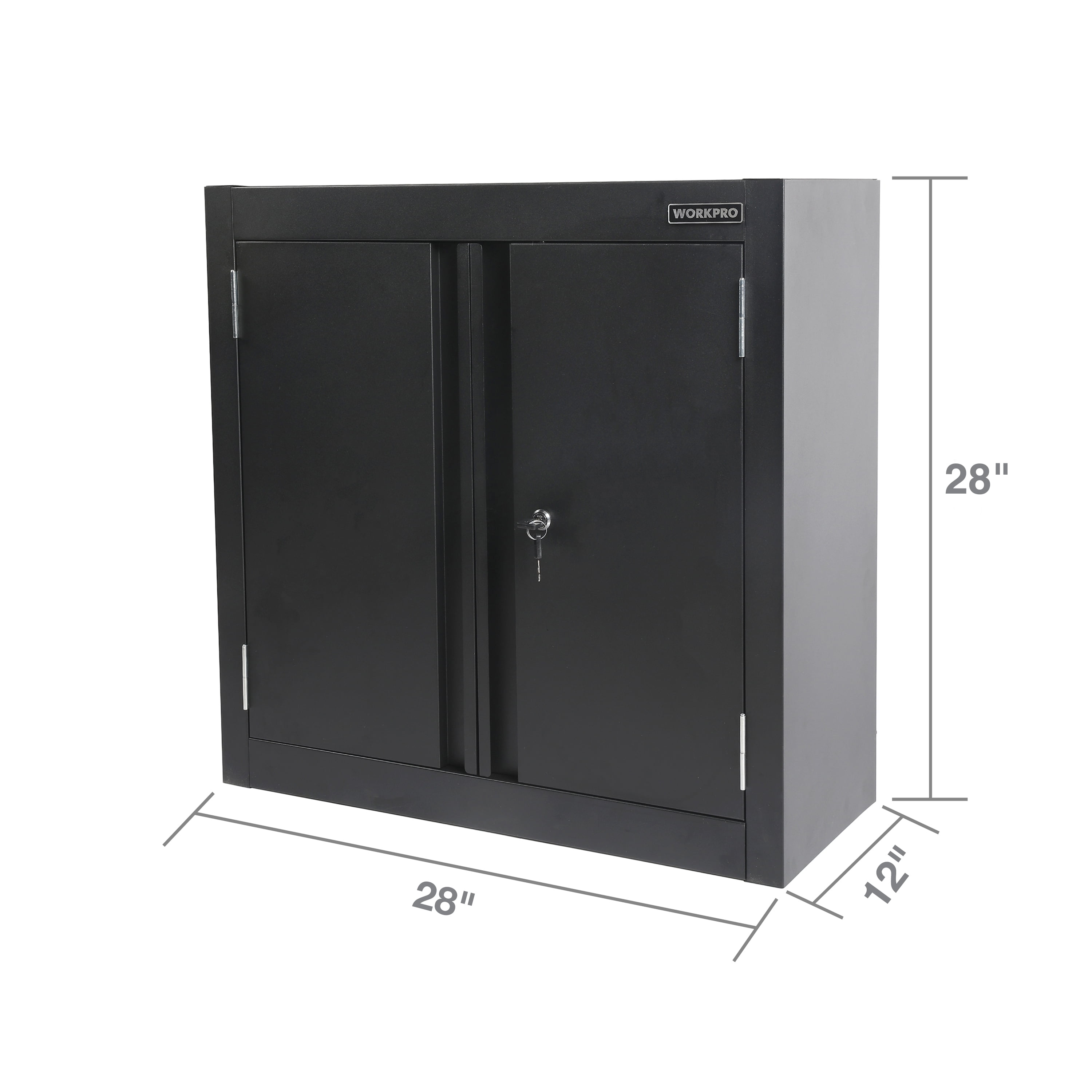 This WORKPRO 28-inch wall garage storage cabinet, 1 shelf, black, metal occupies minimal space, making it suitable for not only your garage or workshop, but laundry rooms, mudrooms, craft stations, and more to expand your organization options. Easily mount this wall cabinet to any wall and add it to your storage space. Equipped with a 2-point locking system for added security and two keys, you can store your tools, sporting equipment, and other valuables confidently. Magnetic closure strips are included on the cabinet doors to help keep them closed. This hanging wall cabinet includes one shelf that supports up to 80 lbs. Of even weight. The heavy-duty powder coat finish adds durability to the cabinet and strength to stand up against the elements of the garage.