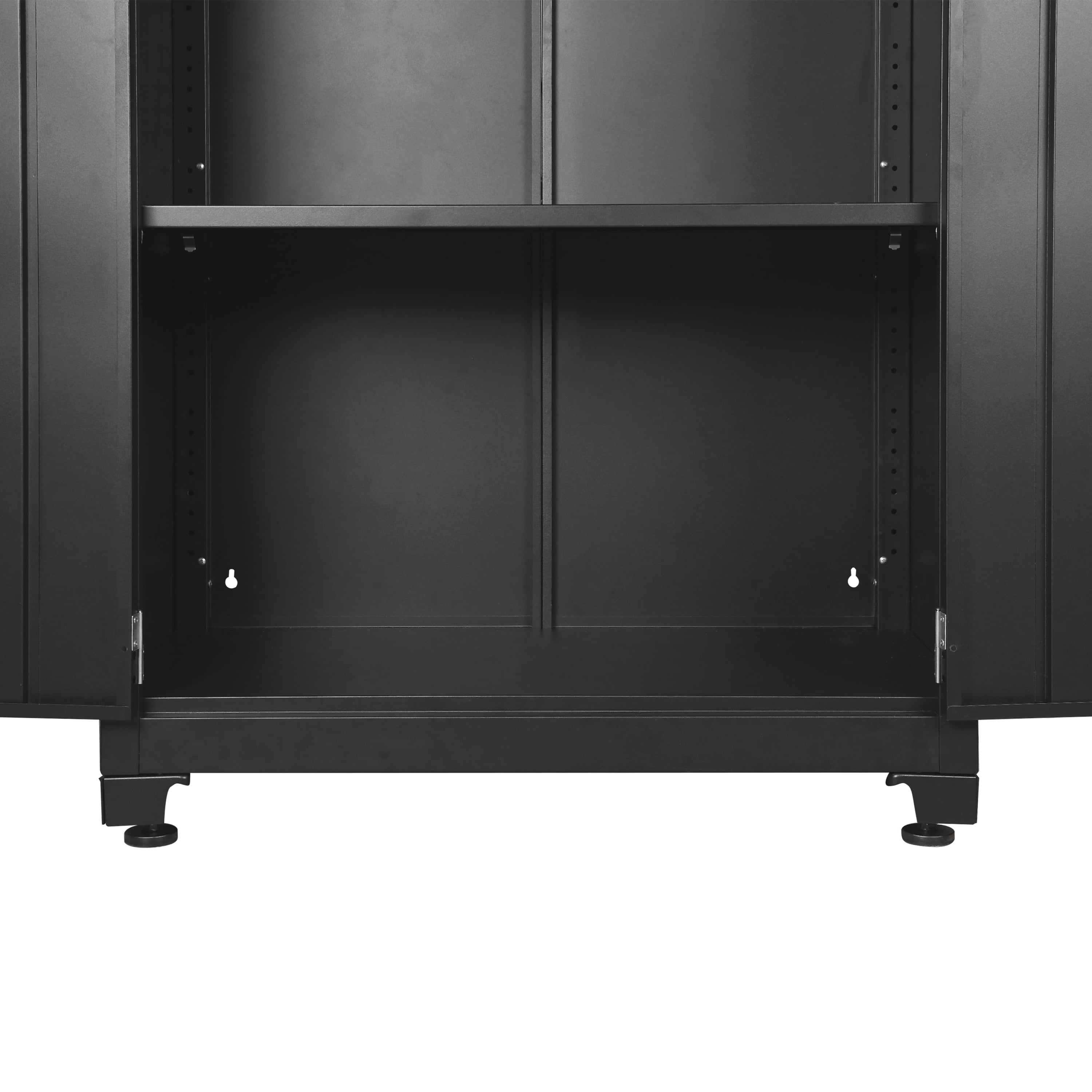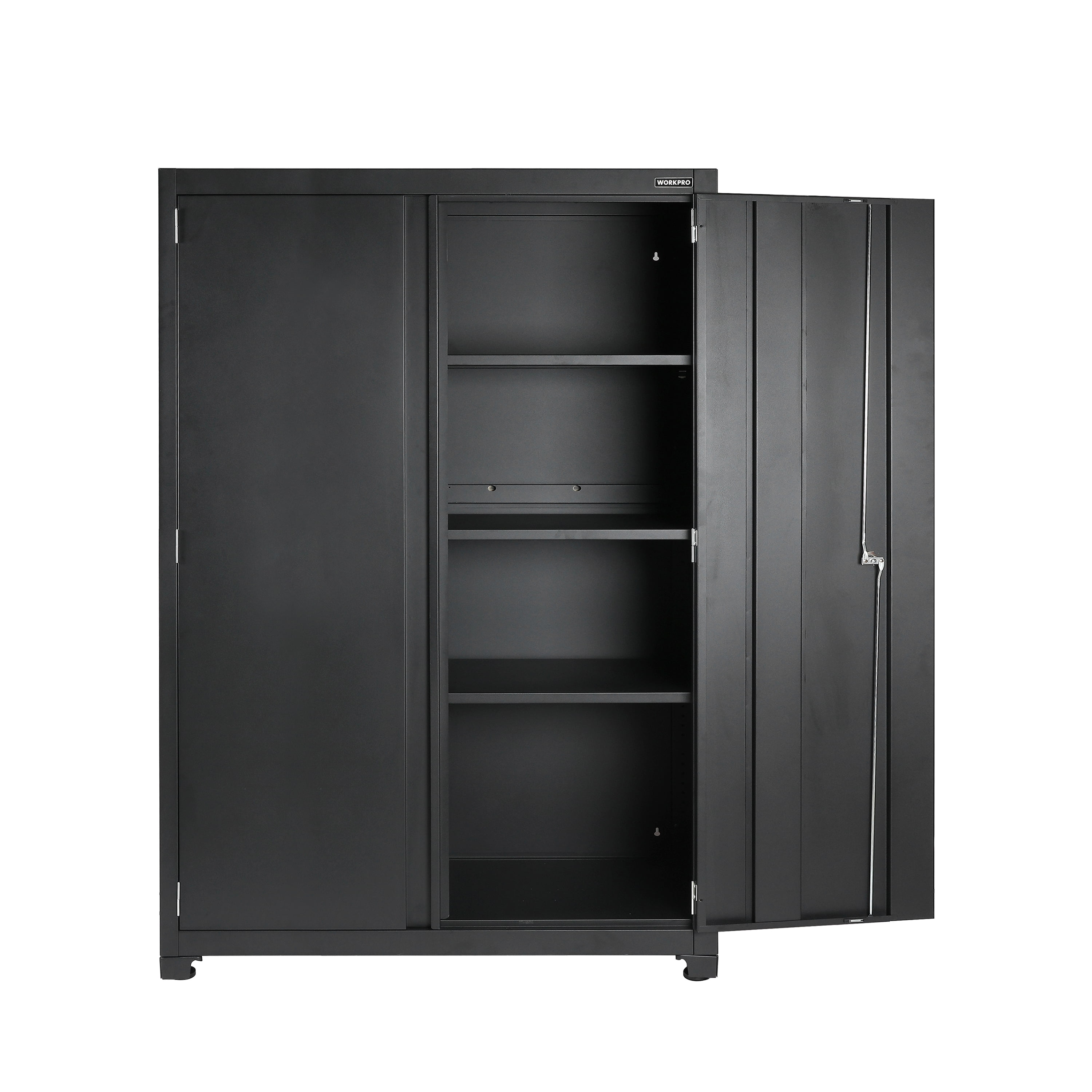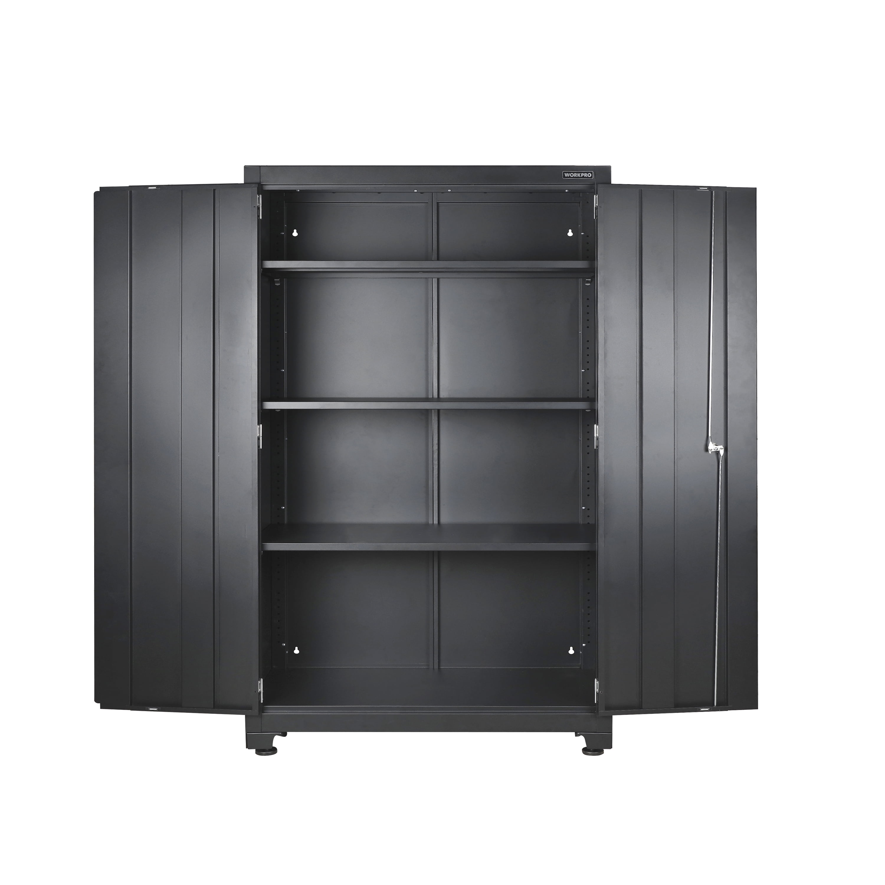 WORKPRO 48-inch Heavy-Duty Garage Storage Cabinet, 3 Shelves, Black, Metal Heavy-Duty Metal Garage Storage Cabinet Powder-Coated Steel Adjustable Feet for Uneven Surfaces 2-Point Locking System with 2 Keys 3 Adjustable Shelves Shelf Weight Capacity: 150 lbs. Each Total Weight Capacity: 600 lbs. Dimensions: 48 in. W x 72 in. H x 18 in. D Color: Black Finish: Black, Powder Coated