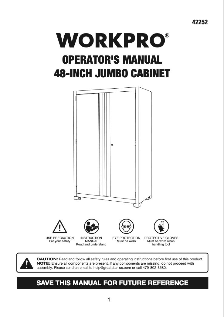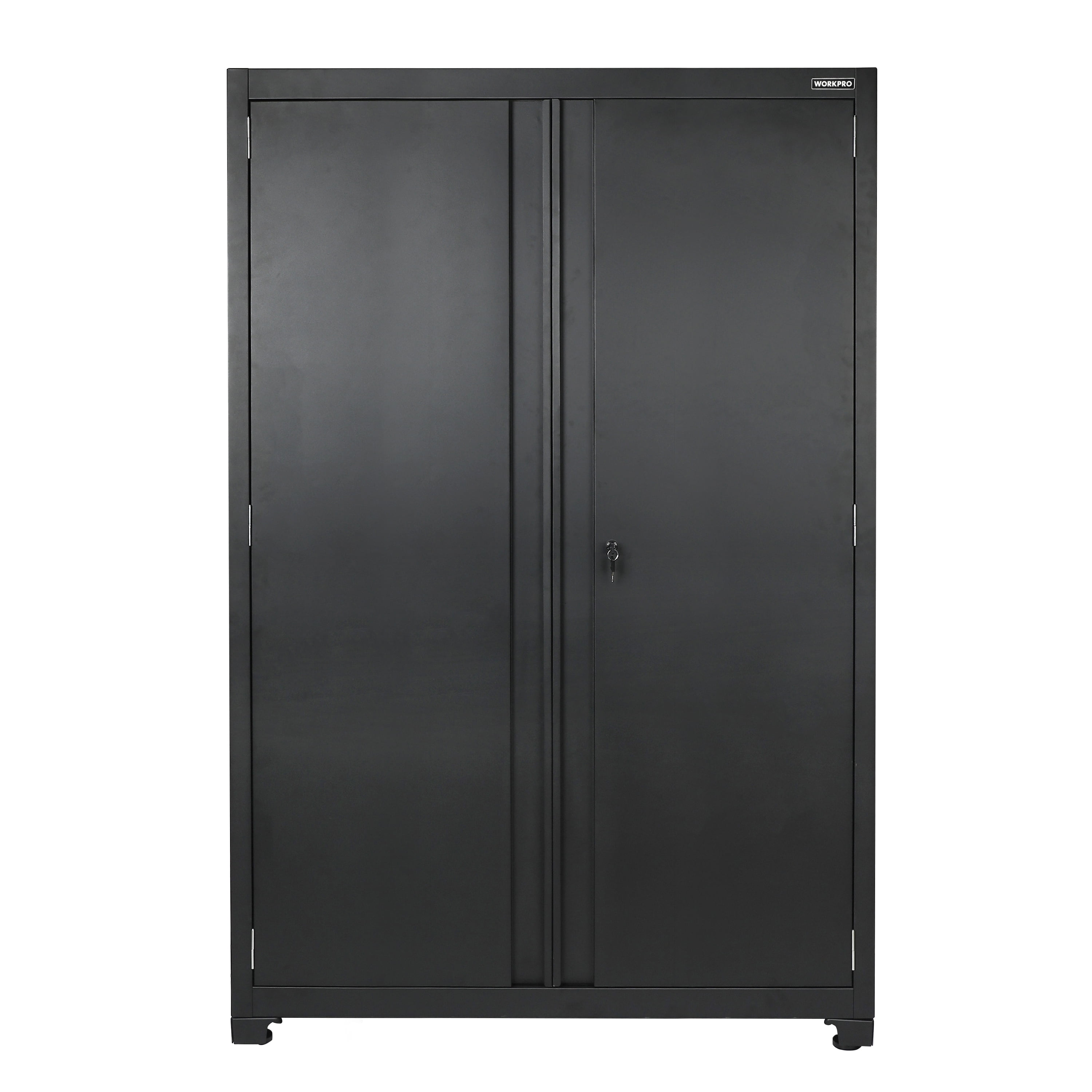 The WORKPRO 48-Inch Heavy-Duty Garage Storage Metal Cabinet is the perfect solution for keeping tools, equipment and other supplies organized. This cabinet has a total capacity of 600 lbs. Each of the three adjustable shelves and cabinet base have a weight capacity of 150 lbs. The cabinet doors are equipped with magnetic top and bottom plates that hold the doors shut. The doors also feature a 2-point security lock for added security, so you can feel confident in storing your valuables. The cabinet also features adjustable feet for leveling on uneven surfaces. The WORKPRO cabinet is constructed with heavy-duty steel and has a durable powder coat finish to withstand the endless DIY and improvement projects on your list. Free up valuable space and organize your garage with the WORKPRO 48-Inch Heavy-Duty Garage Storage Cabinet. Matching WORKPRO wall and base garage cabinets available at . Dimensions: 48 in. W x 72 in. H x 18 in. D