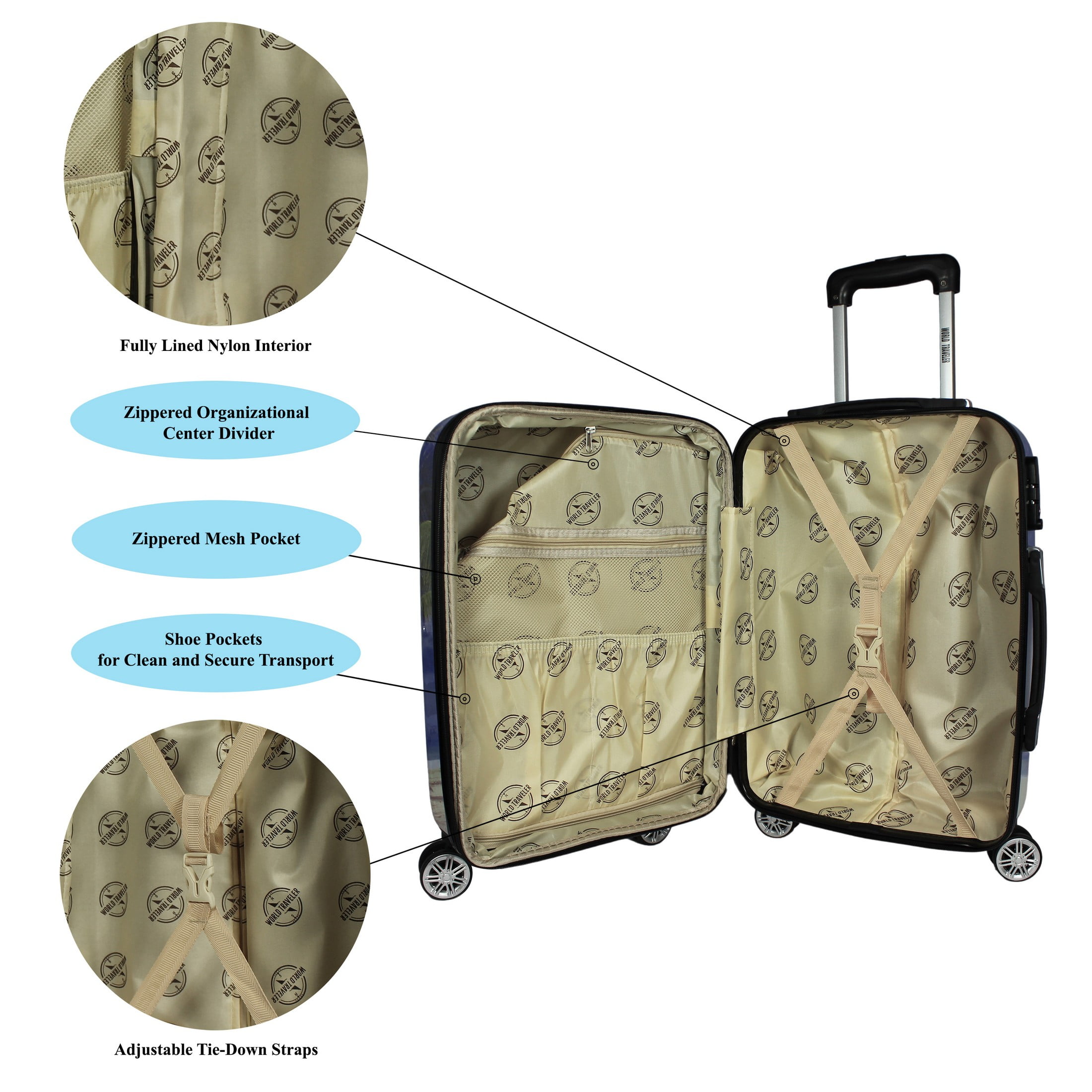 This World Traveler palm tree hardside 2-Piece Carry-On Spinner luggage set is made of impact resistant Polycarbonate and features a shoulder tote bag, built-in 3-digit combination lock, four(4) spinner wheels, a retractable telescopic handle, top and side grip handles, and a fully lined interior with zipper divider and compression straps.