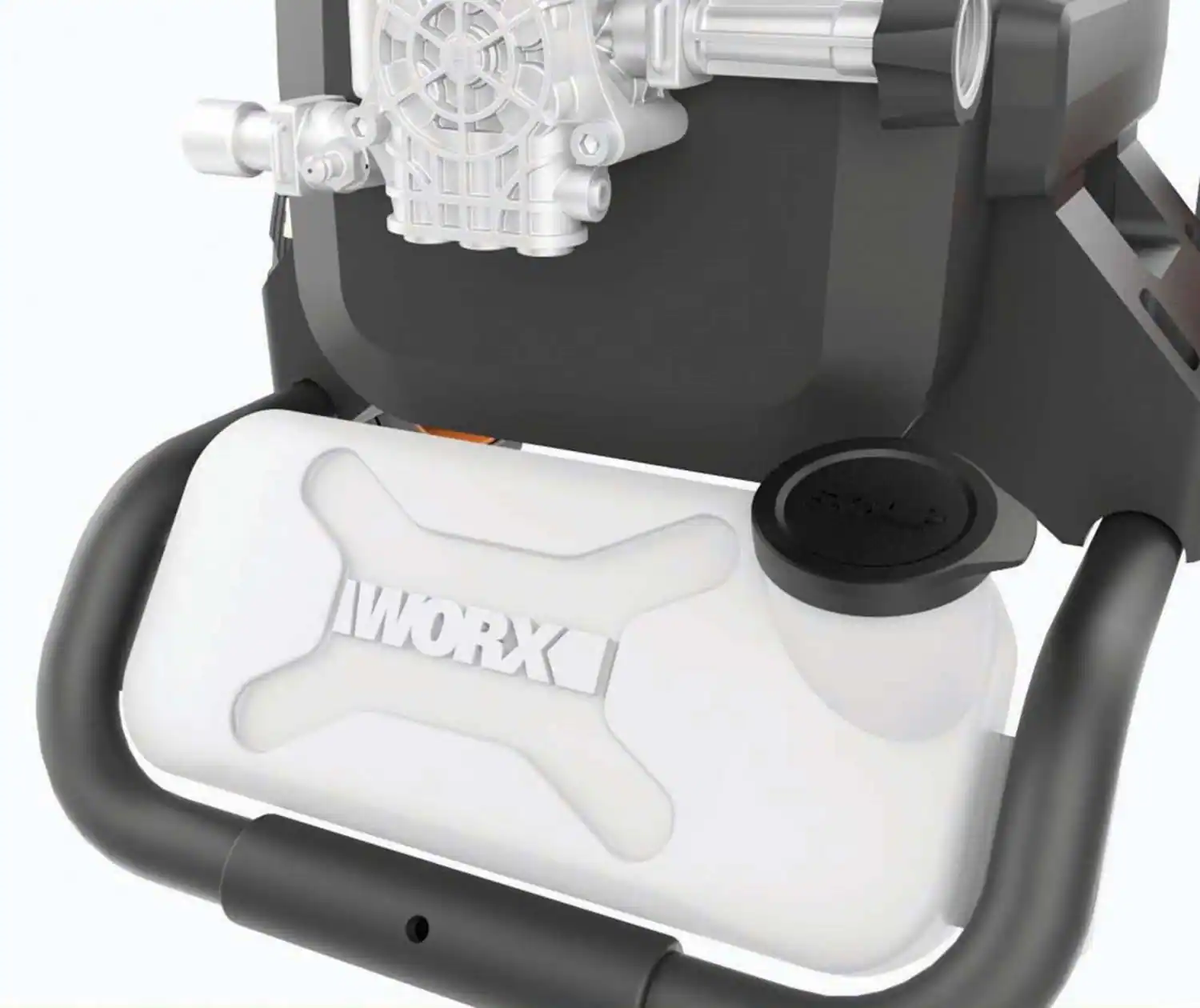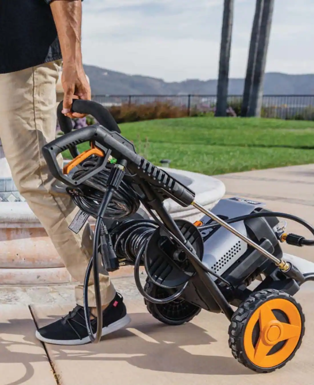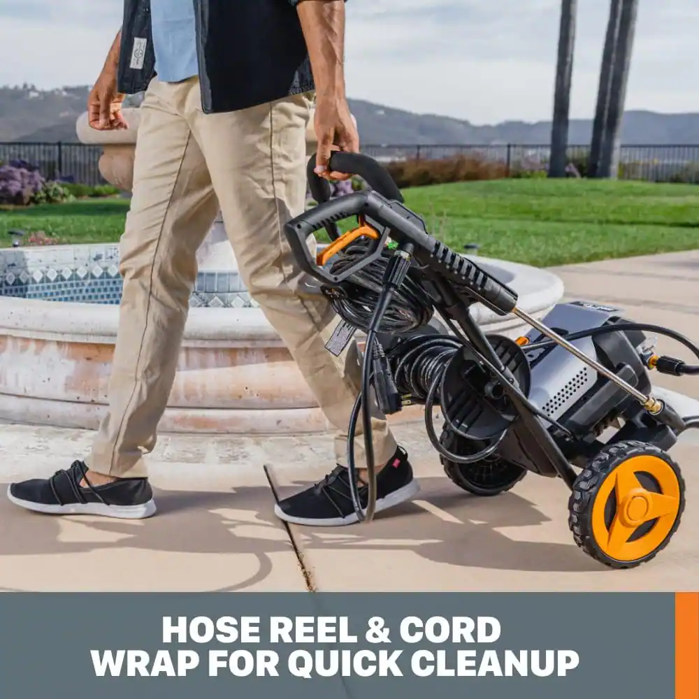 The Worx 13-Amp Electric 2200 PSI Pressure Washer generates enormous cleaning power for dirt and grime removal around the exterior of the home or property. It produces 2000 PSI (2200 PSI MAX) and 1.2 GPM (1.4 GPM MAX) to make quick work of cleaning the driveway, deck, siding, or brickwork. It’s also a great tool for blasting mud out of outdoor camping or sporting equipment or for muddy cars and SUVs. And the onboard soap tank and included soap nozzle allow you to add detergent right into the stream for the dirtiest applications. This pressure washer also comes with a turbo nozzle, when you need maximum pressure, say, for brickwork, and 40-degrees and 25-degrees nozzles for when you need a lighter touch. Plus, the universal ¼ in. quick-connect adapter makes switching between nozzles a breeze. But the best part about this pressure washer may be that it’s easy to use. Not only does it have a pair of rugged wheels to make it quicker to cart around, even over rough terrain, almost anyone can handle all this power. The Worx Electric 2200 PSI Pressure Washer won’t knock you over while still delivering a mighty force of water, thanks to its powerful 13-Amp commercial-grade brushless induction motor. And when you’re finished pressure washing for the day, onboard storage for the nozzle and wand and the hose reel & cord-wrap make cleanup quick and easy.
