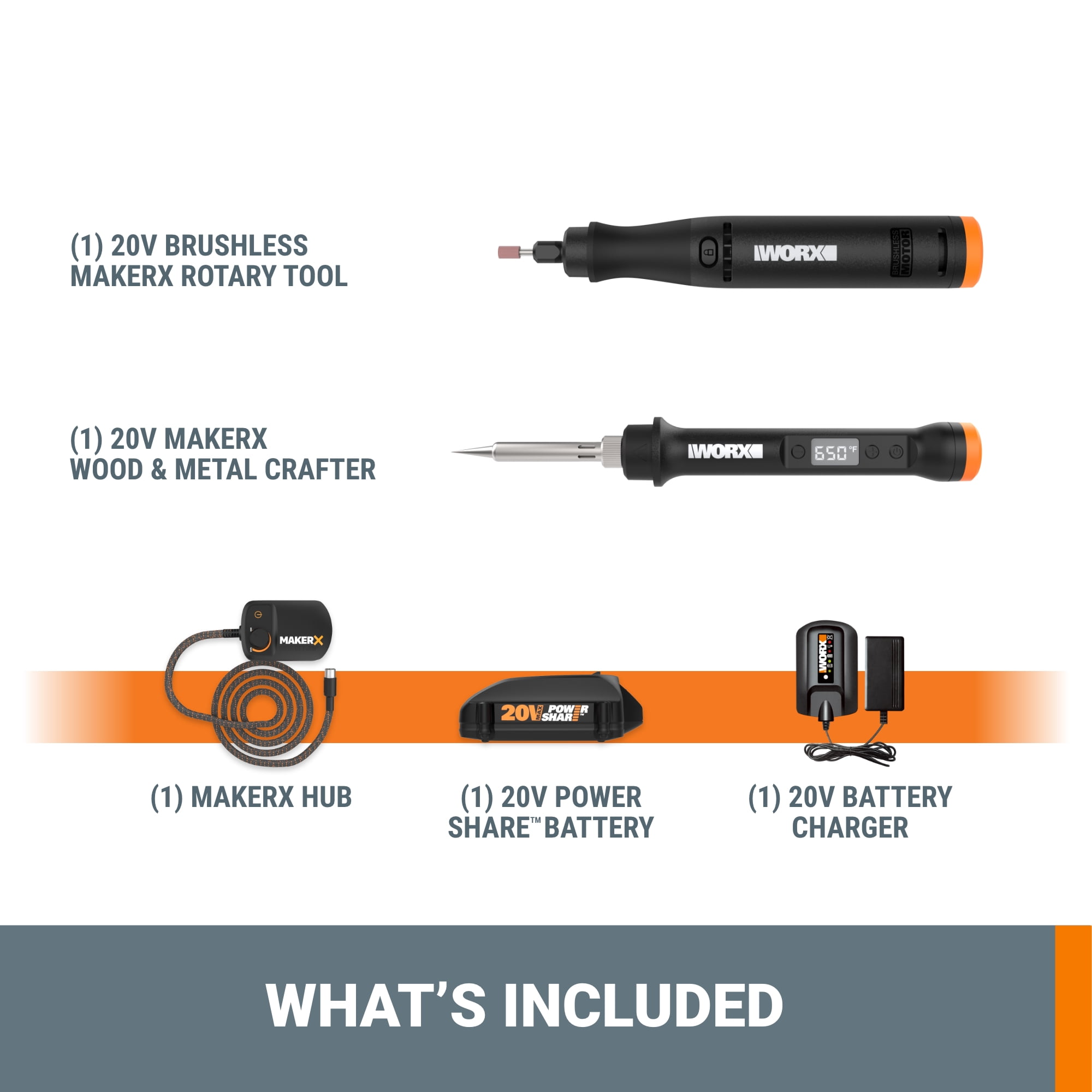 UNIVERSAL FIT – The Rotary Tool accepts standard bits of all brands. So, you can pop over to your local hardware store whenever you need a replacement. But this kit comes with the most common accessories to get you started COMPACT BRUSHLESS MOTOR – Rotary tools powered by brushless motors run longer on a single battery charge and dole out more power while they work SAME BATTERY, EXPANDABLE POWER – The same battery powers over 75+ 20V, 40V, and 80V lifestyle, garden, and power tools in the Power Share family QUICK HEAT UP – Nearly instant 30-second target heat. The Wood & Metal Crafter burns as hot as a full-size iron, but in a size that’s much easier to use for detail work 53 ACCESSORIES INCLUDED – All the Rotary Tool bits and all the Wood & Metal Crafter interchangeable tips you need to get started MICRO-ERGONOMIC DESIGN – All MAKERX tools are specially designed to be compact, so they’re more comfortable to hold for long stretches, and are easier to maneuver HUB + FLEX CORD – Every tool on the MAKERX platform is powered by the Hub and its rechargeable 20V Power Share battery—both of which are included in this kit. The Hub is the only portable 20V power system for hobby and crafting tools on the market