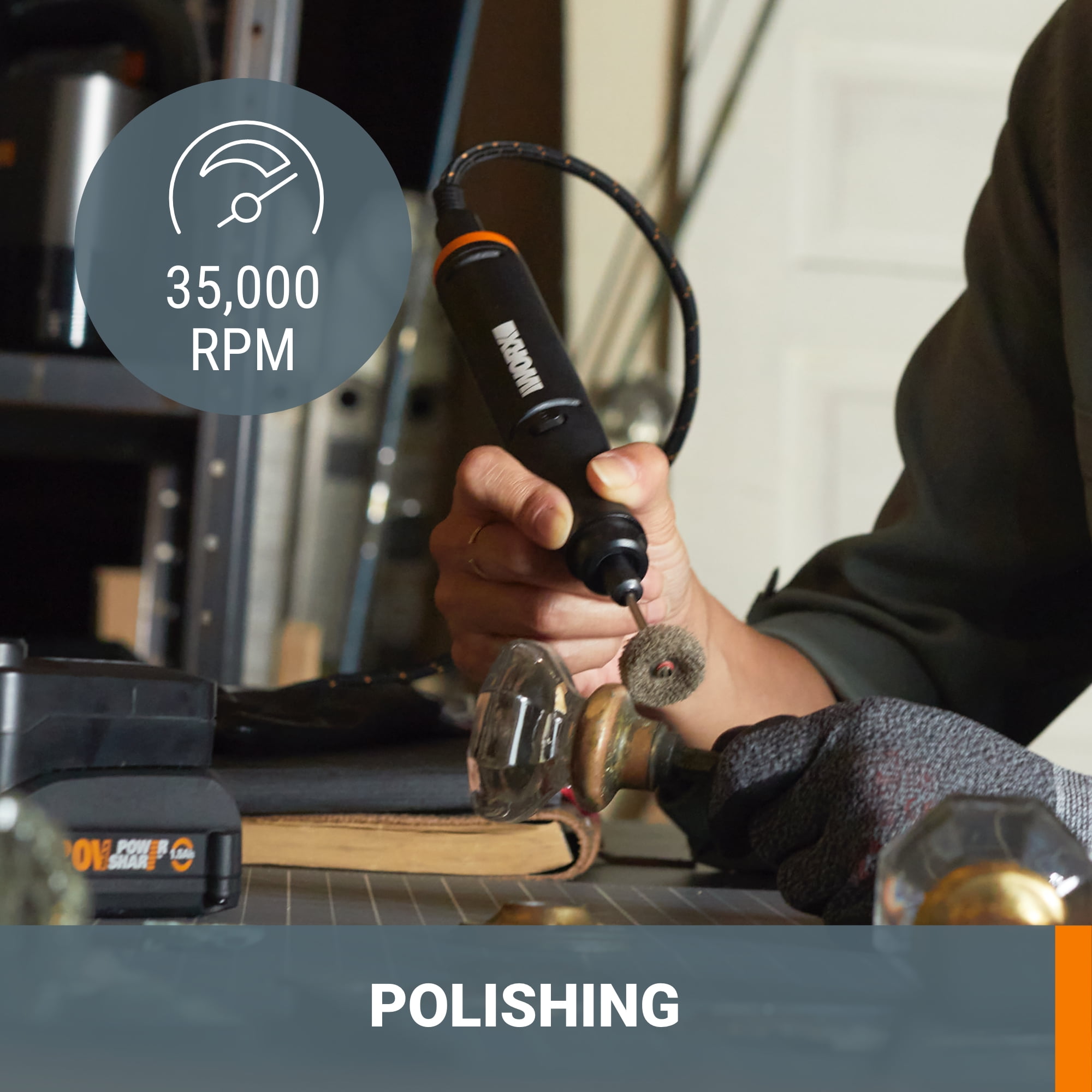 Small by design, still packed with power. The Worx MakerX Rotary Tool with Brushless Motor fits nicely in your hand. And without an onboard battery pack, it’s lighter, so you can work longer without feeling the fatigue in your arms or shoulders. Yet, with a brushless motor you still get more than enough power to engrave and etch, grind and sand, cut, polish, and clean. The variable speed control lets you pick just the right amount of juice for the job (5,000-35,000 rpm). And it’s fitted with the common collet size of 1/8”. It can work with all standard collet sizes, so it accepts the bits and accessories of all the major brands. But this combo kit comes with loads of accessories, so you can start working right out of the box. The Worx MakerX Wood & Metal Crafter heats up to the temps of a larger, full-size pyrography and metal-working tools, but its skinny design means you can hold it like a pen and do finer work. The digital temperature control lets you precisely set the temp from 400-900 degrees Fahrenheit, so you get the heat you need depending on the task. This tool is ideal for marking wooden signs on site, embellishing leather goods, branding wooden boxes, making bracelets out of old glass or stones, customizing leather belts, jewelry making and metal crafting, pyrography, and wood-burning projects of all kinds. Plus, it excels at specialized work like repairing and splicing broken car wires or cutting and sealing synthetic rope. MakerX has created crafting and hobby tools that are smaller, but more powerful—the secret lies in the Hub. It’s a power source that you can take with your tool, so if you want to work in the middle of a large space, you can, and still have the power to get the job done. Thoughtful design allowed Worx engineers to make these tools slimmer, so you can hold them with more precision, and provide a level of detail to your projects that’s not possible with other tools.