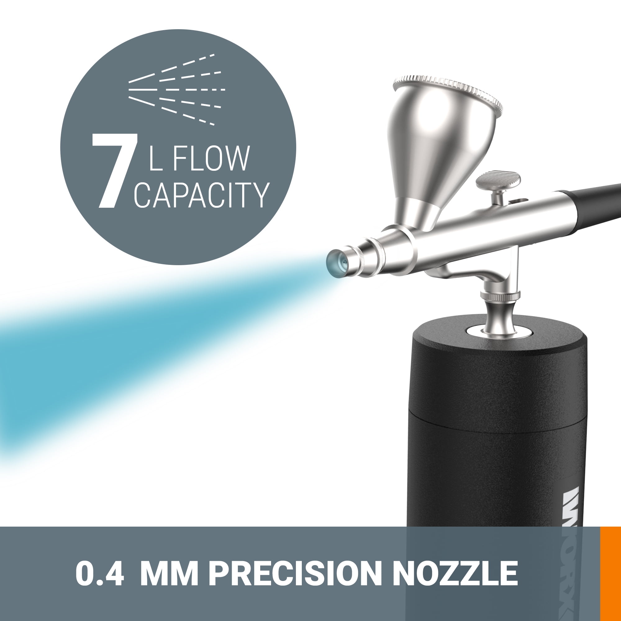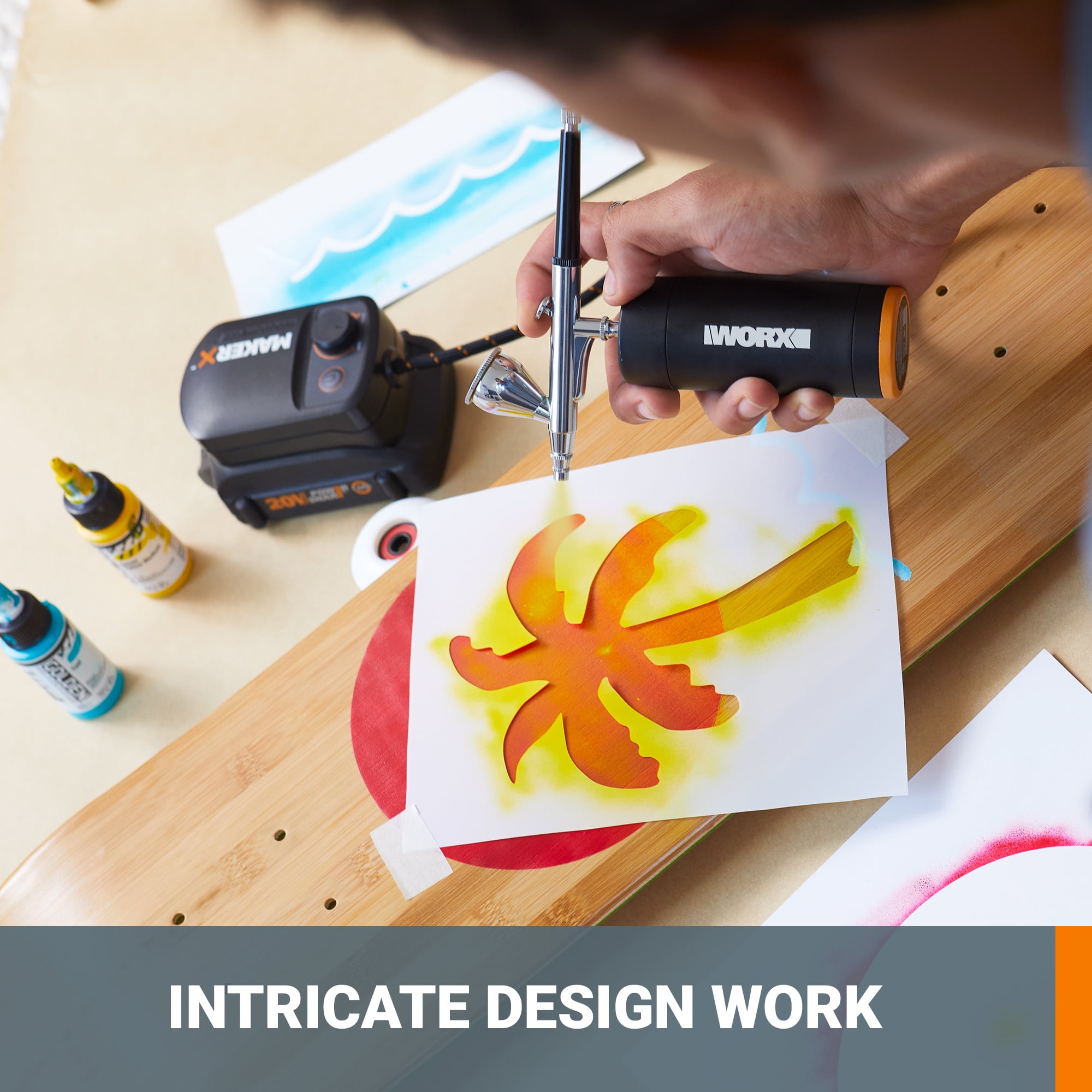 Small by design, still packed with power. The Worx MakerX Rotary Tool with Brushless Motor fits nicely in your hand. The variable speed control lets you pick just the right amount of juice for the job (5,000-35,000 rpm), which you can control right from the Hub. And it’s fitted with the common collet size of 1/8”. It can work with all standard collet sizes, so it accepts the bits and accessories of other brands. Get the MakerX Rotary Tool and start engraving glass, wood, and metal. Cut off protruding bolts, grind rust off iron rails before painting, sand children’s toys, or polish a brass nameplate while it’s still mounted. The Worx MakerX Air Brush is more nimble than other air brushes, due to its slim form factor. But because it’s backed by a 20V battery, it’s actually more powerful, and lasts longer on a single charge—it’s the only portable 20V air brush on the market, actually. There’s no need for an air compressor, it’s just your MakerX Air Brush and the Hub going where you go. With its 0.4 mm precision nozzle, it excels at fine, detailed jobs, like tiny crafts of all kinds. Its pressure rating is 14-18psi, the dual function trigger regulates both the air flow and paint volume and controls its 7 L flow capacity. MakerX has created crafting and hobby tools that are smaller, but more powerful—the secret lies in the Hub. It’s a power source that you can take with your tool, so if you want to work in the middle of a large space, you can, and still have the power to get the job done. Thoughtful design allowed Worx engineers to make these tools slimmer, so you can hold them with more precision, and provide a level of detail to your projects that’s not possible with other tools.