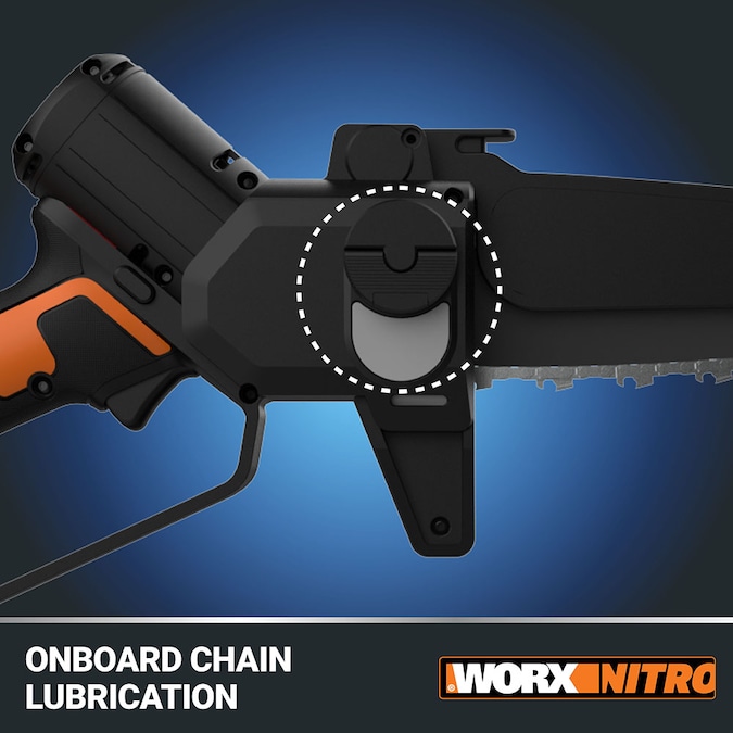 High-powered, pro-grade cutting is never a chore with the Worx Nitro 20V Brushless 5” Cordless Pruning Saw. Refined with an ultra-compact design and lightweight body profile, this pruning saw is easy and comfortable to maneuver—even during extended use or when working in tight spaces. The battery-powered cordless capability offers an extended run time that allows for truly on-the-go cutting. Rely on this impressive mobility to cut firewood at campsites, clear branches on hunting trails, trim trees on large properties, and much more. The 5” bar length is ideal for a variety of cutting tasks—including pruning, trimming, delimbing, and bucking. The high-efficiency brushless motor heightens the saw’s performance by providing 50% longer run time, 25% more power, a 10X longer life than standard brushed motors. For added convenience, the pruning saw features automatic chain-tensioning for quick and secure chain adjustments. In addition, onboard chain lubrication sustains cutting efficiency without hassle, as well as extends bar and chain life. Safety is prioritized with the retractable bar and chain guard, which retracts automatically when cutting from above. The guard can also be retracted manual when you need to undercut. Whatever the task, rely on the guarded handle design to maximize control while increasing safety and security.