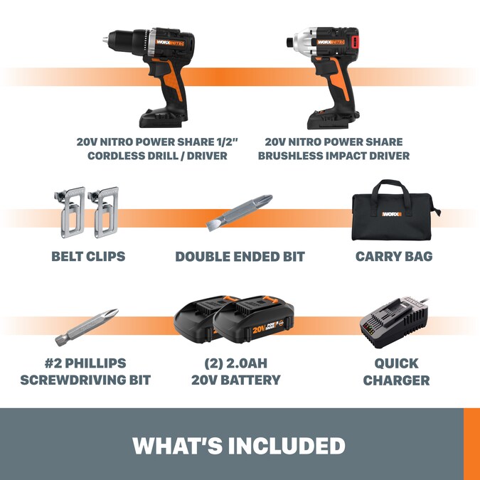 - INCLUDES – Nitro Drill/Driver, Nitro Impact Driver, (2) 20V 2Ah Batteries (WA3575), 2A charger (WA3881), belt clip, double-ended bit, #2 screwdriver bit, carry bag